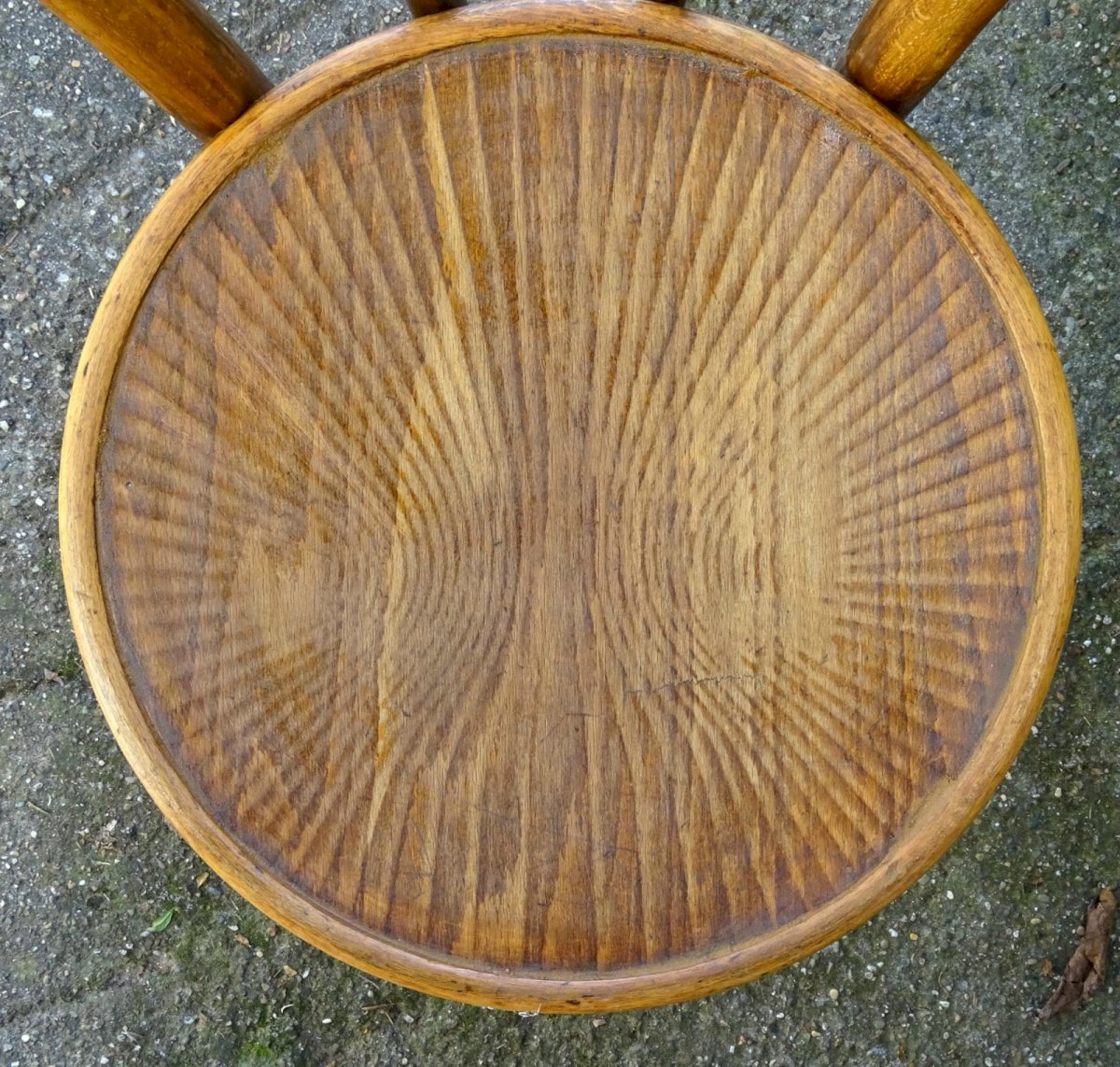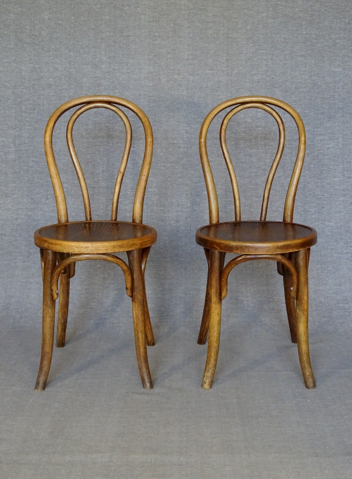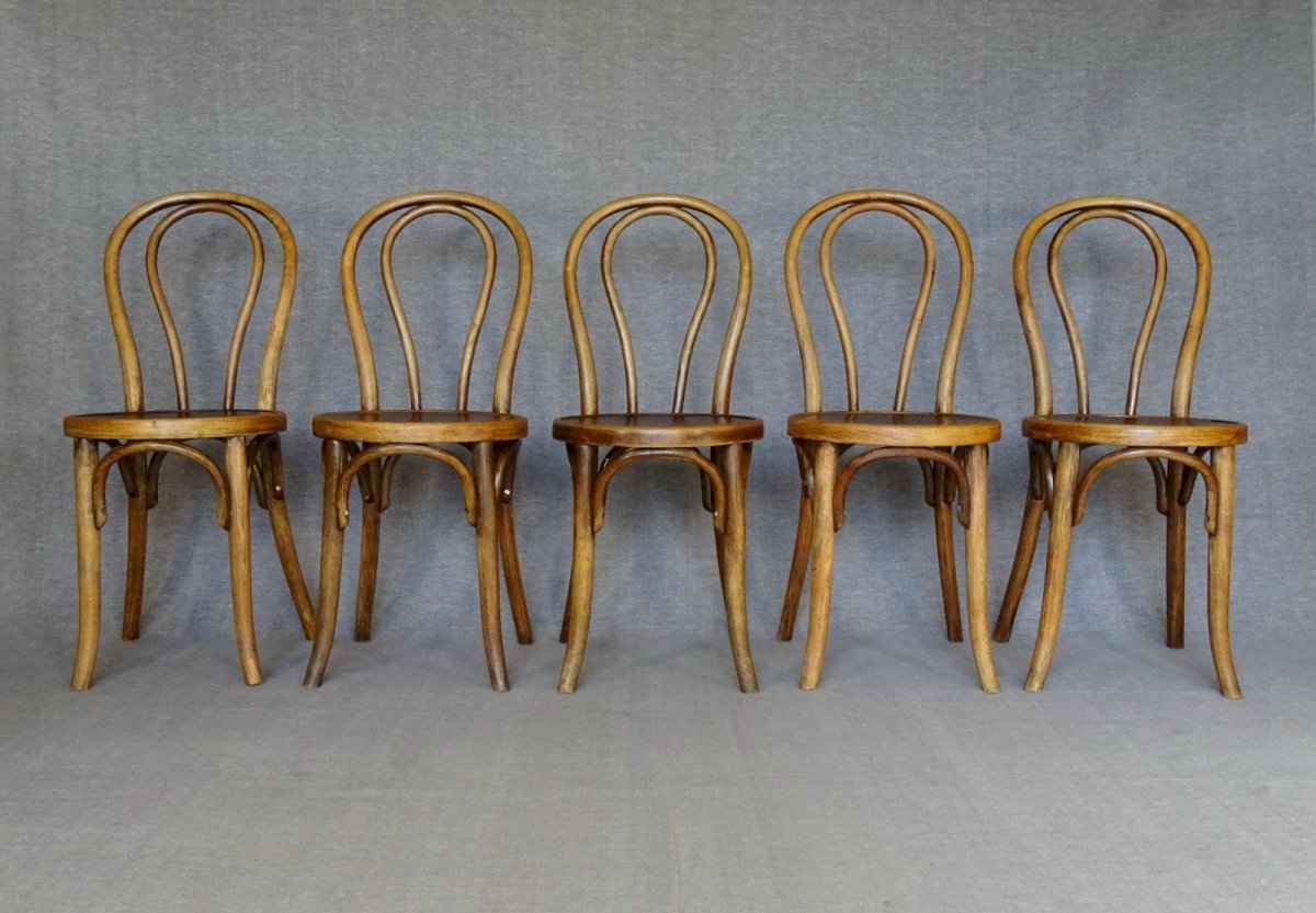 Set de 5 chaises Thonet N°18 -1/2. Avec arceaux !!! très bistrot.   Production de 1930 à 1932. Le format 1/2 (ou  Kleine Stühle / "petite chaise") apparait dès 1885 chez THONET afin d’optimiser les capacités de places assises dans les établissements publics. Les chaises de maison font 41 cm de diamètre.   Belles assises thermoformées d’origine. Hauteur d’assise : 46.5 cm- Hauteur Totale :87 cm.   Diamètre d’assise 37 cm - marquage THONET – Voir photo.. Très bon état général et belle patine noyer-moyen Plus de renseignements et photos sur demande. Transport sécurisé, France et Europe, enlèvement Alsace possible. Couleur:Marron clair Nombre de pièces:5 Type:Chaise Origine:Tschecoslovaquie Période:Design du XXème Sous-type:Bistrot Matière:Hêtre Style:bentwood