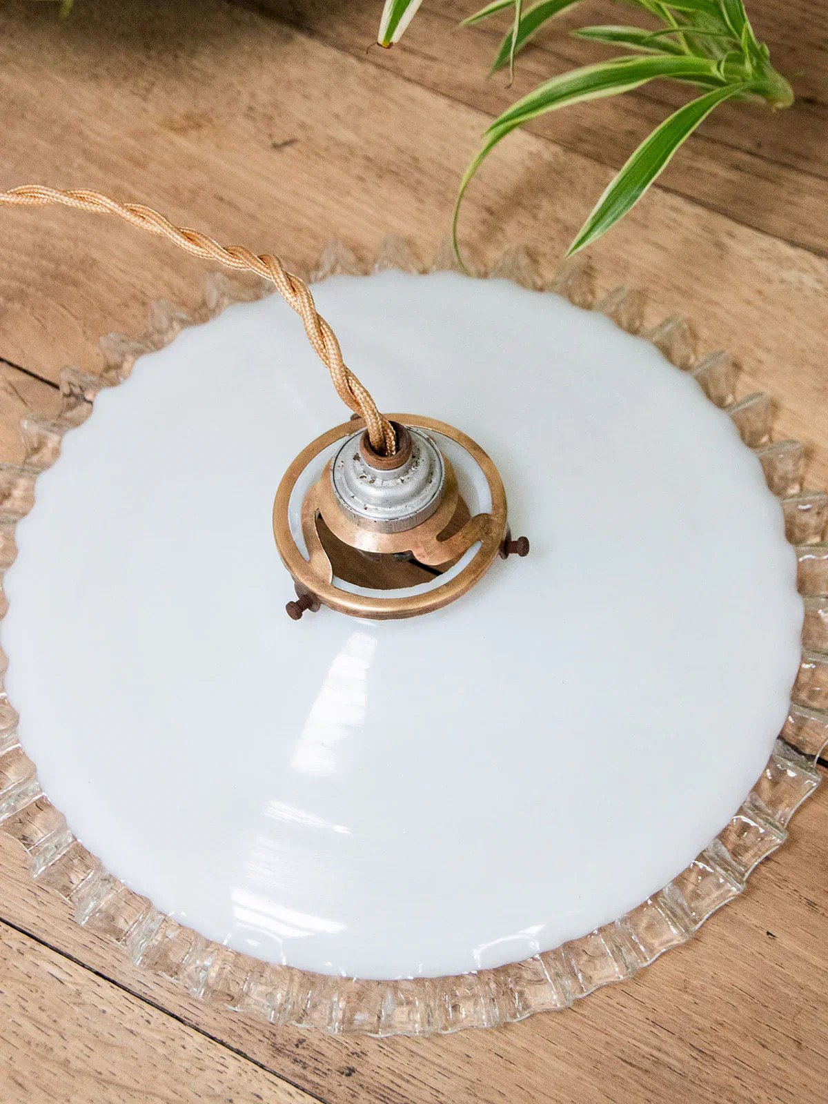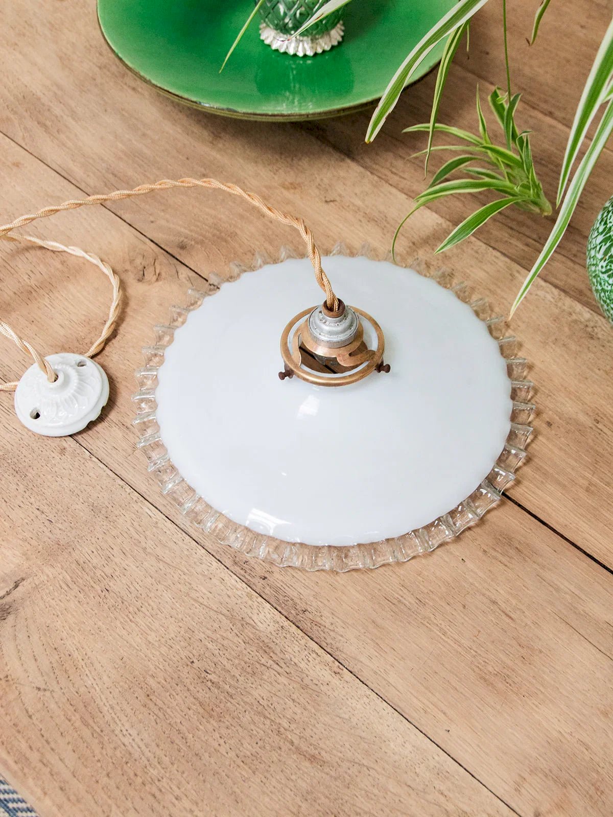 Découvrez nos magnifiques suspensions à accroches dorées, alliant élégance et modernité. Fabriquées en verre opaque avec des bordures en verre transparent, elles s'intègrent parfaitement dans tout type d’intérieur. Grâce à la longueur de fil variable et aux différentes accroches au plafond, ces modèles offrent une hauteur ajustable pour s'adapter à votre espace. Choisissez parmi trois modèles distincts, pour illuminer votre décor avec style. Modèle 1 : globe en verre fixé à une douille en laiton patiné à trois bandes, avec un long cordon torsadé doré se terminant par une rosace en céramique blanche ornée d’un motif floral. Longueur : 26 cm Largeur : 26 cm Hauteur : 185 cm Modèle 2 : globe en verre fixé à une douille en laiton patiné ronde, avec cordon torsadé doré plus court, se terminant également par une rosace en céramique blanche ornée d’un motif floral. Longueur : 26 cm Largeur : 26 cm Hauteur : 98 cm Modèle 3 : globe en verre fixé à une douille en laiton patiné en relief plus foncé, avec cordon torsadé doré court, se terminant par une céramique blanche plus sobre. Longueur : 26 cm Largeur : 26 cm Hauteur : 96 cm