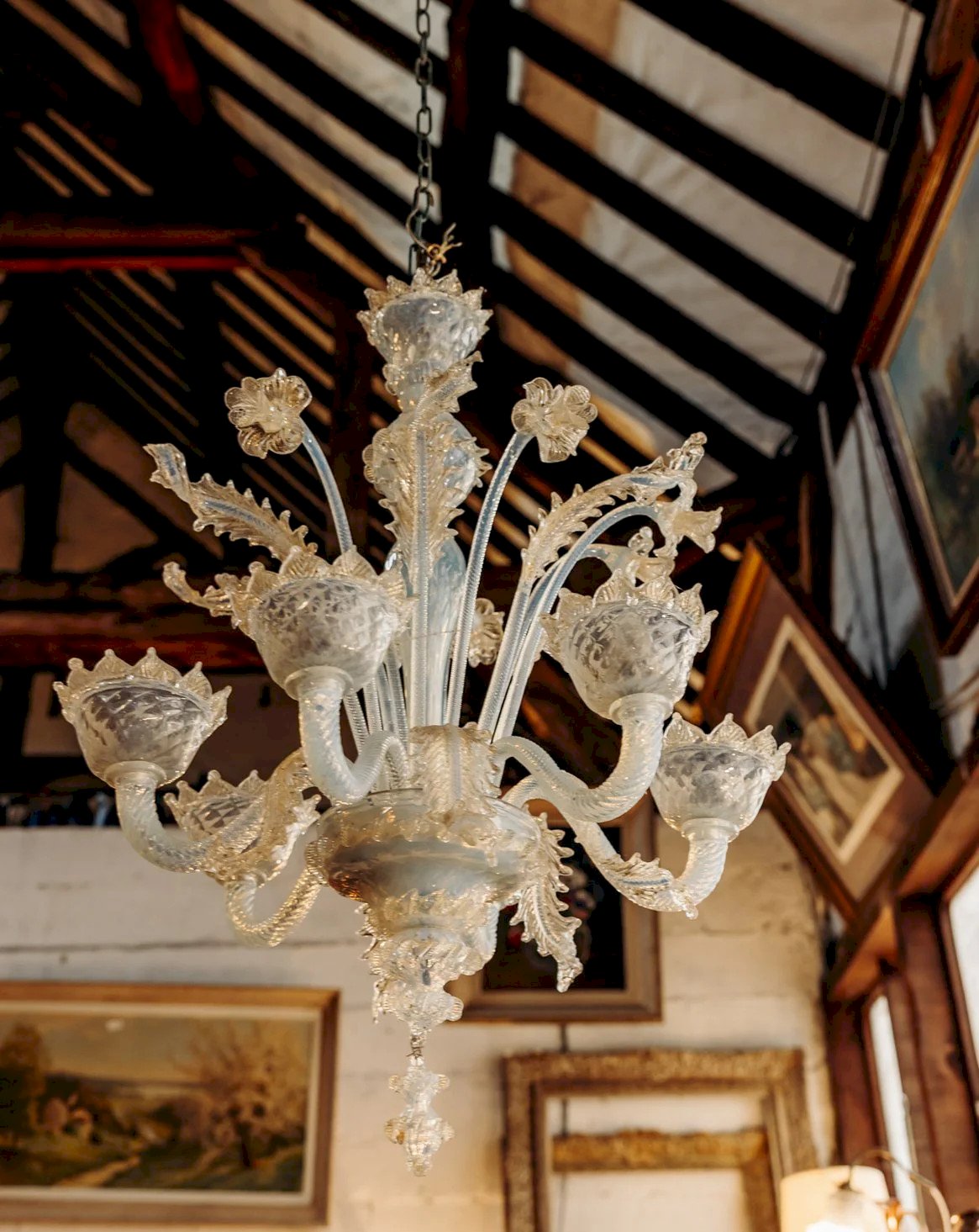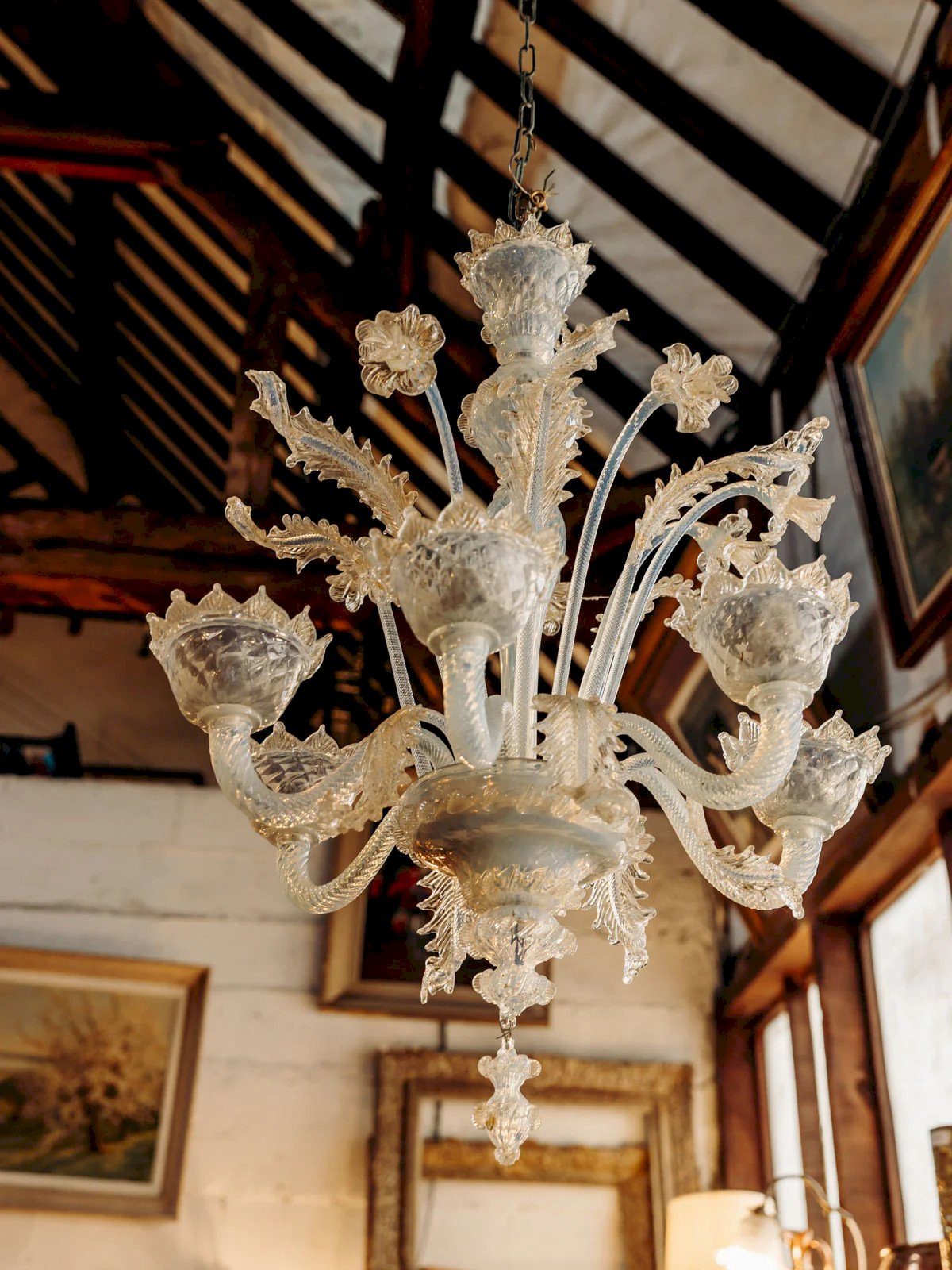 Sublimez votre intérieur avec ce lustre en verre de Murano, où de jolis détails façonnés à la main lui confèrent une présence raffinée. Son format contenu mais élégant en fait une suspension idéale pour une entrée ou au‑dessus d'une table, et ses petits culots accueillent des ampoules qui diffusent une lumière douce et modulable. Le travail du verre crée des reflets délicats et une ambiance chaleureuse, apportant à la pièce une touche artistique et intimiste. Hauteur : 70 cm Diamètre : 50 cm État:Occasion: Objet ayant été utilisé. Objet présentant quelques marques d'usure superficielle, ...Occasion: Objet ayant été utilisé. Objet présentant quelques marques d'usure superficielle, entièrement opérationnel et fonctionnant correctement. Il peut s'agir d'un modèle de démonstration ou d'un objet retourné en magasin après une courte période d'utilisation. les éventuelles imperfections. Marque:Debongout Type:Produit chiné Vintage:Oui Style:Contemporain