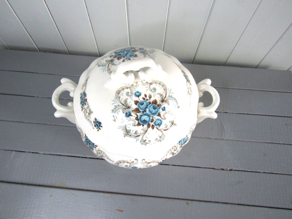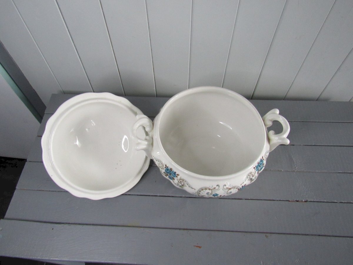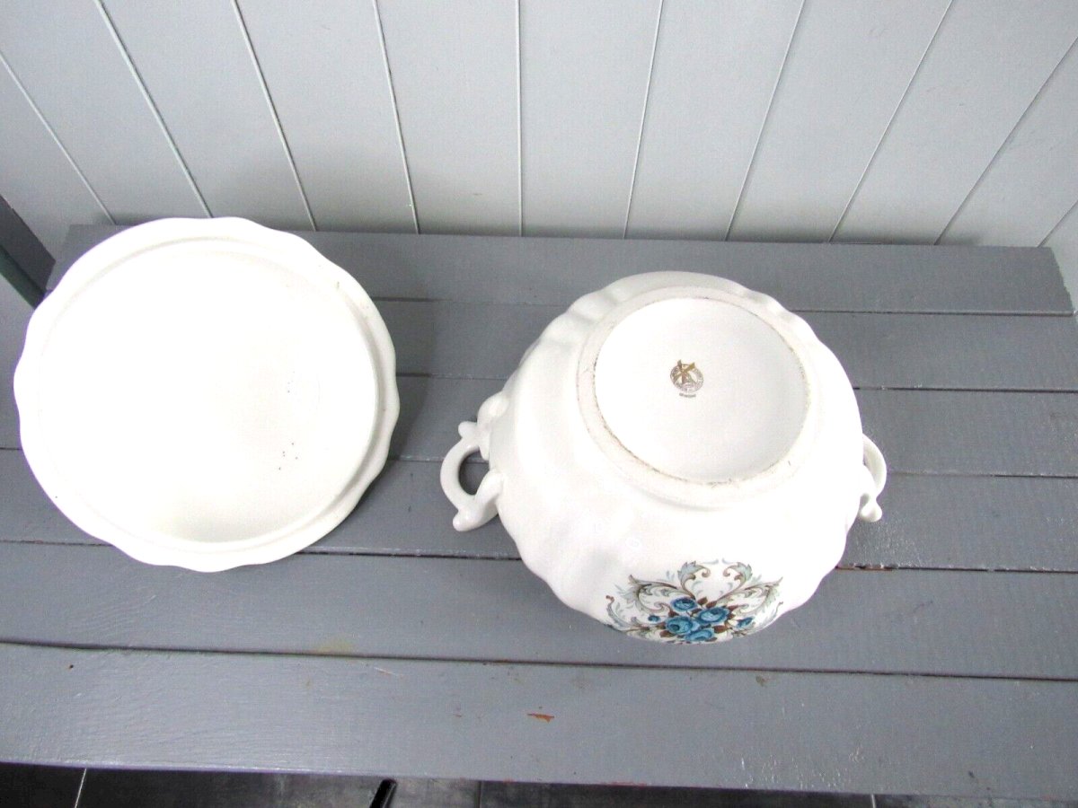 fond blanc, décor floral bleu canard, 2 anses, couvercle avec anse