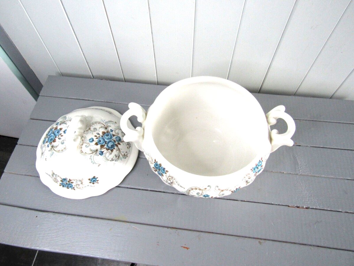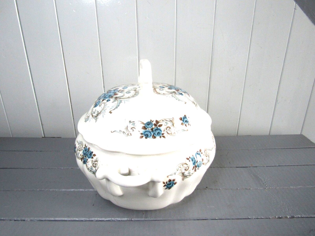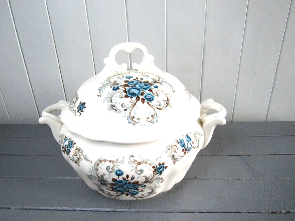 fond blanc, décor floral bleu canard, 2 anses, couvercle avec anse