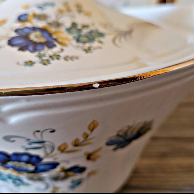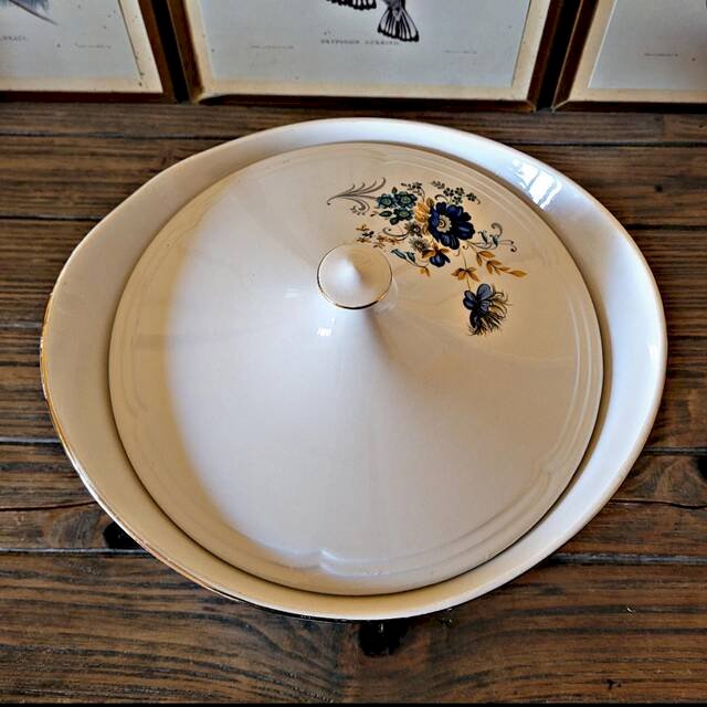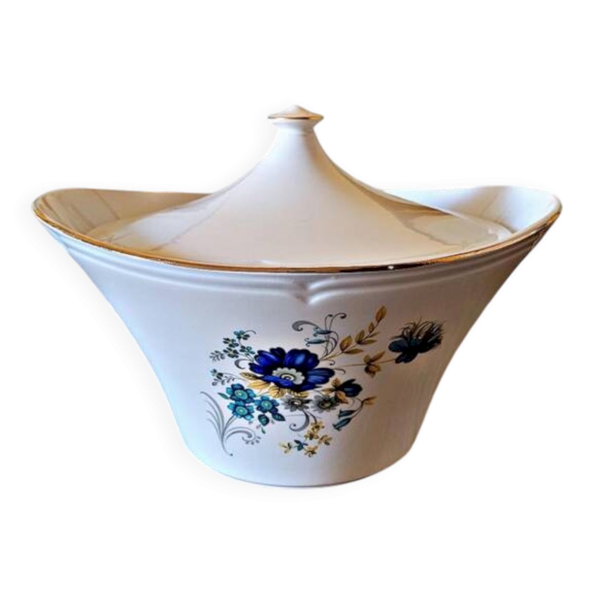 Cette soupière Moulin des Loups – modèle Volubilis illustre parfaitement l’élégance et le raffinement de l’art de la table du milieu du XXᵉ siècle.Le décor délicat de fleurs bleues, souligné par un fin liseré doré, apporte douceur et lumière à la pièce.