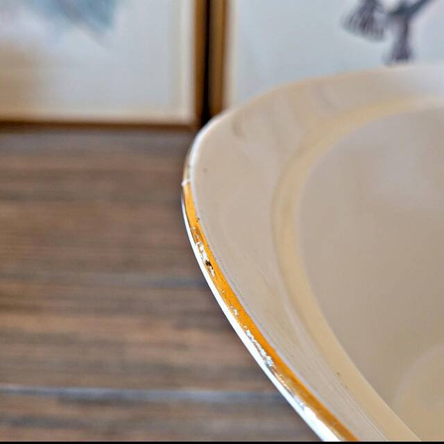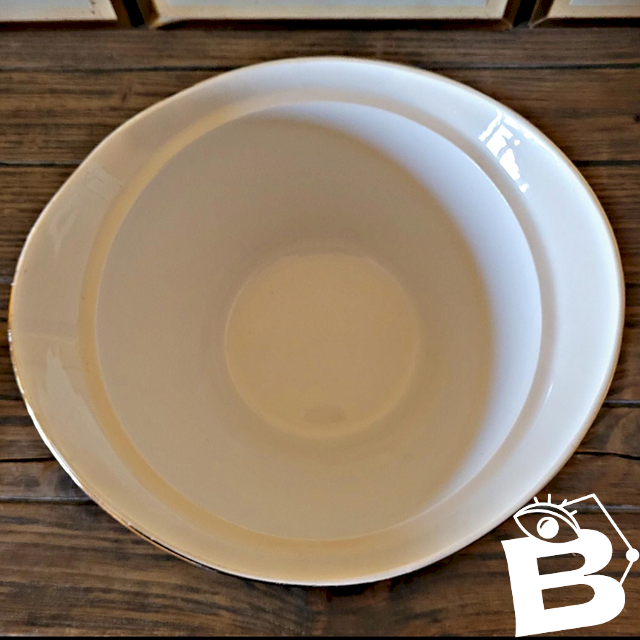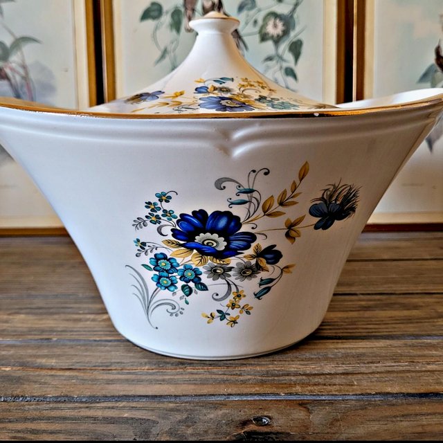 Le pourtour présente un relief travaillé rappelant les moulures que l’on retrouve dans les maisons d’époque, un détail décoratif qui renforce son caractère classique et intemporel.Idéale pour servir soupes, mais aussi d’autres plats chauds, avec élégance.Très bel état général ci ce n’est un léger manque sur le pourtour et la dorure qui s’estompe un peu par endroit (voir photos).D’autres plats du même modèle sont disponibles (saladier, saucière, plat fromages…).? largeur environ 26, 5 cm – profondeur environ 24 cm – hauteur environ 18 cm.⚖️ environ 1400 gr.