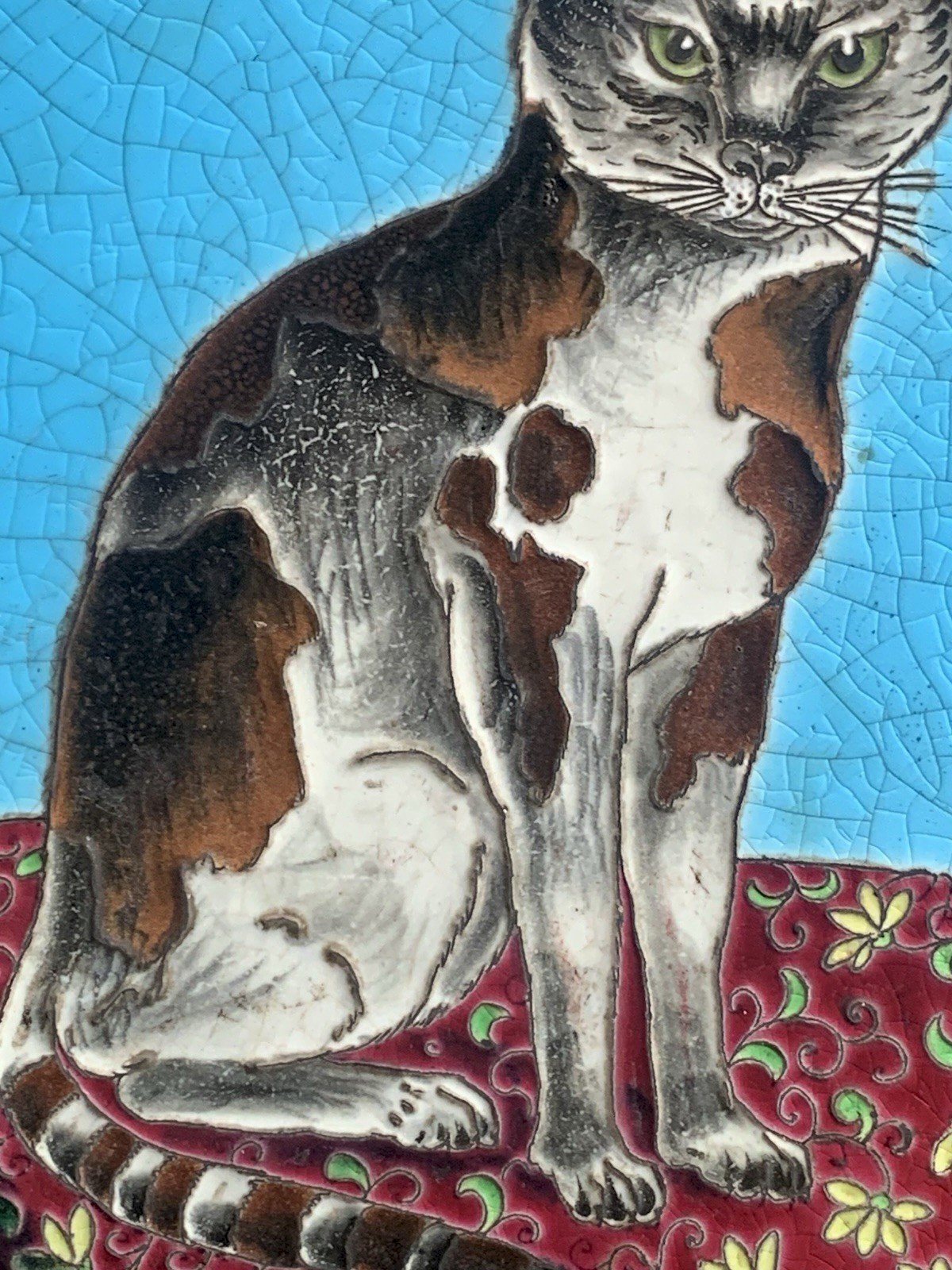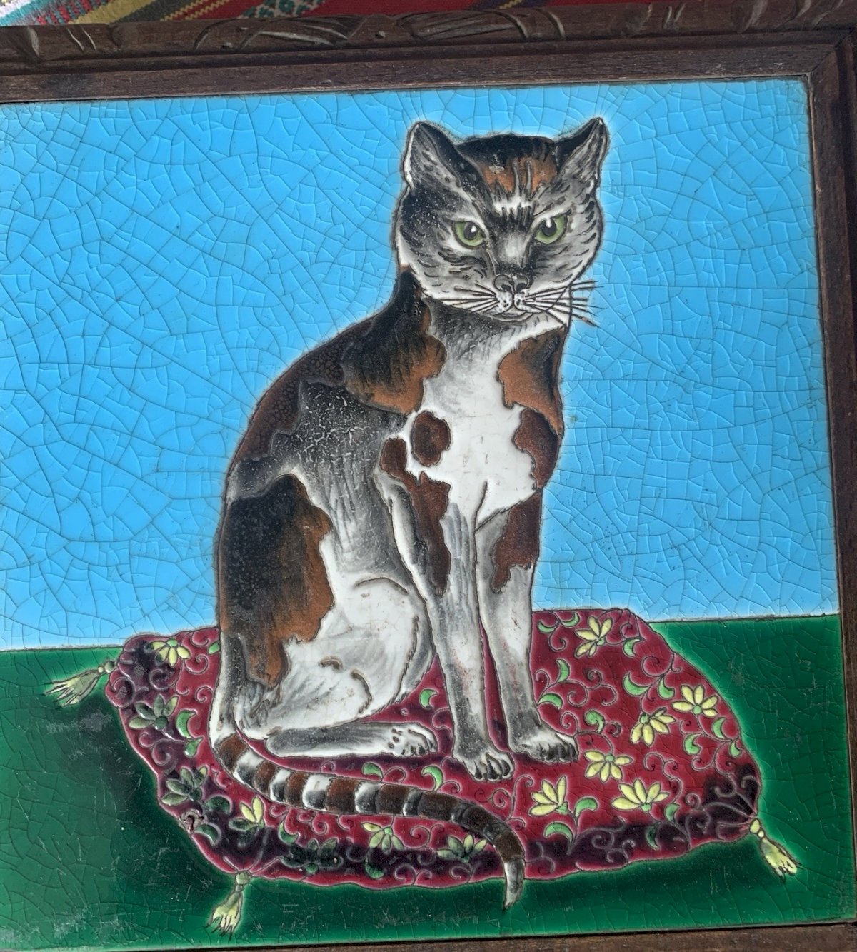 Sous plat Émaux XIXe Chat assis sur un coussin Bordeaux ou Gien Bel état Une traverse en bois bouge un peu Dimensions:26,5x26,5cm Carreau:20x20cm