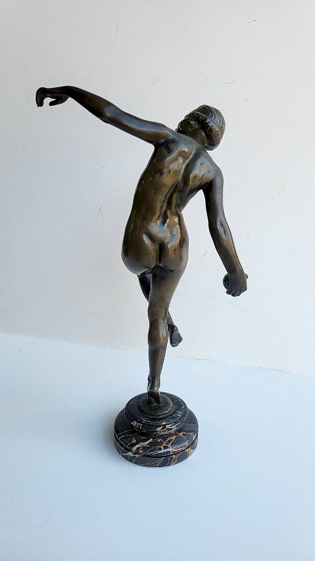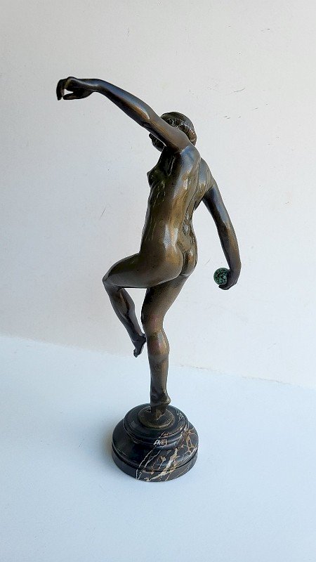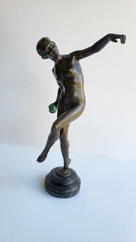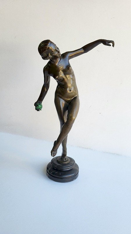 superbe statue en bronze Lucien Charles Edouard Alliot 1877-1967 1920 Art Déco elle est en très bon état elle a juste 1 éclat sur le socle en marbre mais sur la partie arrière donc pas visible de face la boule qu'elle tient dans la main est magnifique cette sculpture est signée L. Alliot la patine est vraiment belle cette pièce est une réussite extraordinaire elle mesure 28 cm de haut sur 16 cm de large et 9 cm de profondeur Type:Statue, Sculpture Matière:Bronze Pays d'origine:France métropolitaine