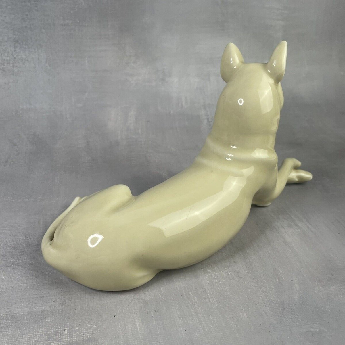 Statuette de chien en porcelaine beige crème sans marque Haut.~12cm Chien type berger allemand couché pattes croisées Dimensions ~ 23 x 9 x 12 cm Poids ~ 400 g Excellent état, RAS, voir photos Pensez à grouper vos achats pour réduire les frais de port ! État:OccasionObjet ayant été utilisé. les éventuelles imperfections. Animal:Chien