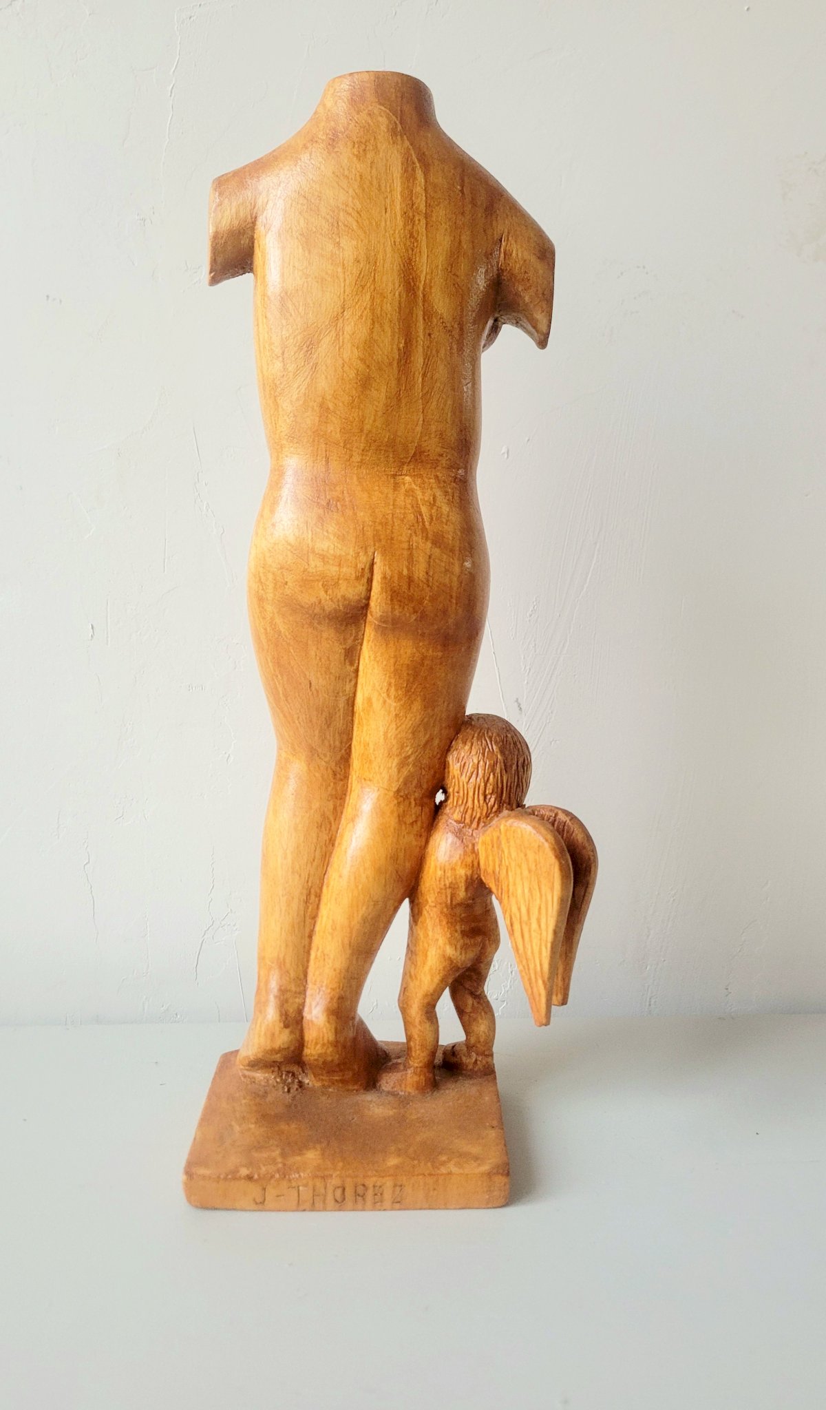 Très belle statuette féminine accompagnée d'un ange, en bois sculpté, signée J. Thorez.