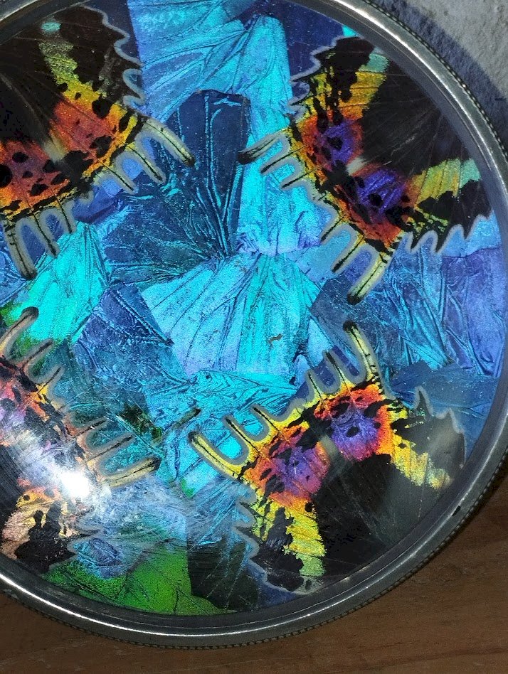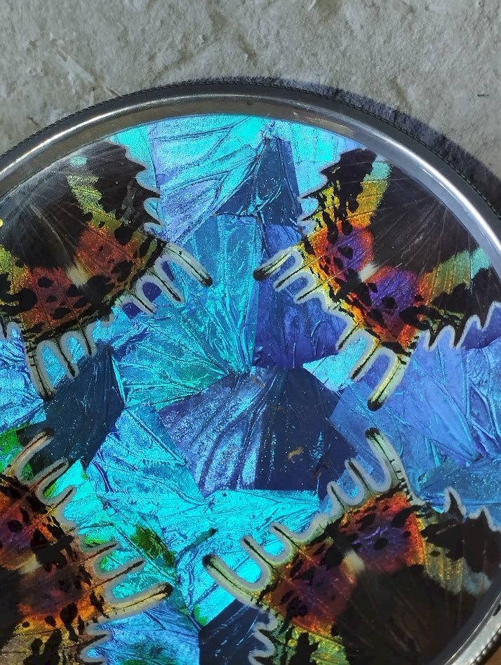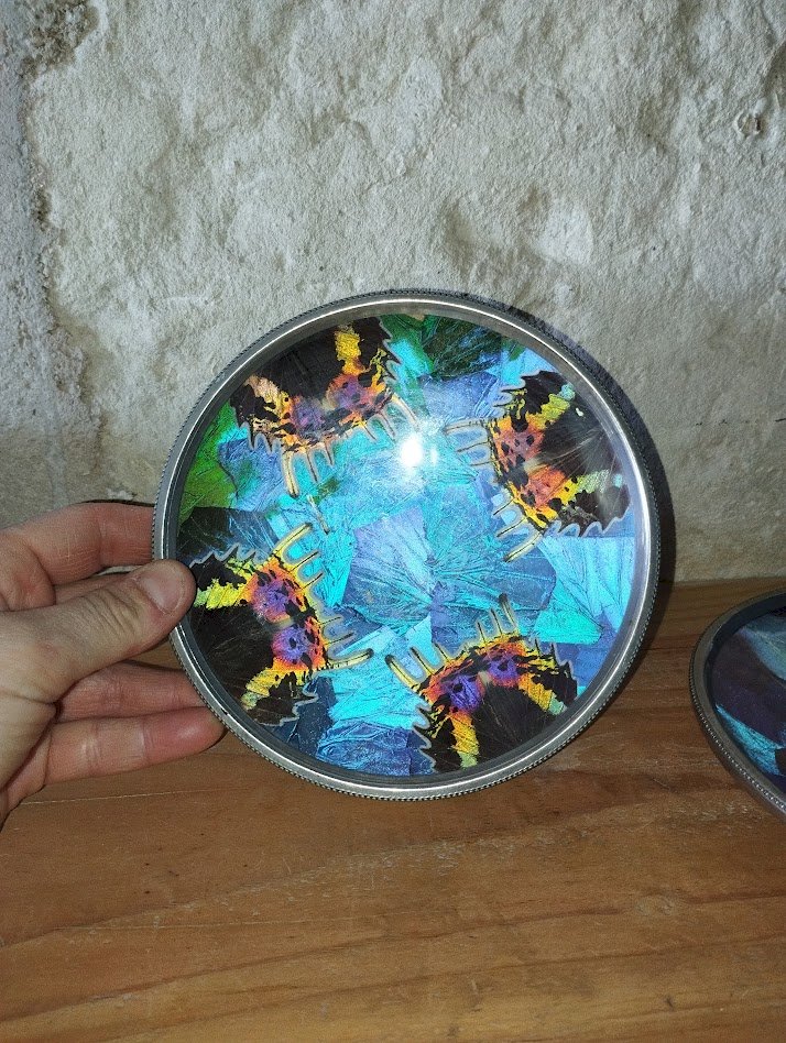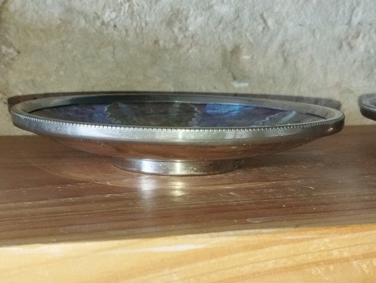 Rares et raffinées, ces coupelles Art déco séduisent par leur décor inspiré des ailes de papillon, aux nuances profondes et changeantes selon la lumière. Les reflets irisés, oscillant entre bleus et verts, offrent un rendu vibrant et élégant.