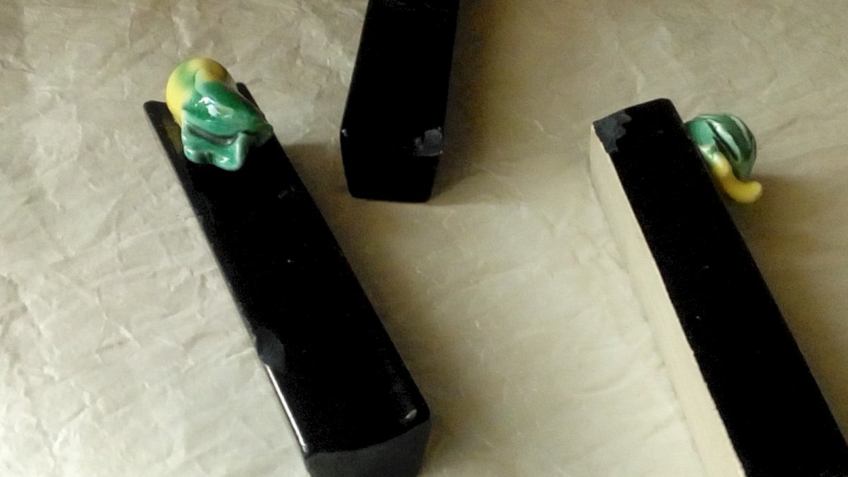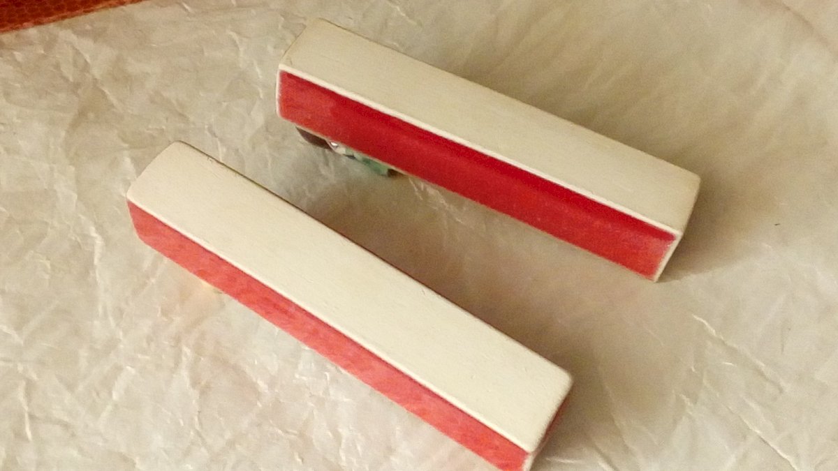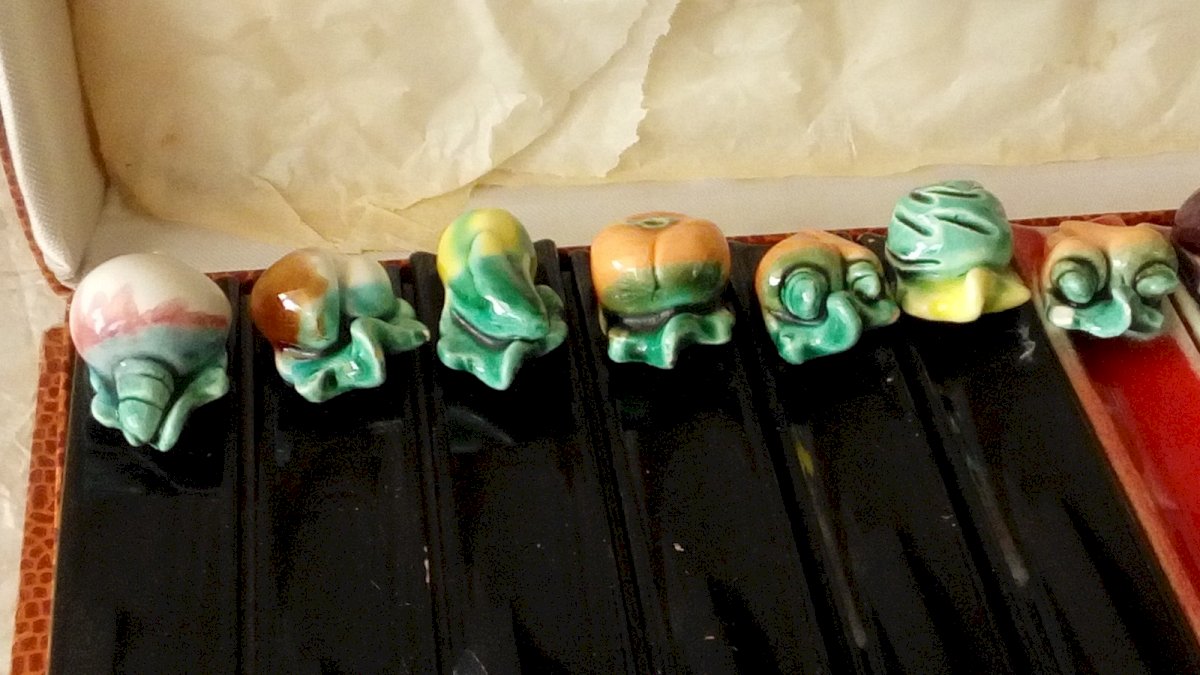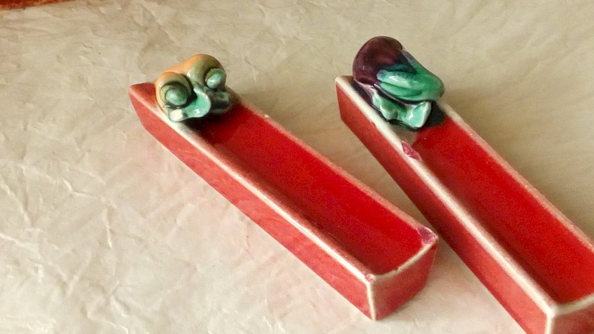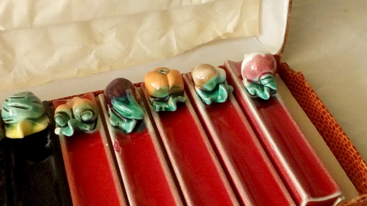 ANCIEN PORTE COUTEAUX EN FAIENCE BARBOTINE CERTAINEMENT VALLAURIS DANS LEUR BOITE D'ORIGINE DECOR LÉGUMES 4 SAISONS ANNÉES 1950 ART DÉCO HAUTEUR 3 cm LONGUEUR 8.50 cm LARGEUR 2 cm EGRENURES VISIBLE SUR LES PHOTOS SUR 5 PORTE COUTEAUX