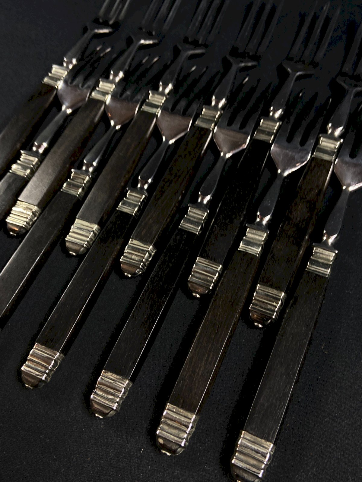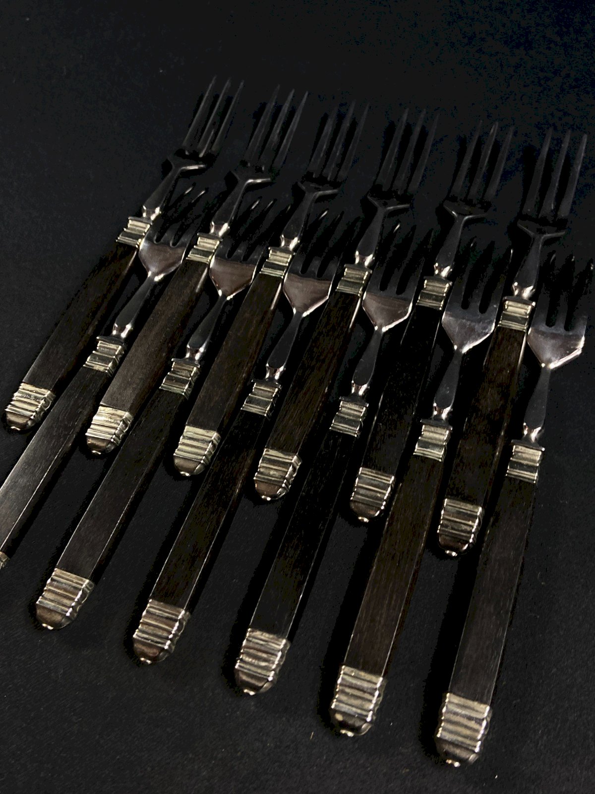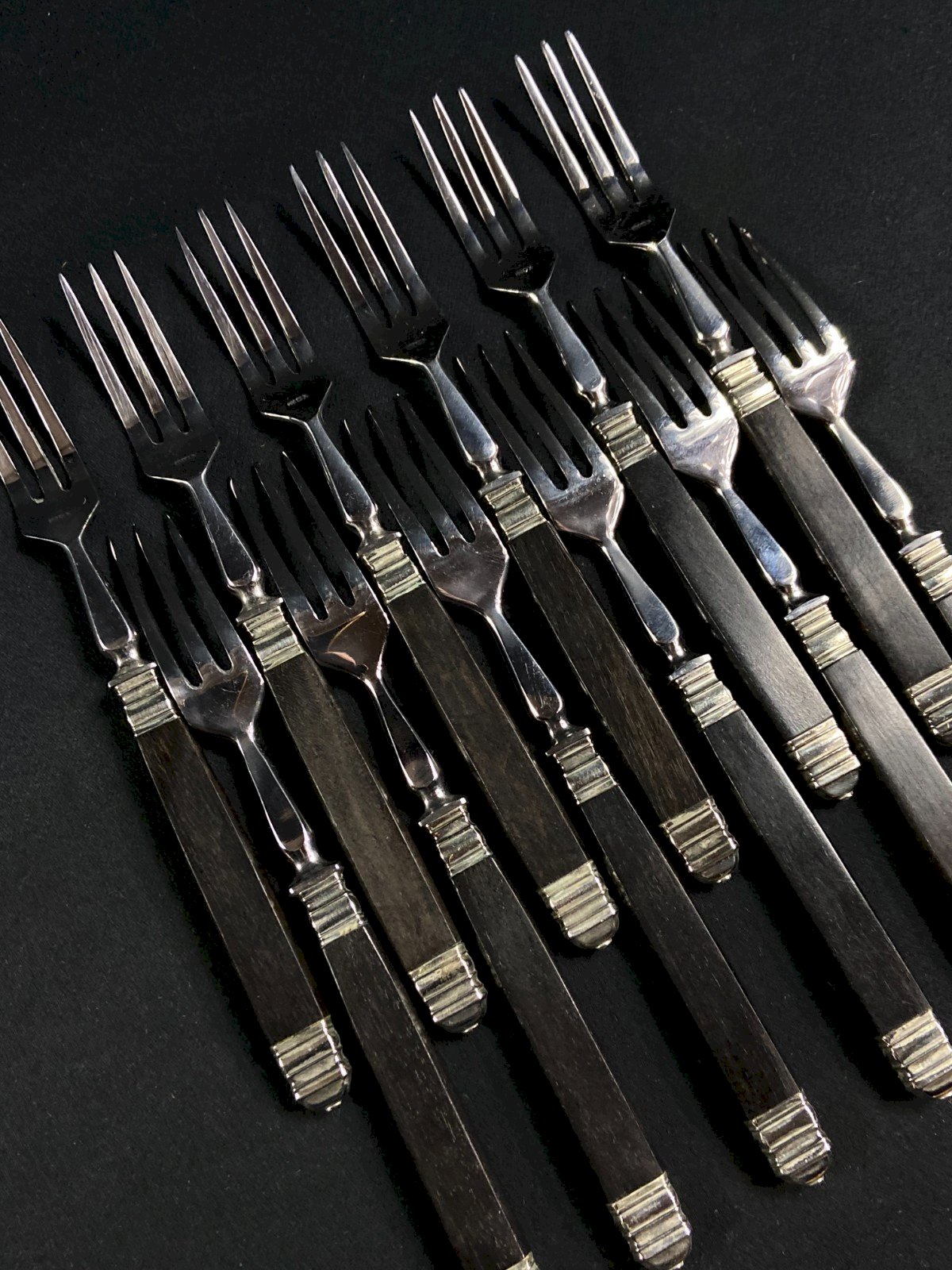 Suite de 12 fourchettes à dessert, à entremets manche bois style Art déco
