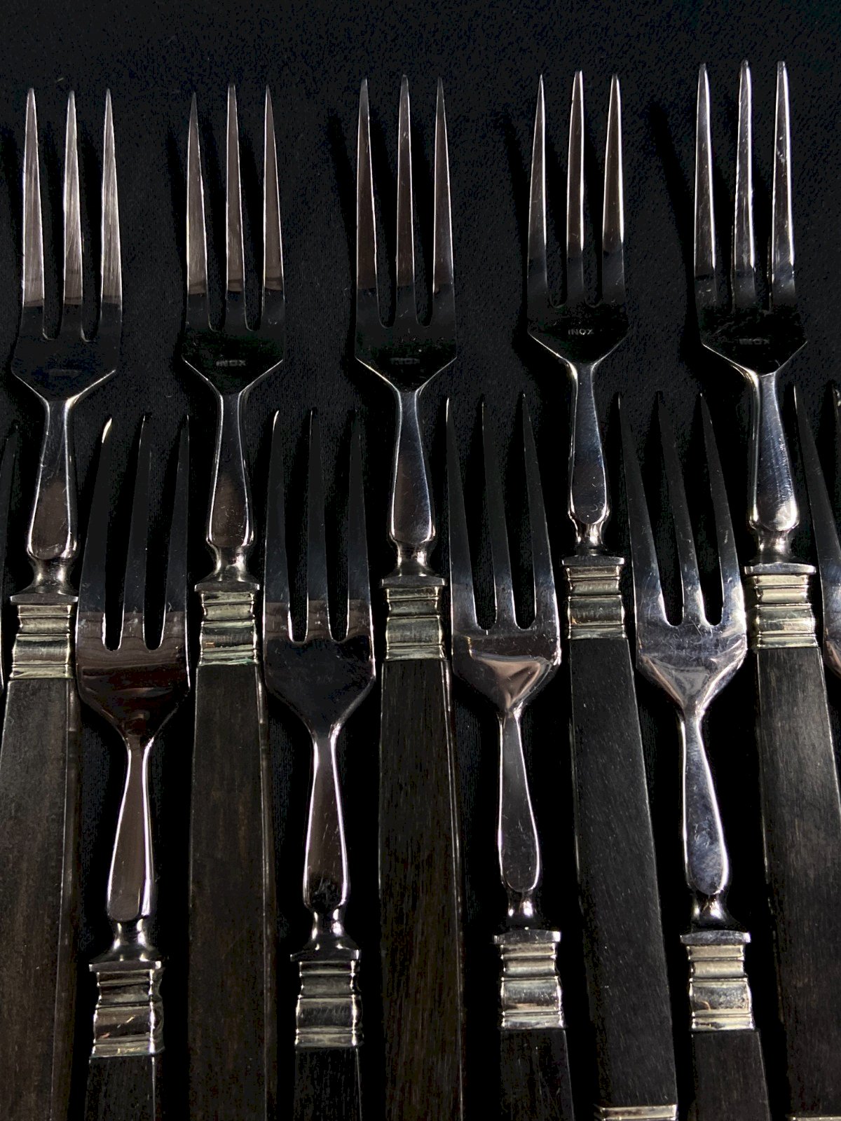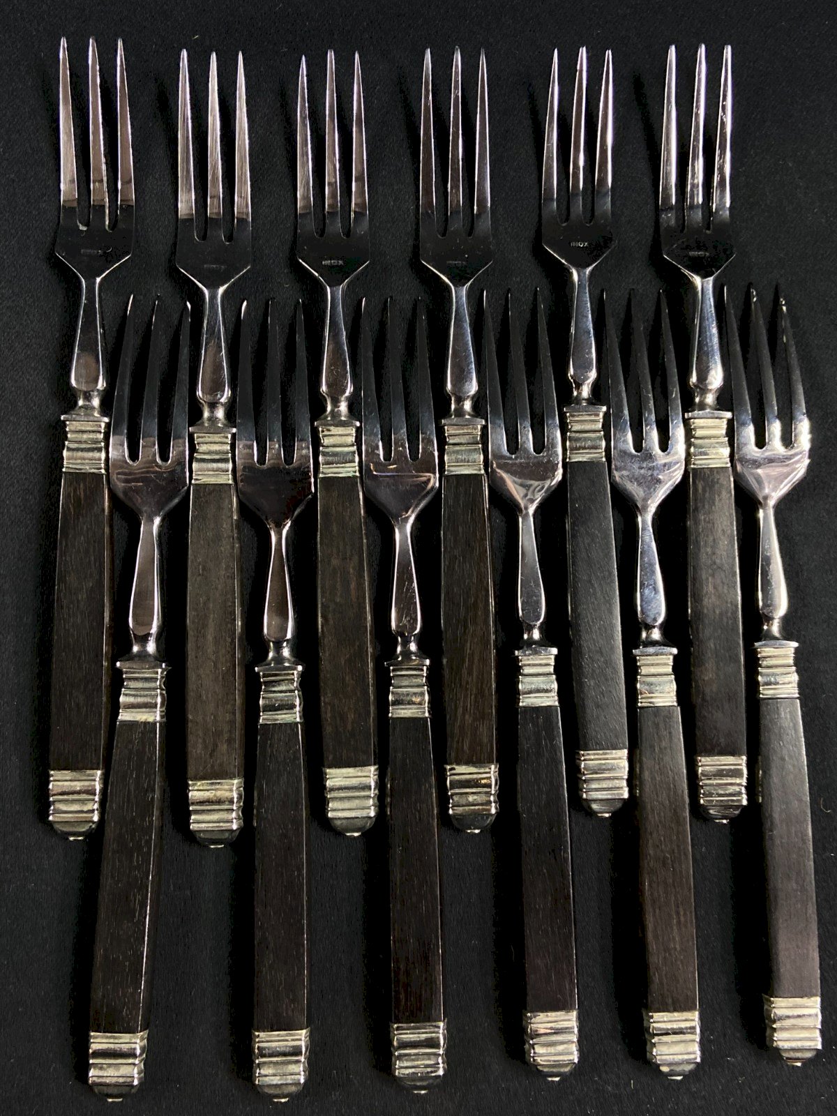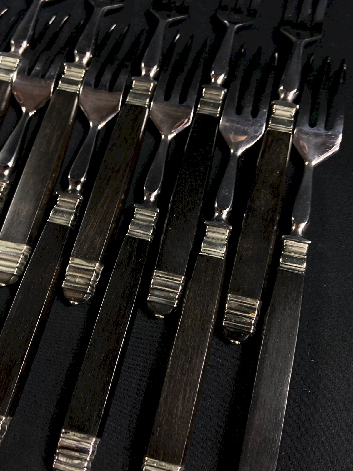 Suite de 12 fourchettes à dessert, à entremets manche bois style Art déco