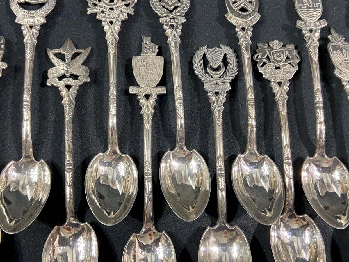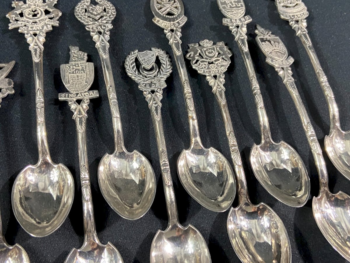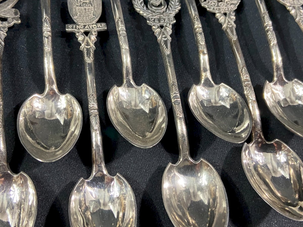 Suite complète de 12 petites cuillères en argent massif Malaisie Singapour milieu XXe Cuillerons en forme de cœur allongé, manches à décor de bambou et terminaisons en armoiries/insignes ajourés portant le nom des États et villes de la péninsule malaise – on lit notamment  PERAK, KELANTAN, PERLIS, PAHANG, PENANG, KEDAH, JOHORE, SELANGOR, TRENGGANU , ainsi que  SINGAPORE , etc. Beau travail de ciselure typique des ateliers d’Asie du Sud-Est au milieu du XXᵉ siècle.  Très bon état Dimensions max : 12,5 x 2,4 cm Poids total : 168 grammes Envoi TRES soigné dans le monde entier Authenticité:Original Type:Vaisselle Origine:Singapour Période:1950-1969 Pays d'origine:Singapour Matière:Argent massif Style:1970
