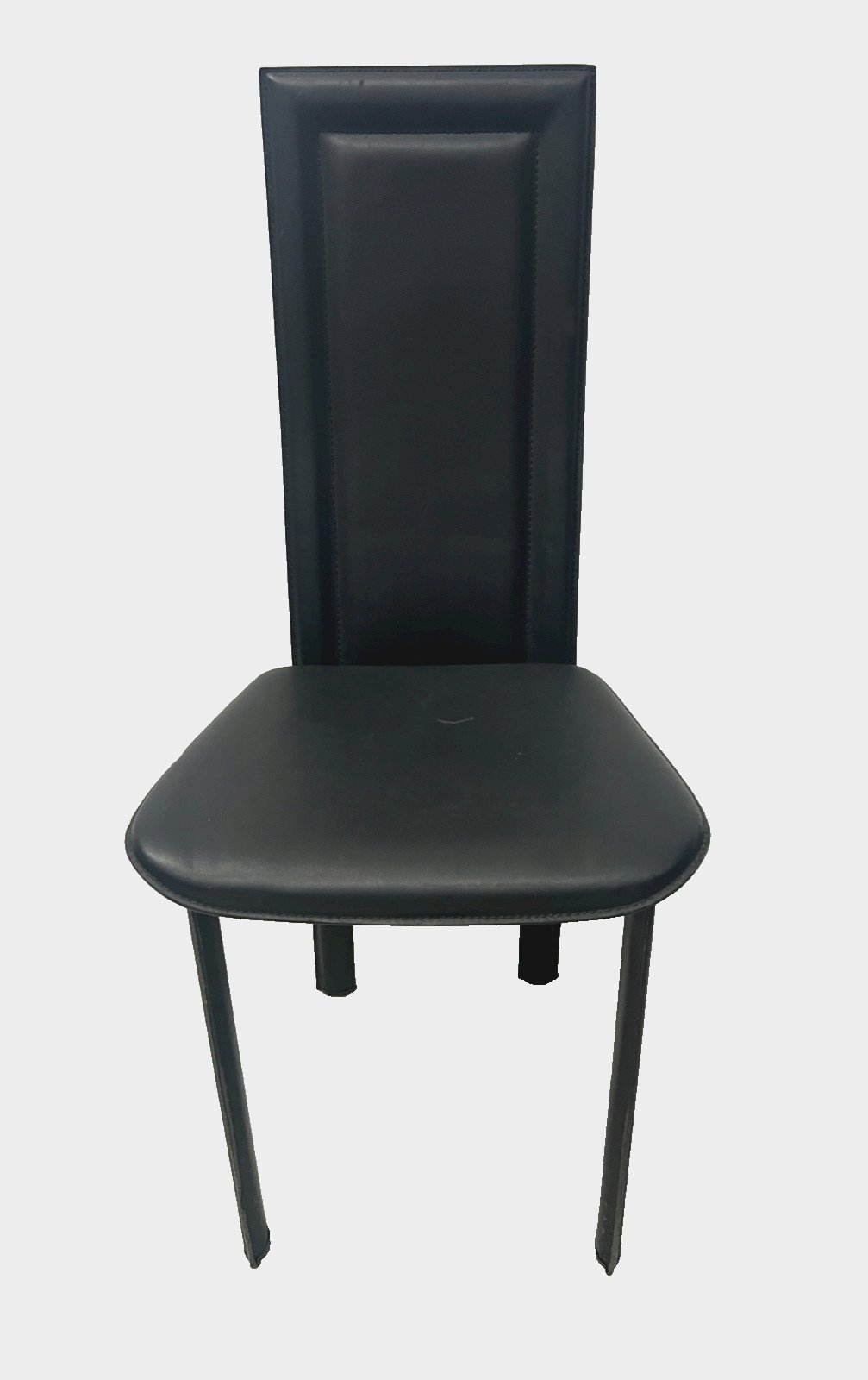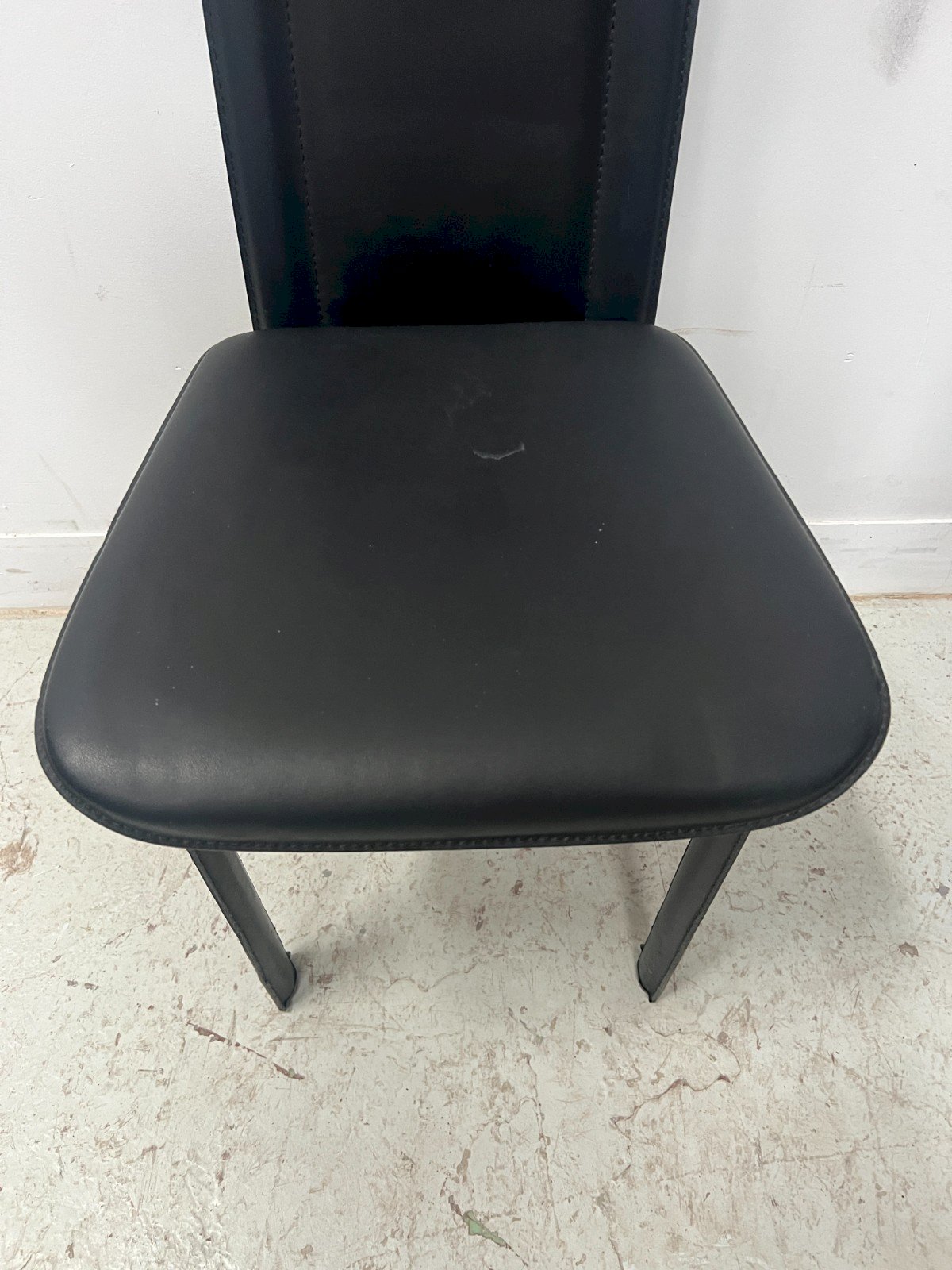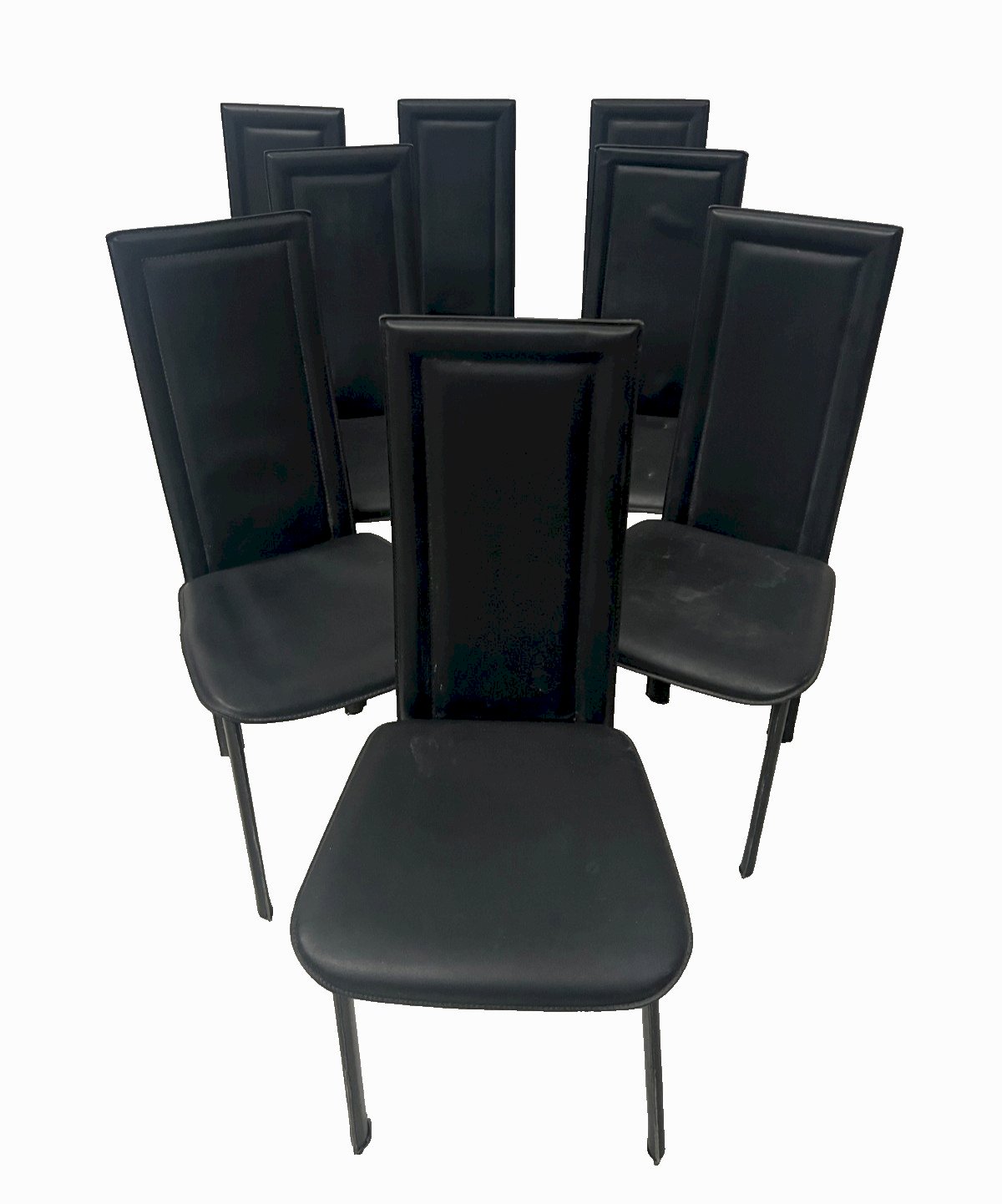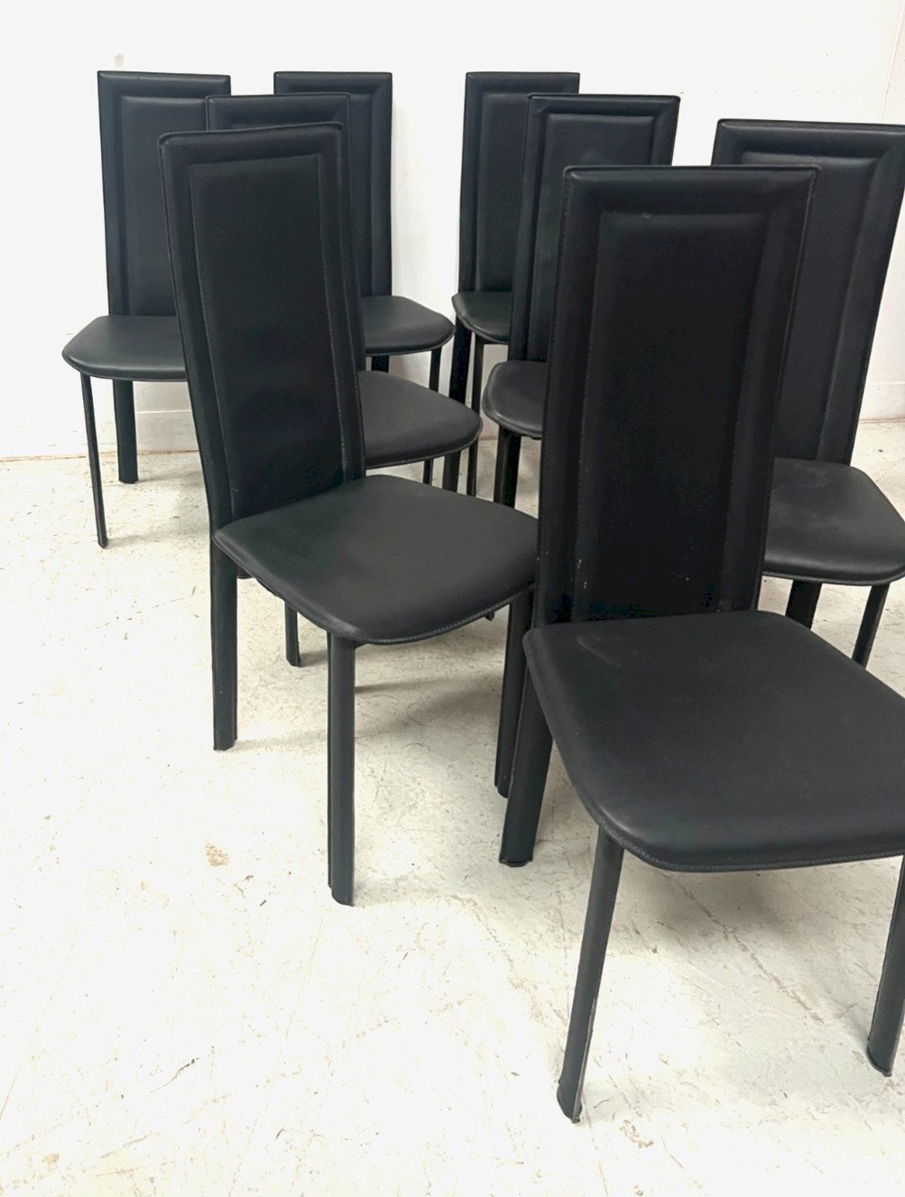 Suite de huit chaises design en cuir noir  Design Italien des années 70/80 Ossature en fer recouverte de cuir noir Petites usures au pieds  Bon état général  Dimension  H 115 x L 45 x 42 cm  Epoque XX siècle   Couleur:Noir Nombre de pièces:8 Type:Chaise Période:Design du XXème Matière:Cuir Style:design italien