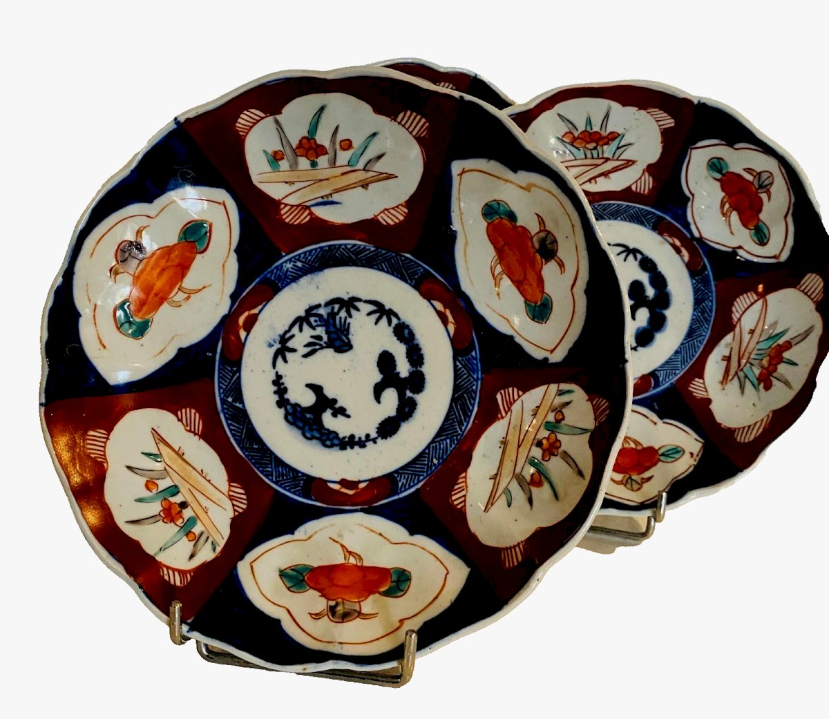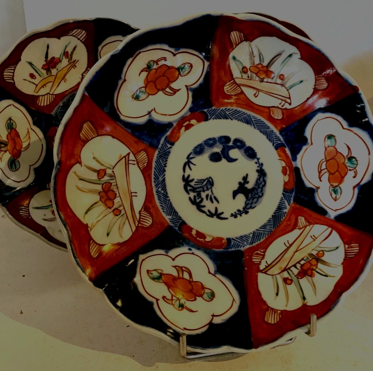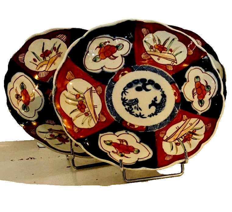 Suite de six assiettes en porcelaine a décor IMARI Bord a godron chantourné Bon état Dimension H 4.5 x 22 cm Epoque XIX siècle Type:Objet de vitrine, Décoratif Sous-type:Assiette Pays d'origine:Japon Matière:Porcelaine Style:Napoléon III