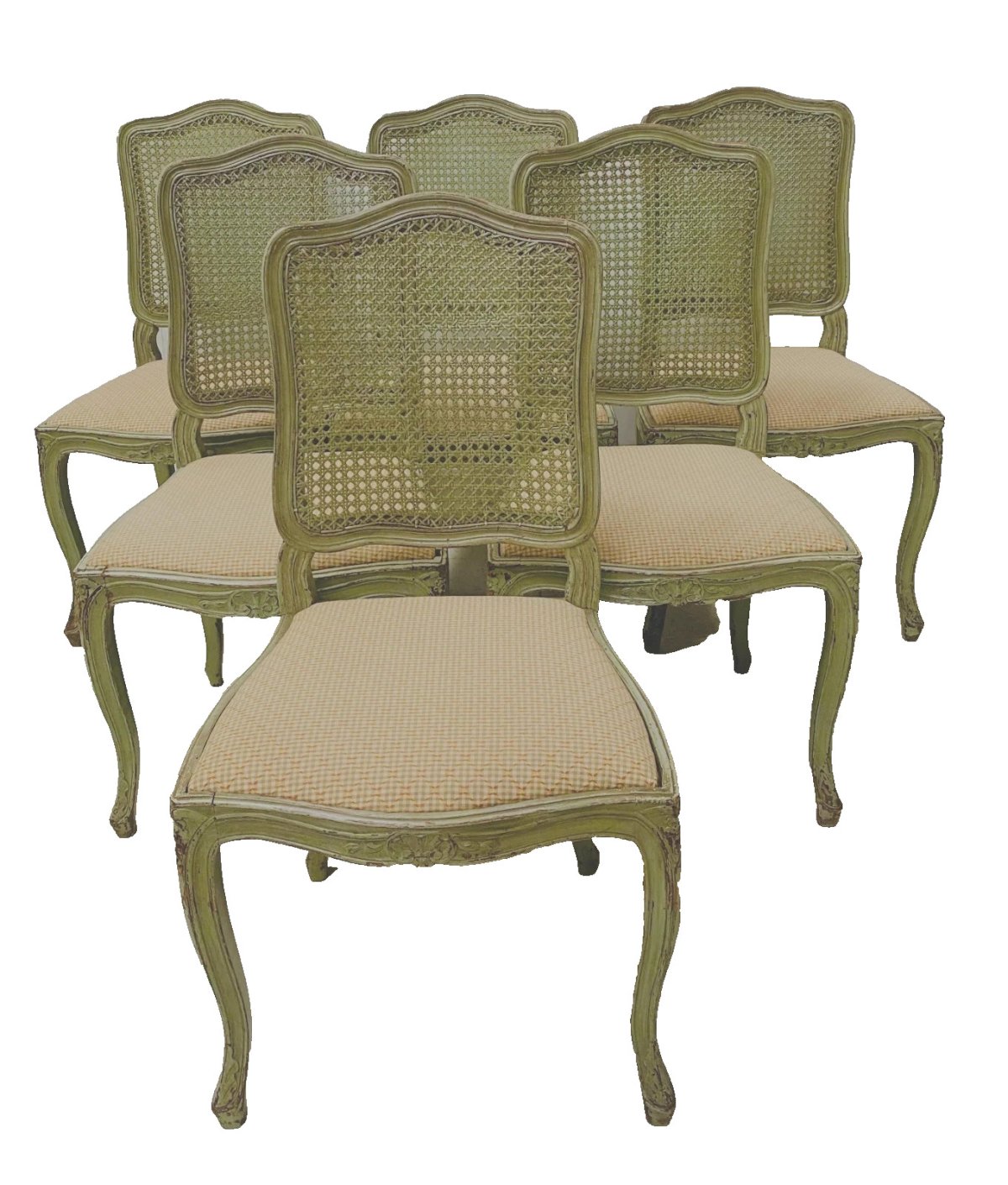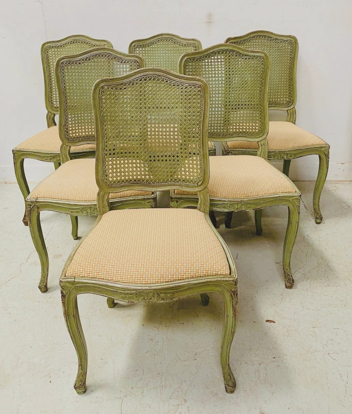 Suite de six chaises de style Louis XV en hêtre laqué  Dossier a fond de canne  et assise amovible  Bon état  Dimension  H 96 x L 47 x 42 cm  Hauteur d'assise 46 cm  Epoque XX siècle  Nombre de pièces:6 Type:Chaise Sous-type:Classique, de cuisine Pays de fabrication:France Hauteur:96 Matière:Hêtre Longueur:47 Largeur:42