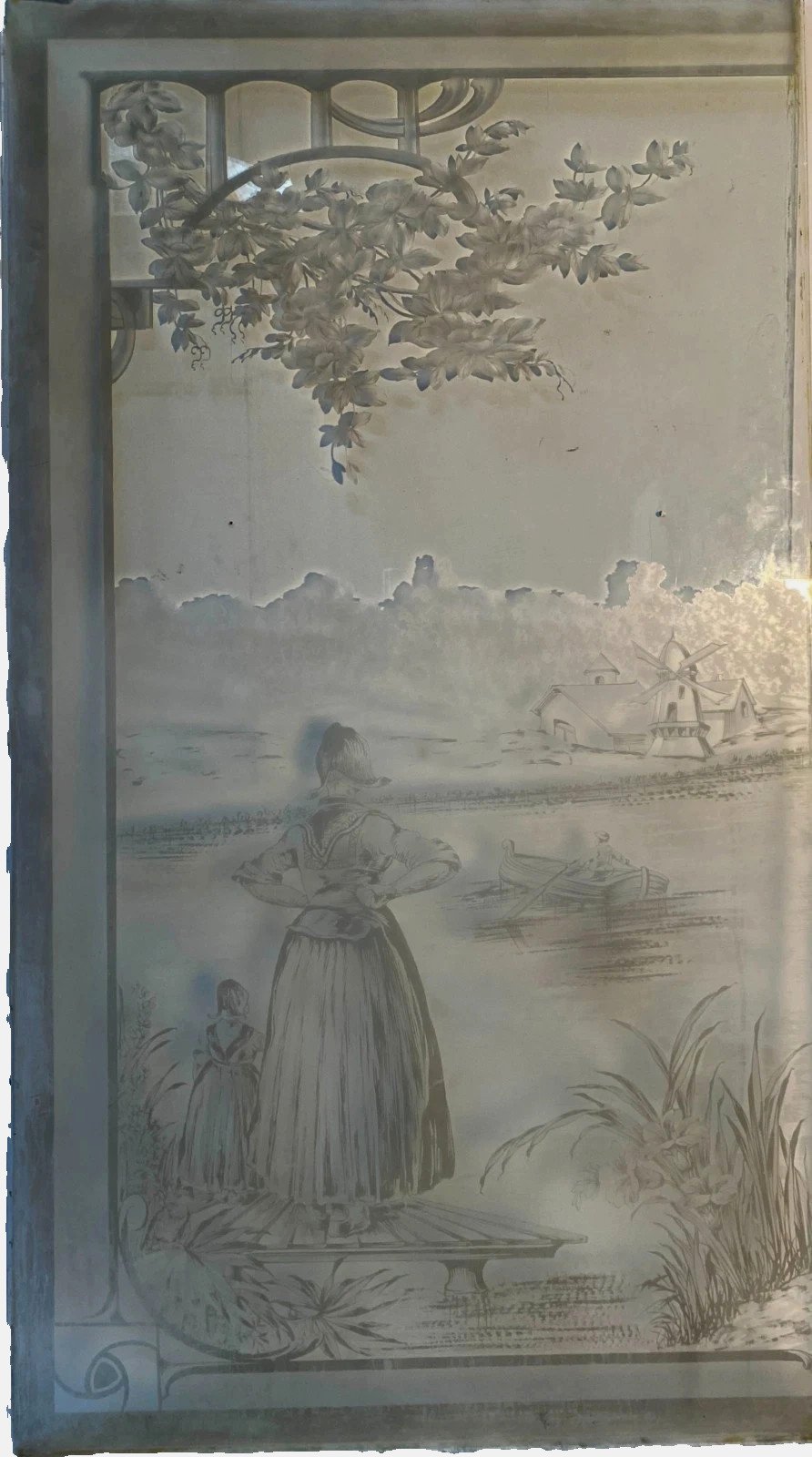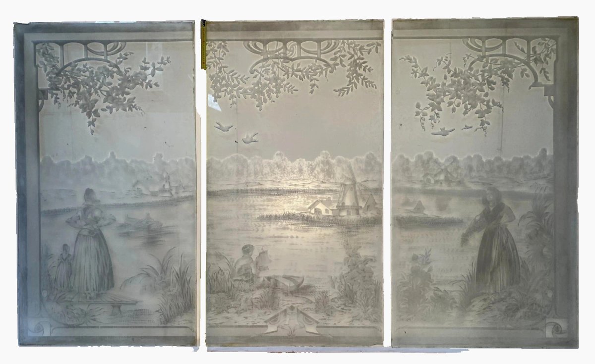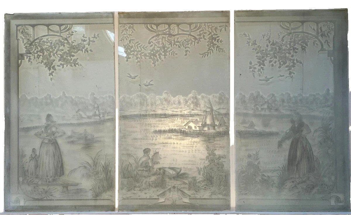 Suite de trois panneaux en verre gravé Scène animée de personnages sur un fon de paysage Petit éclat sur le haut a gauche  Bon état  Dimension  H 150 x L 84 cm par panneau Epoque Art Déco   Type:Architecture, Matériau Période:Art Déco Origine:France Pays d'origine:France Hauteur:150 Longueur:84