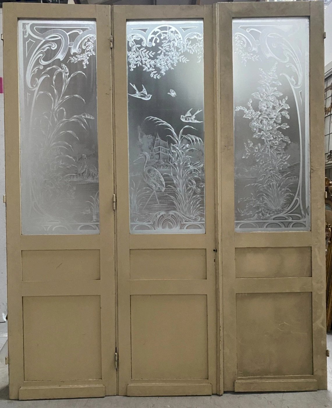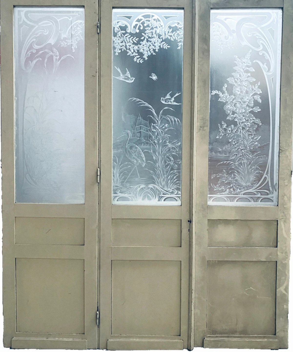 Suite de trois portes de séparation Art nouveau en bois et verre gravé XX siècle