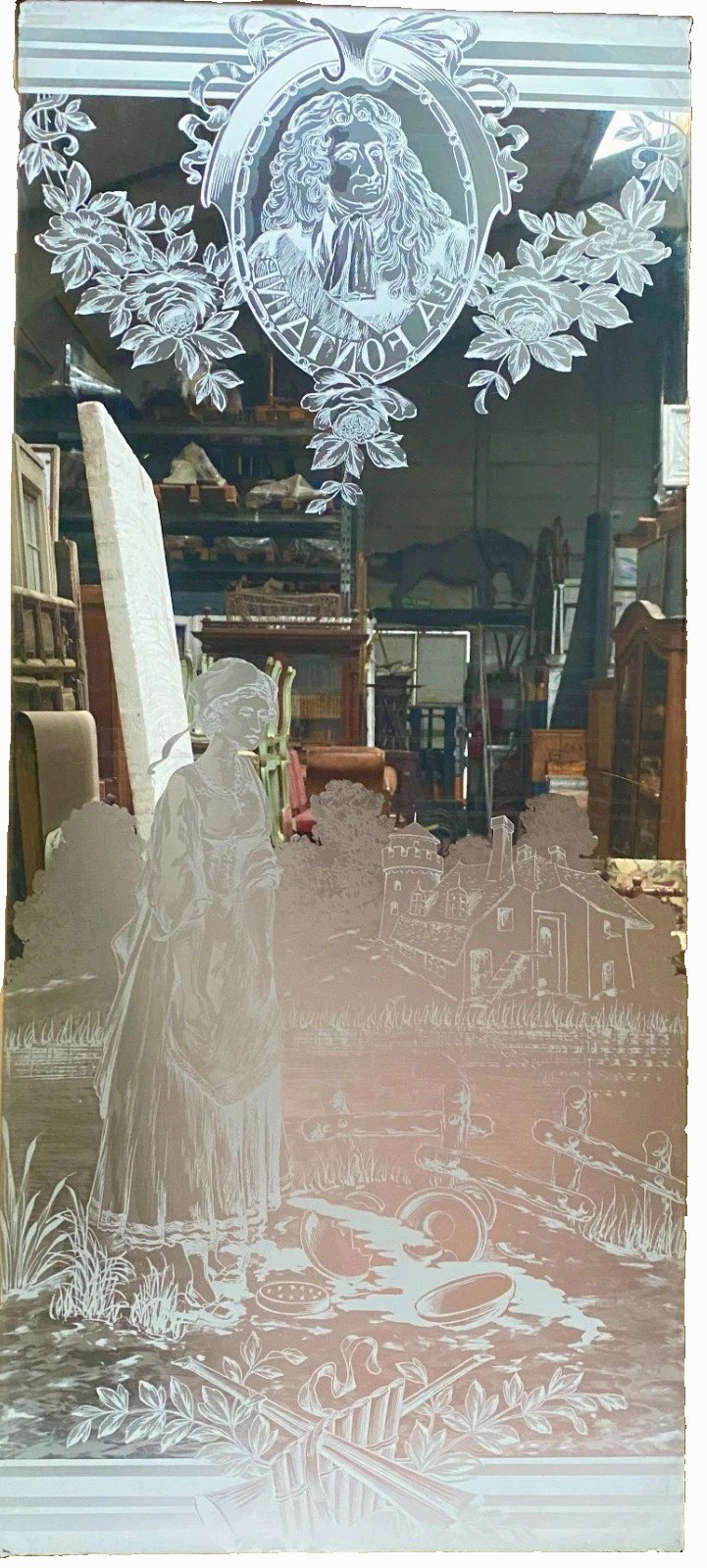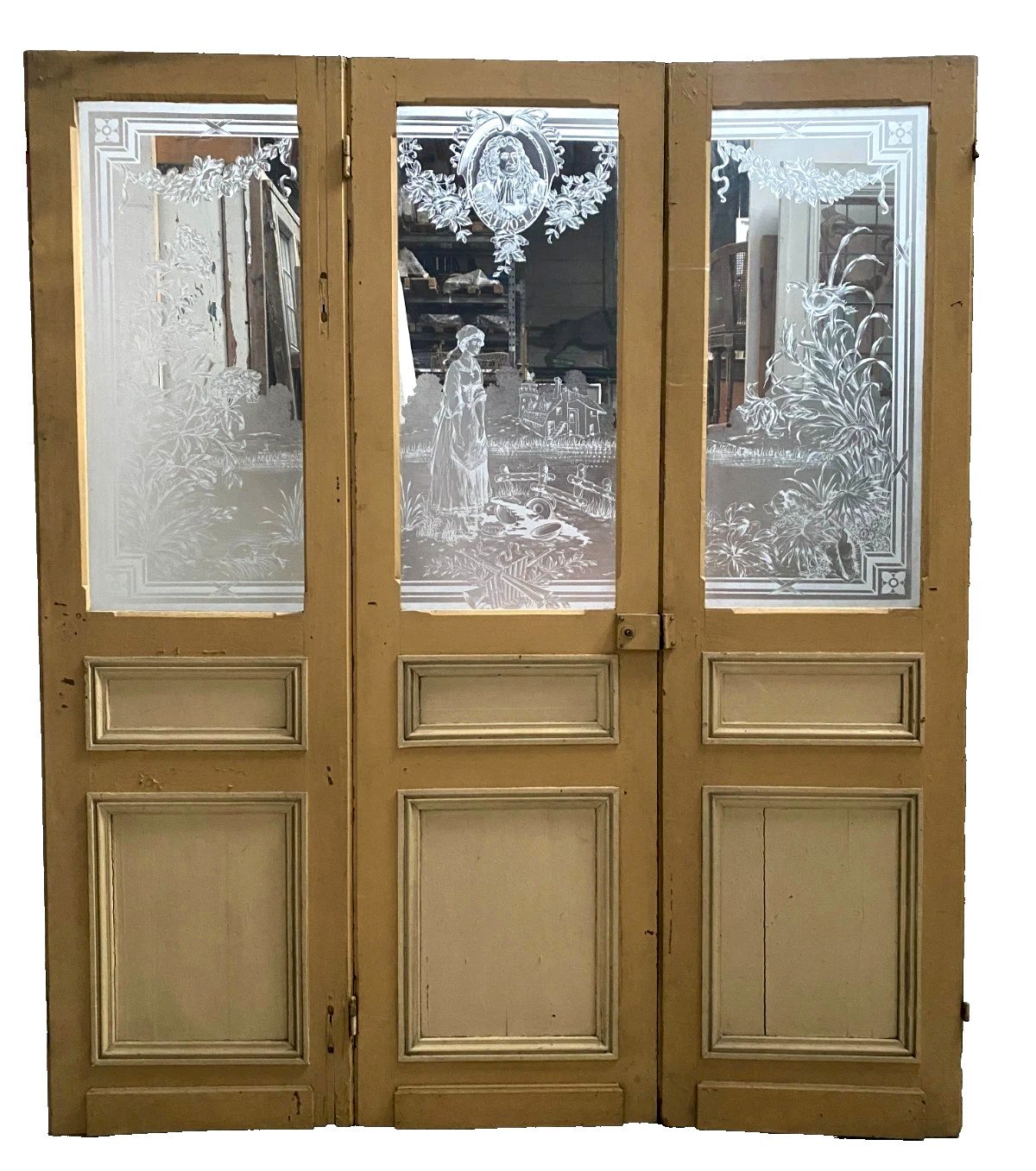 Suite de trois portes de séparation en verre gravé Ossature en sapin patiné  Verre a décor d'une fable et du portrait de " LA FONTAINE " Portes vendues sans le cadre  Bon état  Dimension  H 245 x L 207 x 305 cm  Verre gravé H 115 x 52 cm  Epoque début du XX siècle    Type:Porte Période:Design du XXème Hauteur:245 Matière:Bois Style:Art Déco Longueur:207 Largeur:3.5