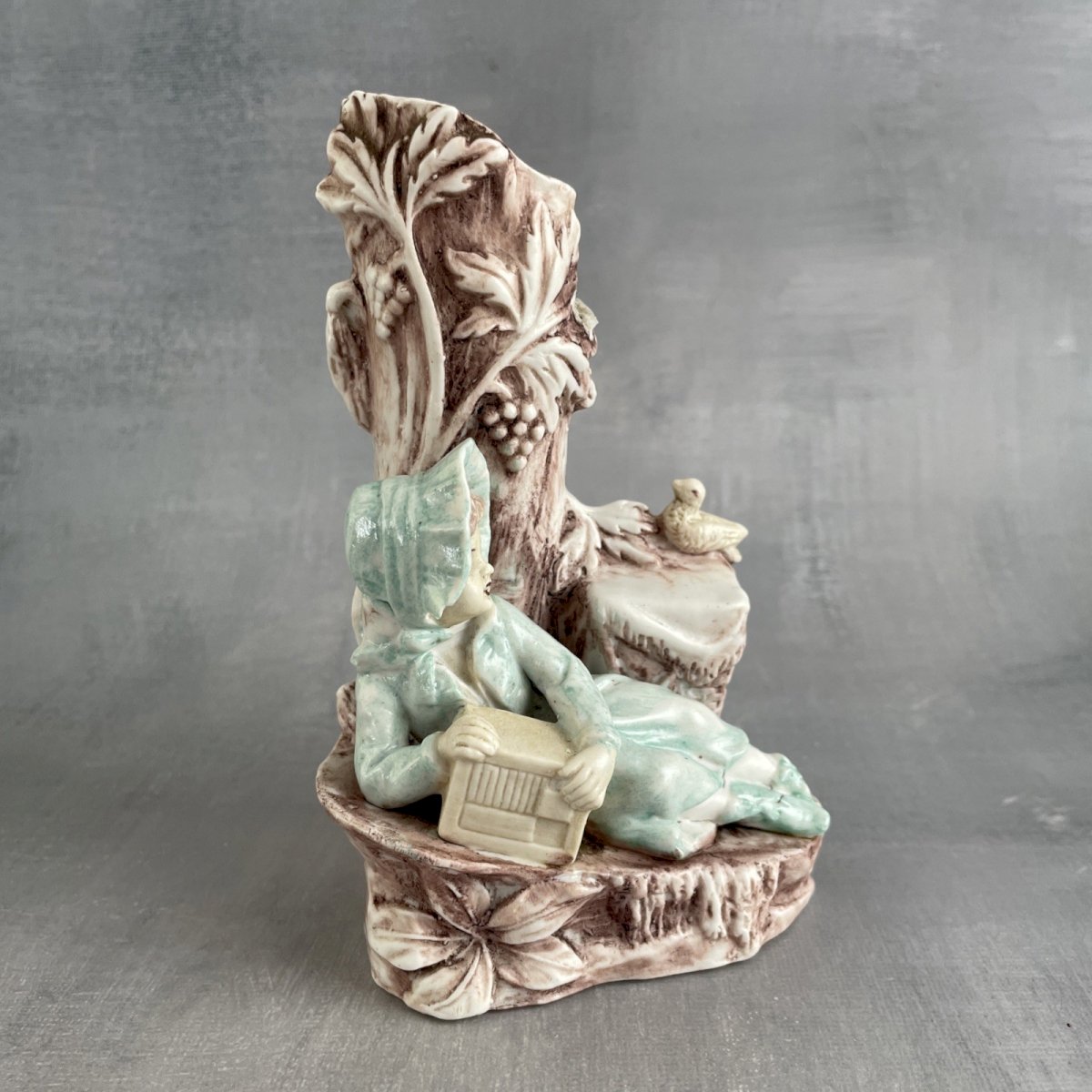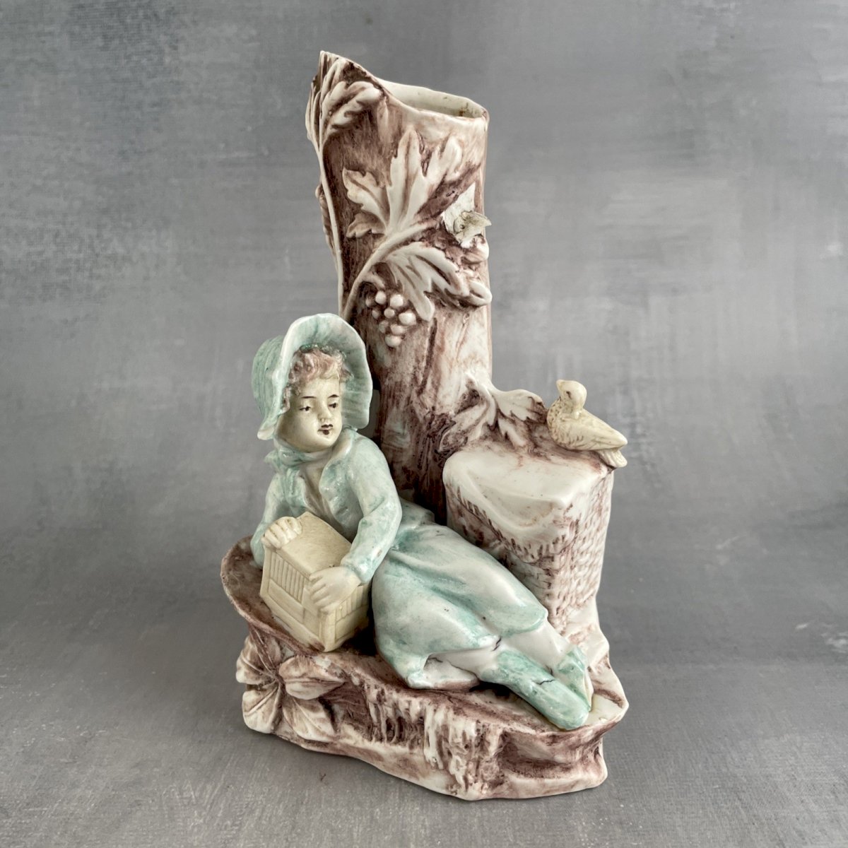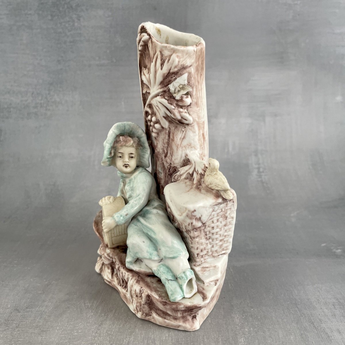 Sujet statuette figurine vase porcelaine biscuit Jeune fille allongé, pique nique au pied des vignes ? marqué 6760 Dimensions ~ 8 x 6.5 cm Hauteur ~ 13.5 cm Poids ~ 0.17 kg Un pied cassé manquant, gros éclat au chapeau, et manque de feuillage, voir photos Pensez à grouper vos achats pour réduire les frais de port ! Type:Objet de vitrine, Décoratif Sous-type:Vase Matière:Porcelaine