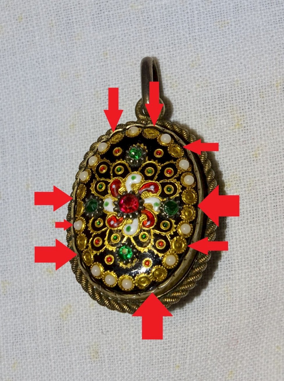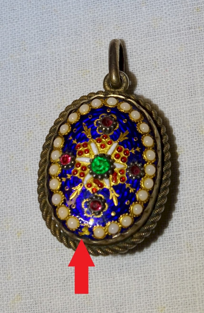 Superbe pendentif émaux Bressans porte photos - manque 13 petites perles blanches autour et une est cassée sur le bord - monture argent vermeil - pas de poinçon visible - pur jus de trouvailles (voir photos) - Réf. 1V260319/18 - Hauteur 3,30 cm - Longueur 2,26 cm - Epaisseur 1,53 cm - Poids 10,34 g - Pour me contacter mon adresse mail : EXPEDITION POSSIBLE EN MONDIAL RELAY ou COLISSIMO sur demande TRES BON EMBALLAGE GARANTI MERCI de BIEN REGARDER TOUTES les PHOTOS car ELLES FONT PARTIE INTEGRANTE de la DESCRIPTION et PERMETTENT de VOIR l'OBJET AU MIEUX avec SES PETITS DEFAUTS EVENTUELS -