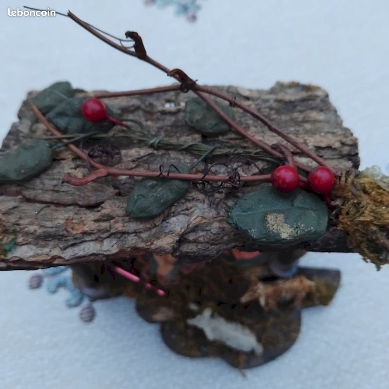 Réalisée en bois avec éléments végétaux naturels, les personnages sont peints à la main.