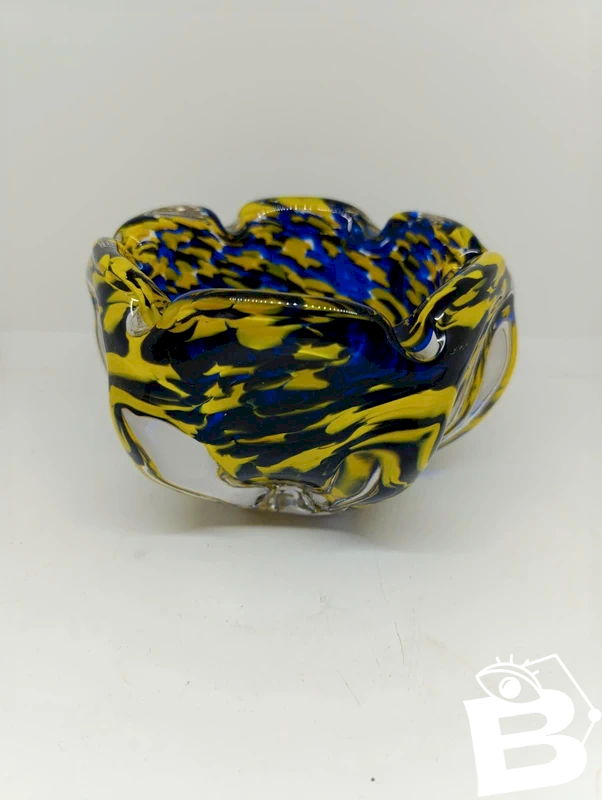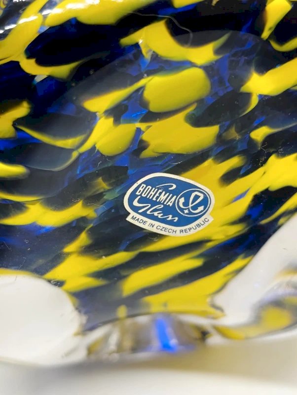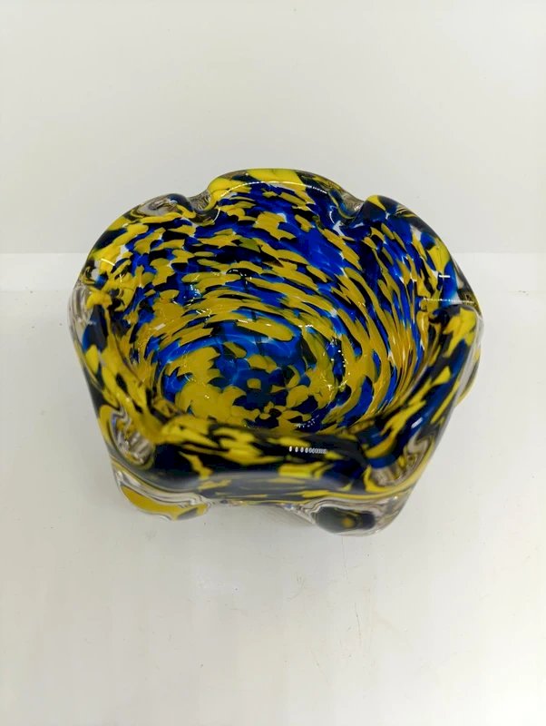superbe vide poche/cendrier en verre de boheme en bon etat magnifique melange de couleur jaune et bleu diametre 16cm hauteur 11cm petites marques d'usures normale d'utilisation