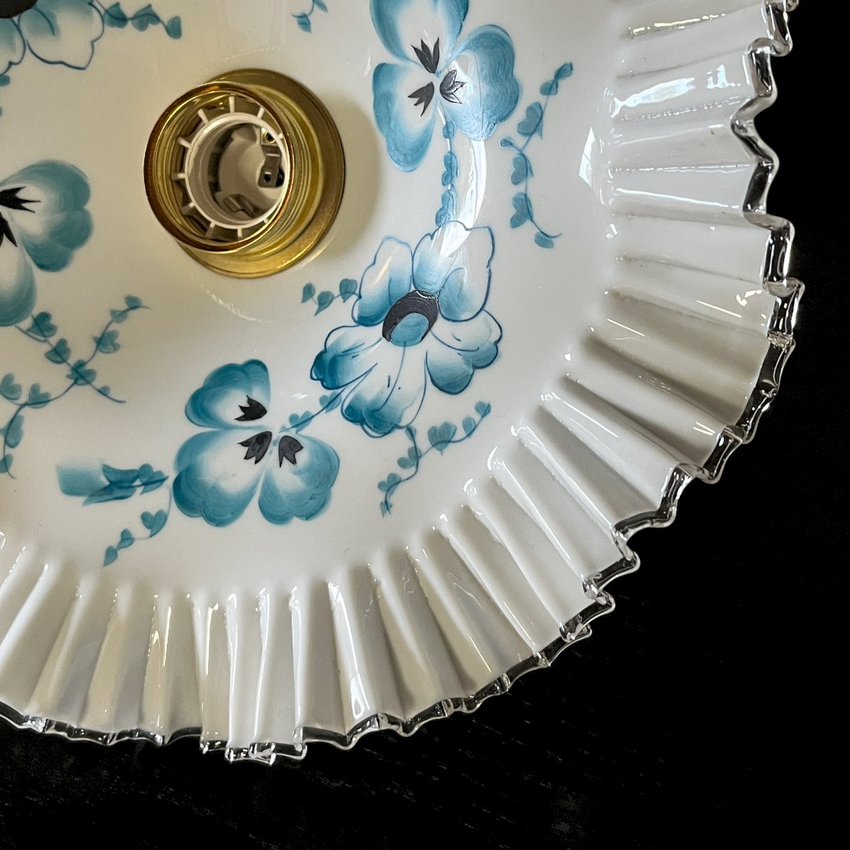 Très originale, cette belle suspension a un abat-jour en opaline blanche et est ornée de fleurs bleues au revers. Le pourtour est joliment dentelé. Look résolument vintage. Très bel état.
