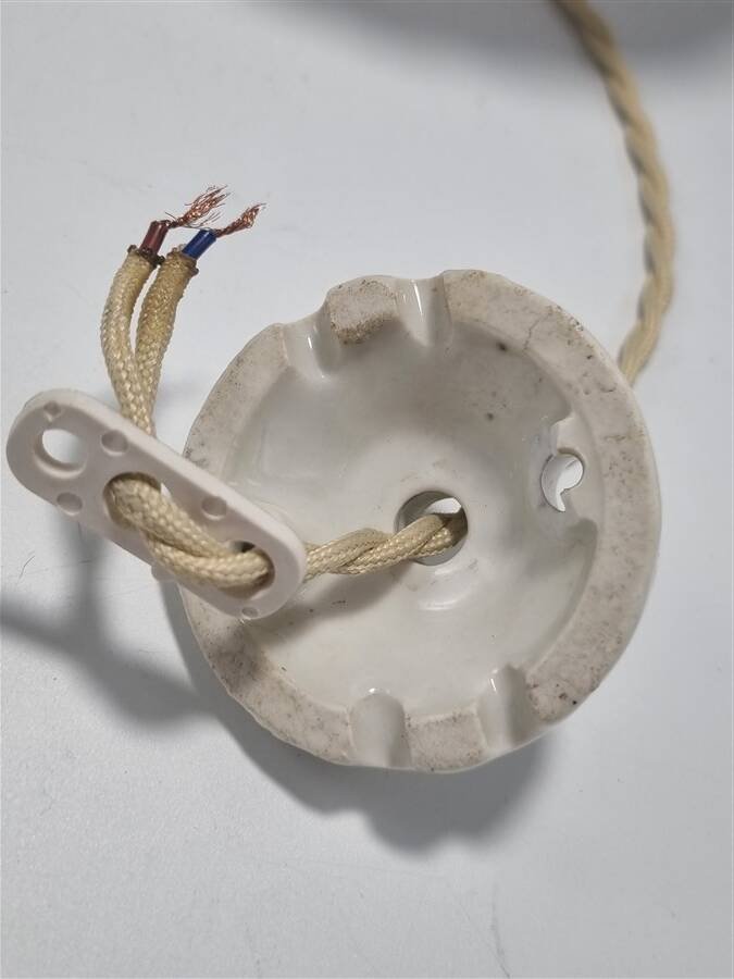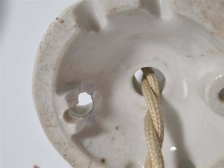 (voir photo.)L'ancienne rosace cache-fixation en céramique présente de petits accidents (voir photo.)Diamètre du globe: 21 cm.Hauteur totale: ajustable jusqu'à 95 cm.Poids: 1.070 kg.