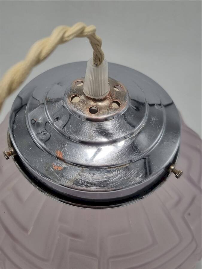 Suspension art déco en verre rosé.La griffe en cuivre chromé est un peu cabossée et laisse apparaître la couleur du cuivre par endroits.