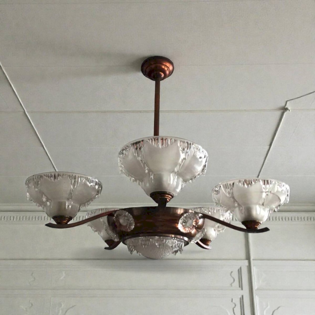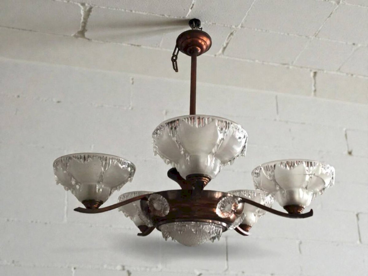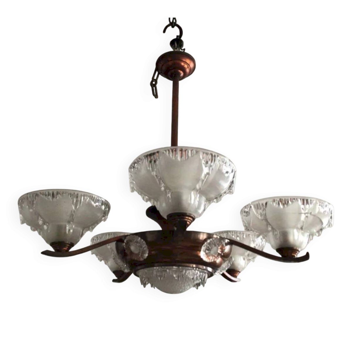 Lustre en cuivre et tulipe en pâte de verre d’époque art déco.Tout est en bon état.Le cuivre est patiné et traces d’usage habituelles.On notera qu’une tulipe a été recollée.Elle reste solide, pas de manque.Les tulipes sont marquées ezan.