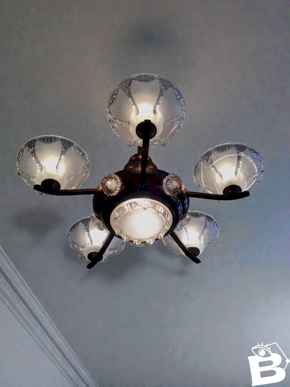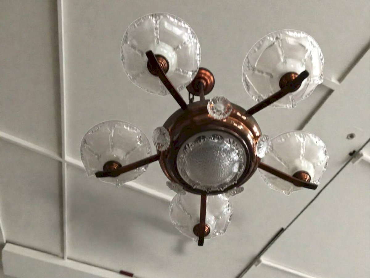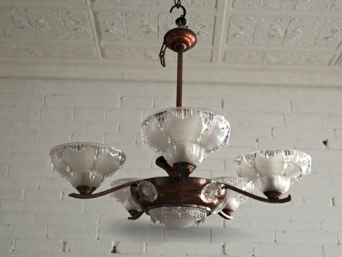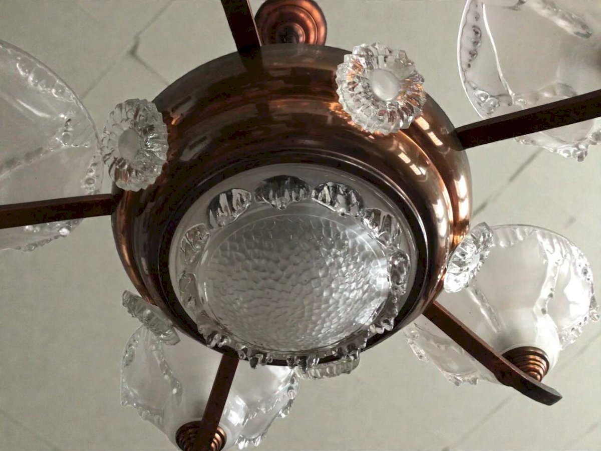 Lustre en cuivre et tulipe en pâte de verre d’époque art déco.Tout est en bon état.Le cuivre est patiné et traces d’usage habituelles.On notera qu’une tulipe a été recollée.Elle reste solide, pas de manque.Les tulipes sont marquées ezan.