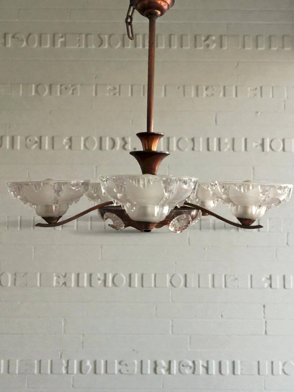 suspension ou lustre art déco légèrement rose marron signée Dégué