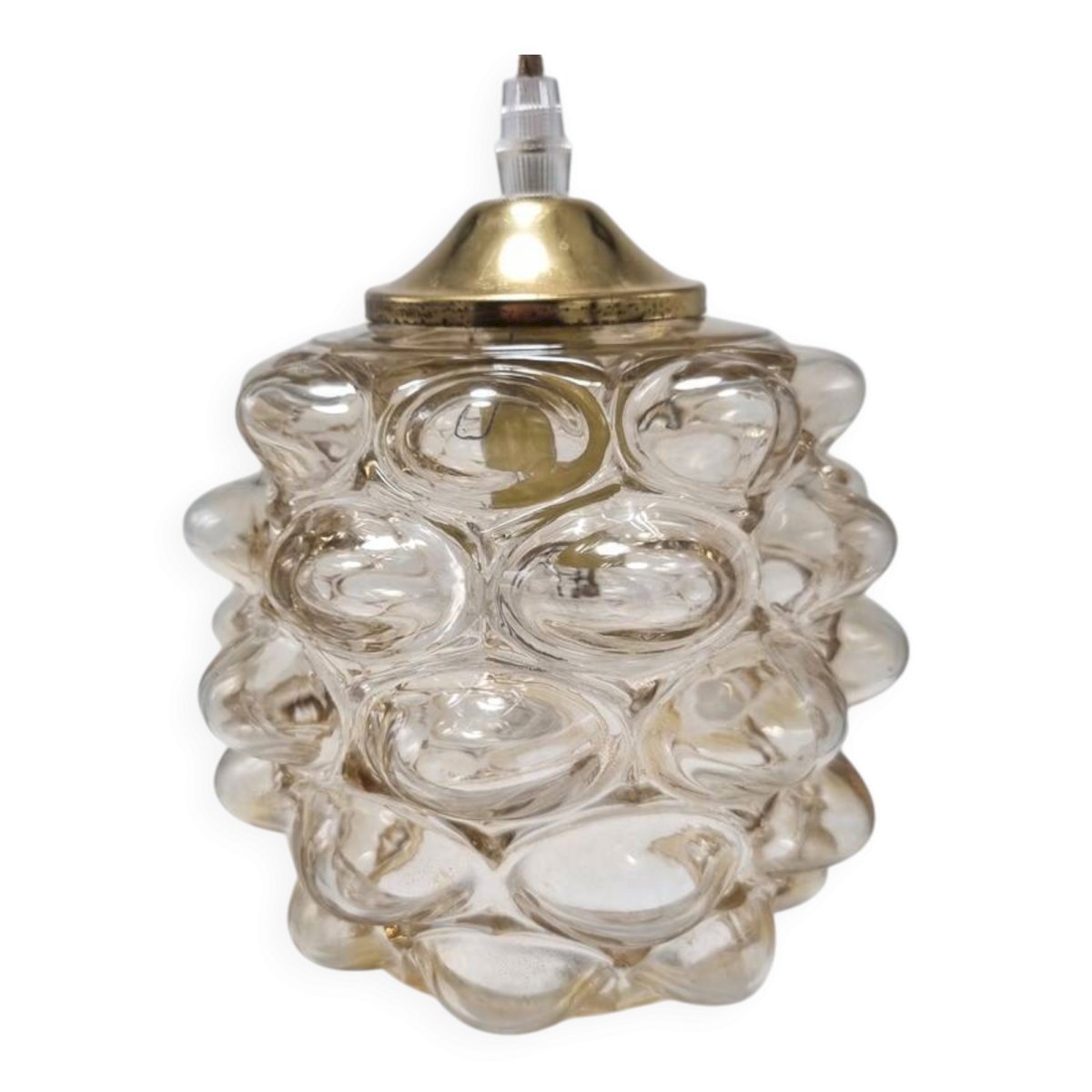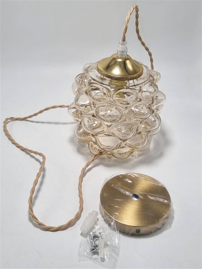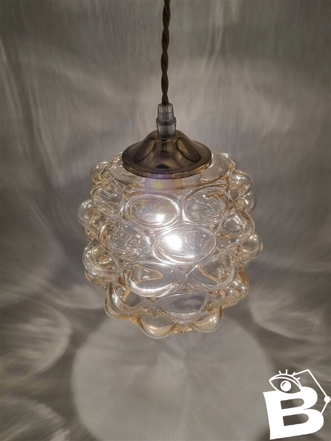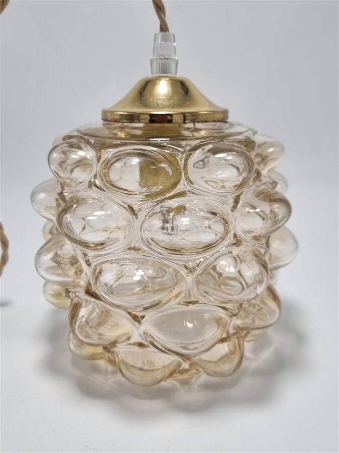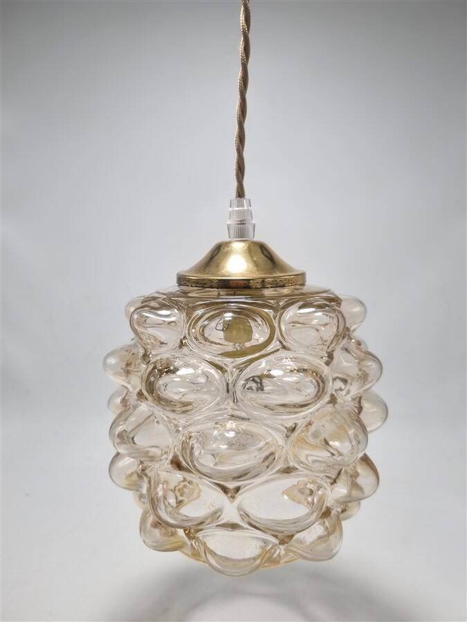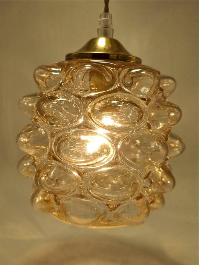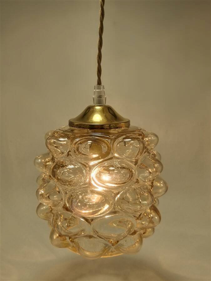 Suspension vintage Bubble par Helena Tynell, en verre couleur ambrée, relief en forme de bulles.Douille E14Dimensions du globe : H14 x ø 16 cmCâble ajustable jusqu'à 110 cmVendue avec un cache-fixation en métal couleur or.Poids : 840 g environ