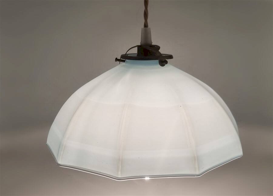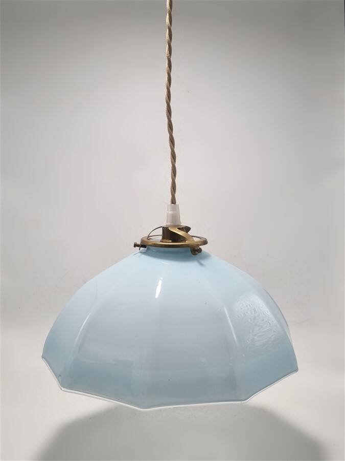 Suspension art déco en opaline bleu ciel.Douille E14.Câble ajustable jusqu'à 110 cm.Dimensions du globe en opaline: 24 X 10 cm.Poids: 600 g.