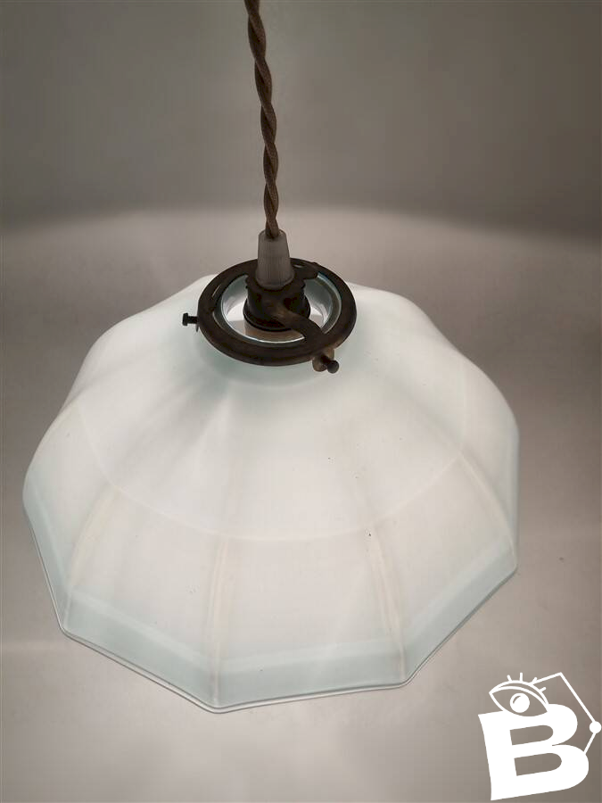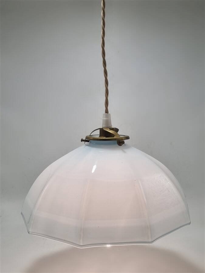 Ancienne Grande Suspension Lustre De Billard/Laiton Verre Opaline/Bar Ancien