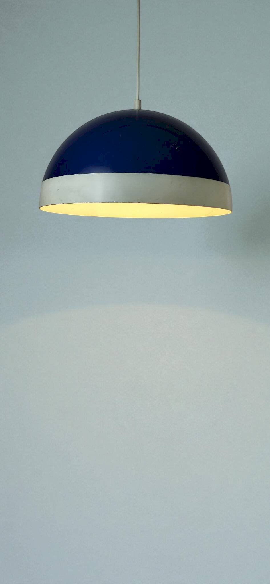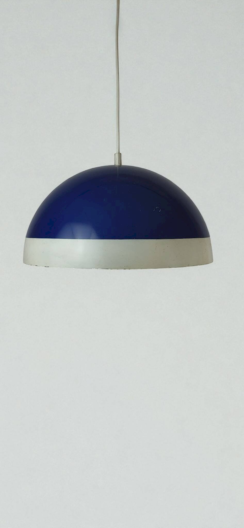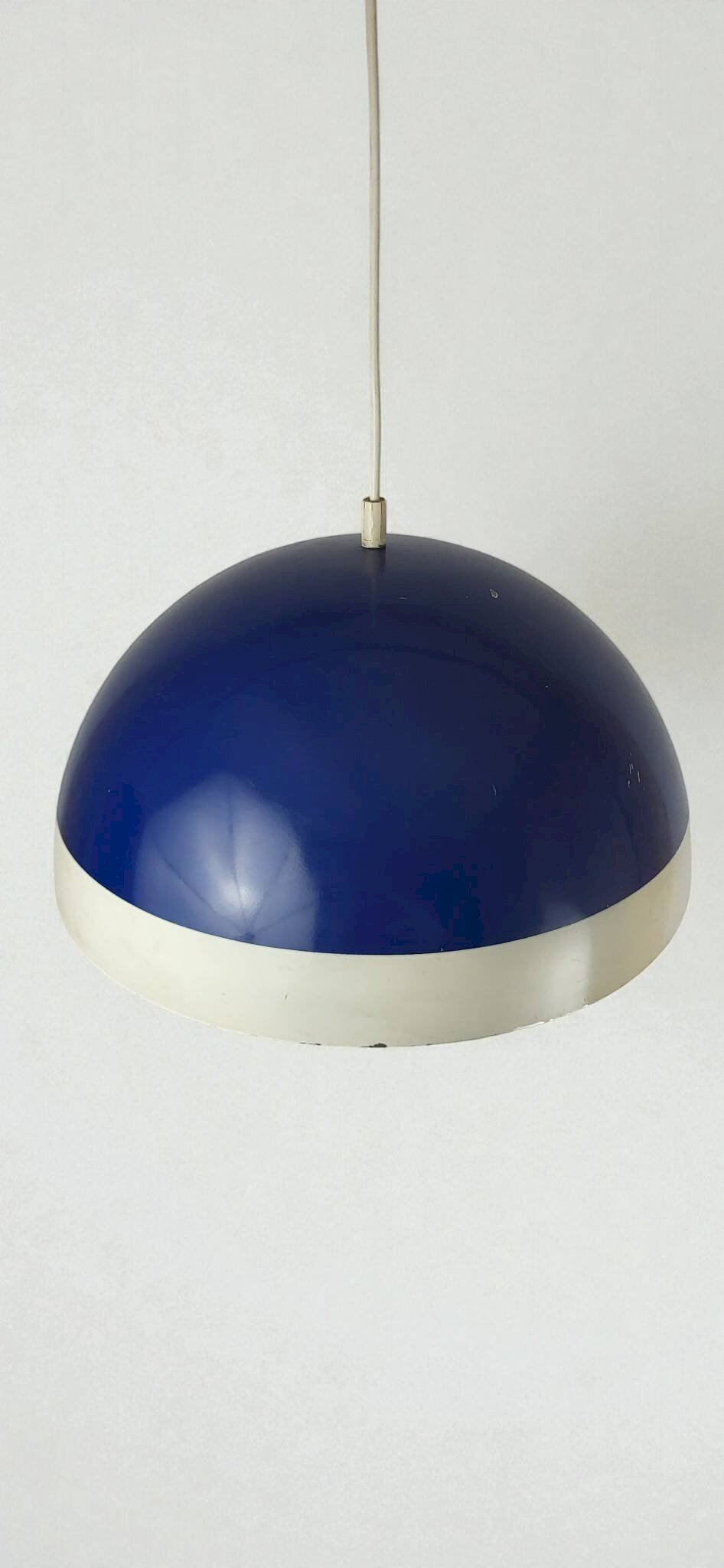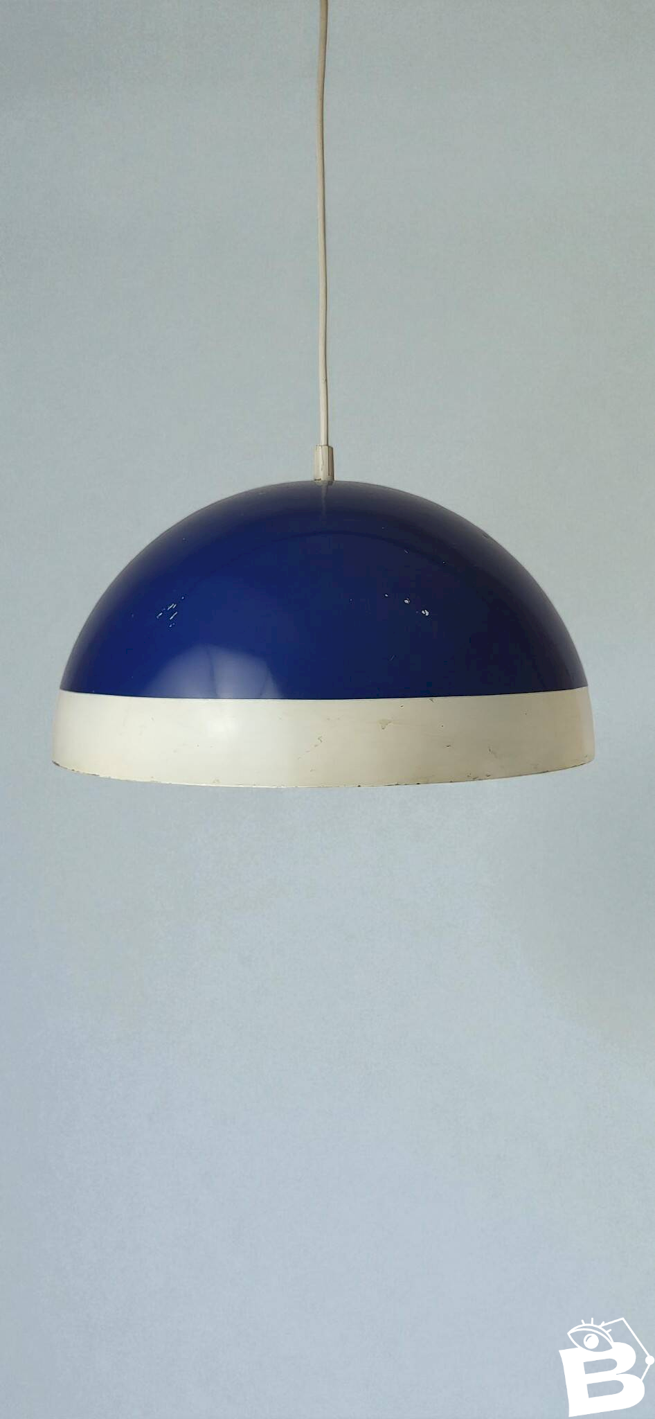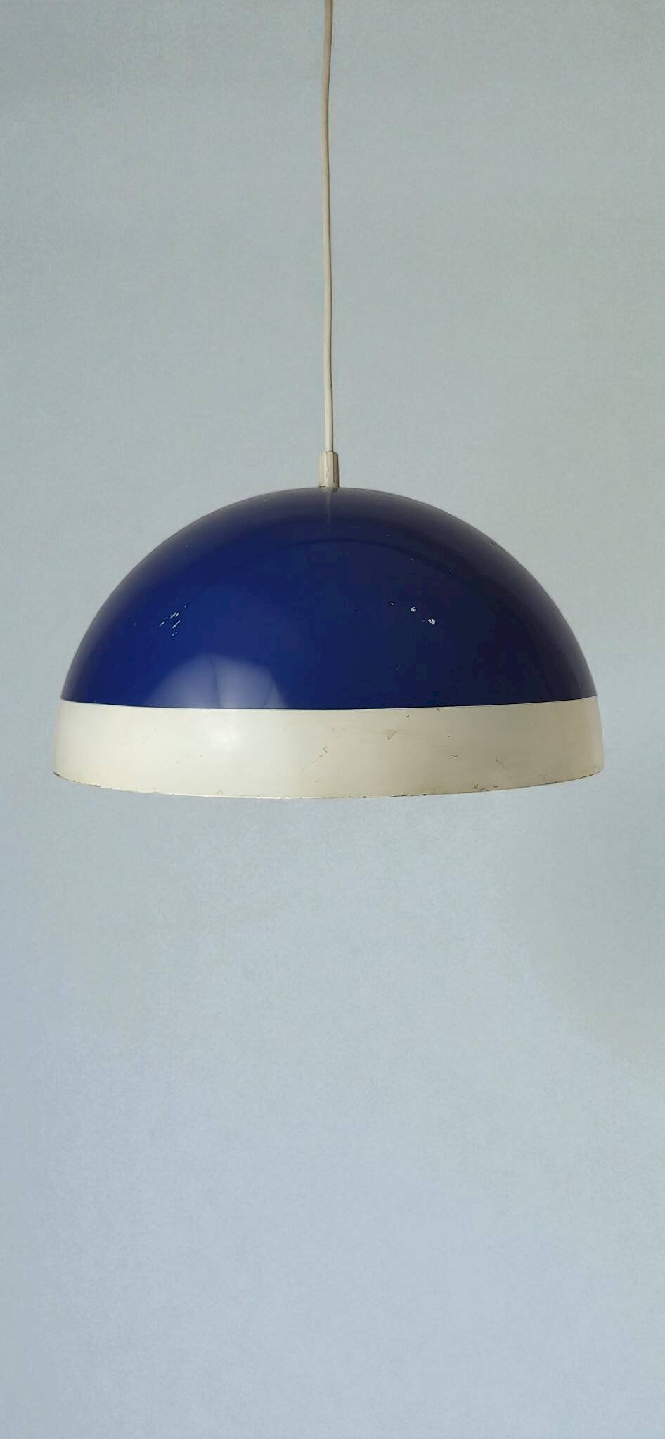 Suspensions en tôle laquée bleu et blanc cassé.Ancien éclairage de Mac Donald's.Hauteur Max 60 cm.Diamètre 40 cm.Hauteur Réflecteur 20 cm.Quelques rayures et état d'usage.