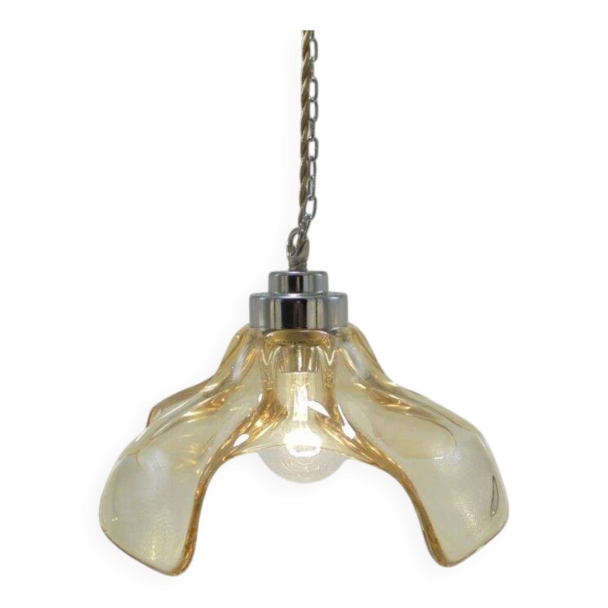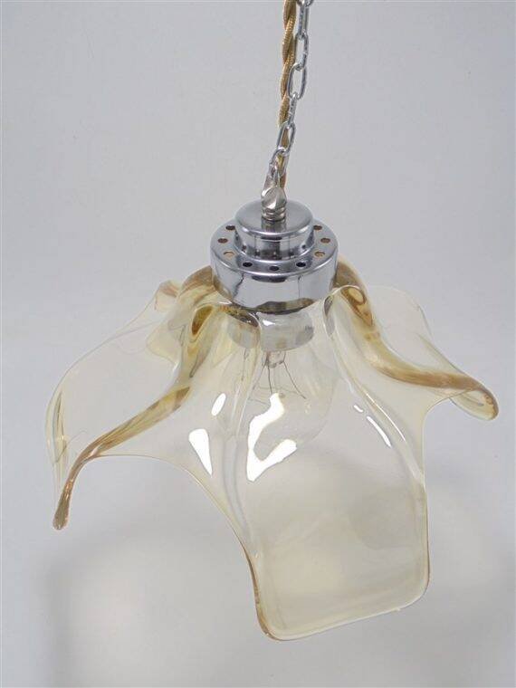 Suspension en verre de Murano couleur or.Superbe design.Douille e27.Largeur: 26 cm.Hauteur du verre: 12.5 cm.Longueur du câble et de la chaînette: 80/85 cm.Poids: 1.4 kg.