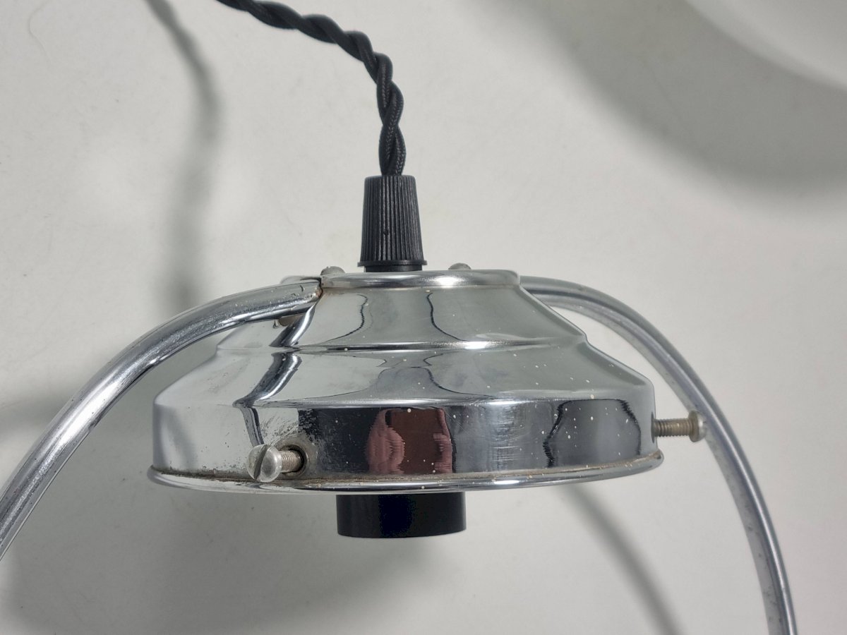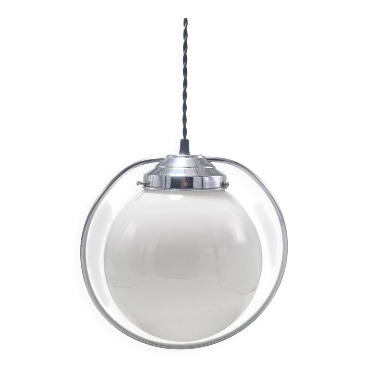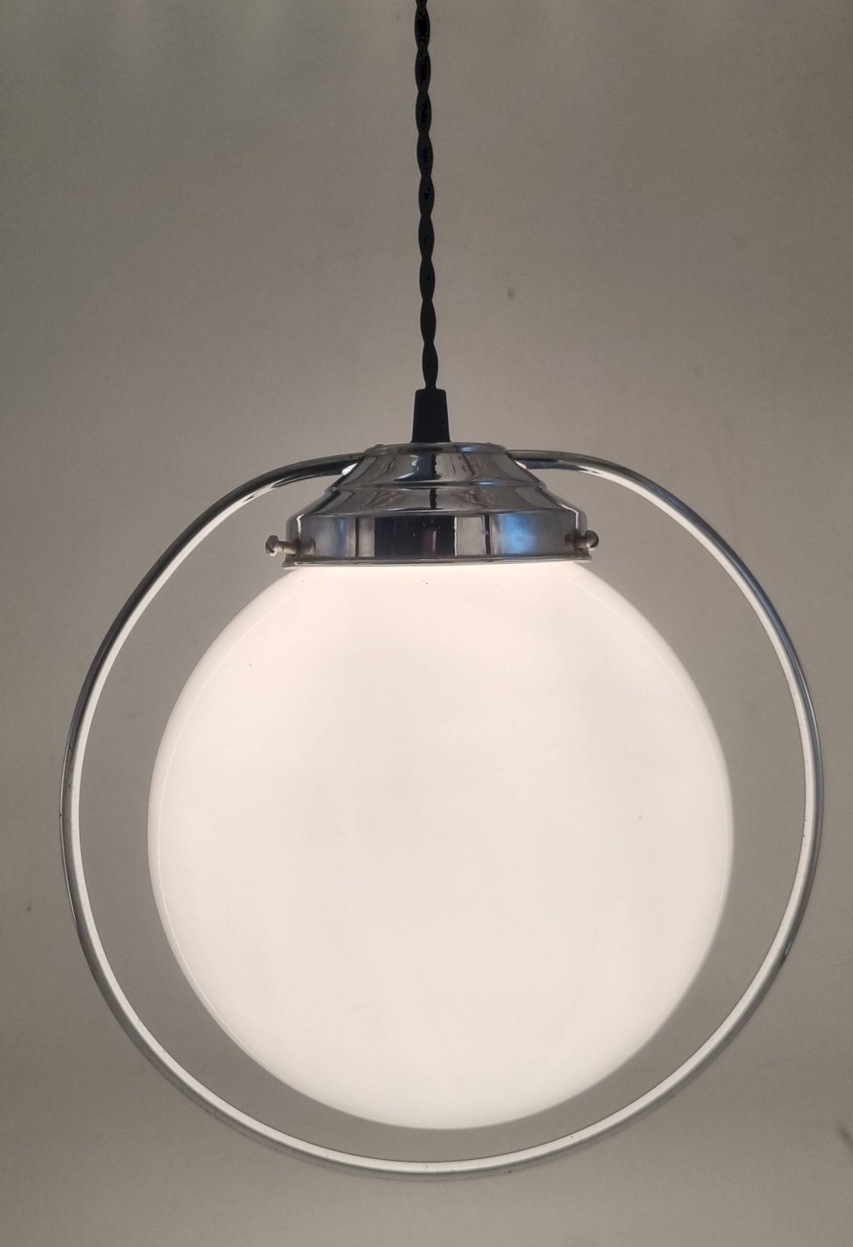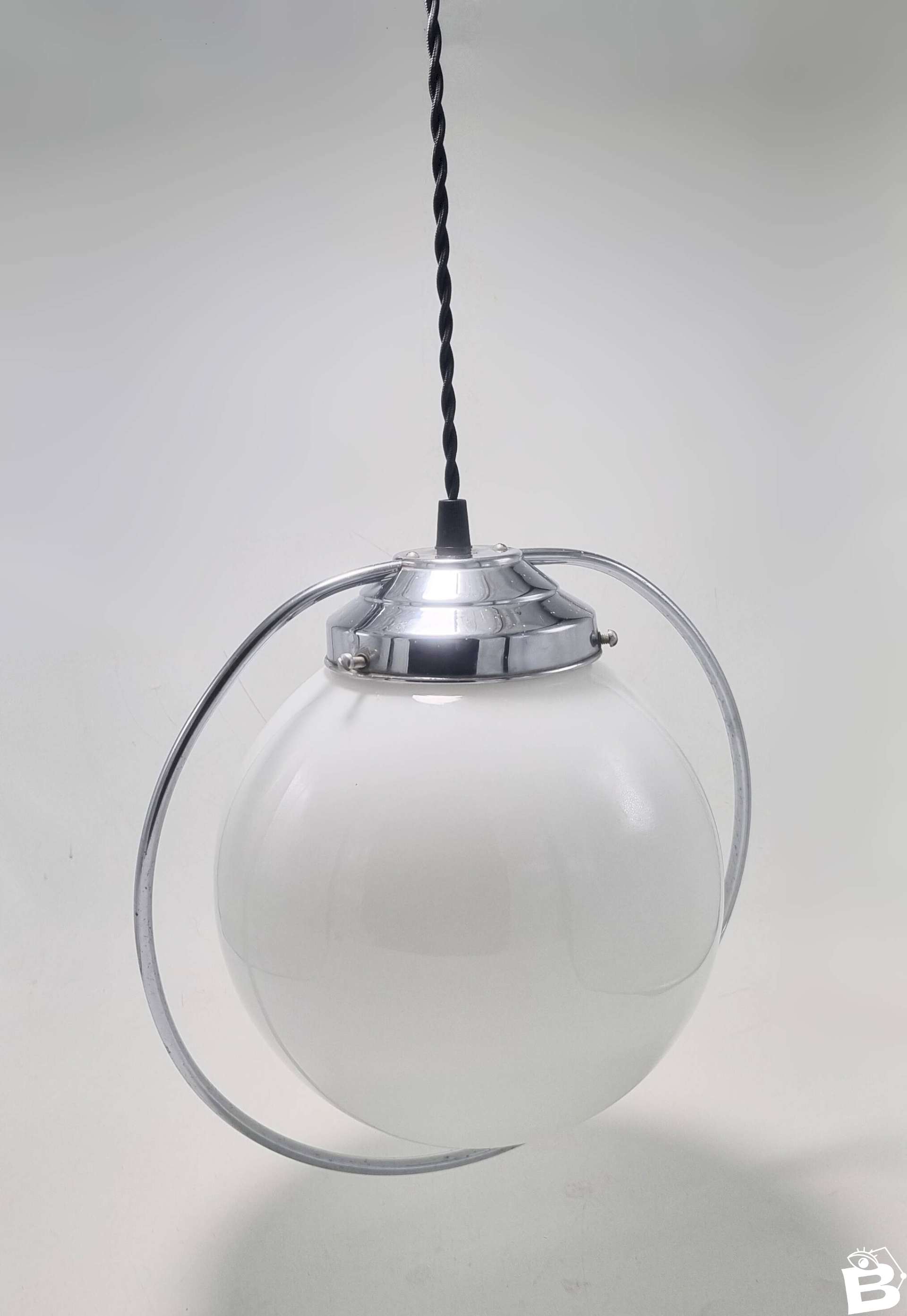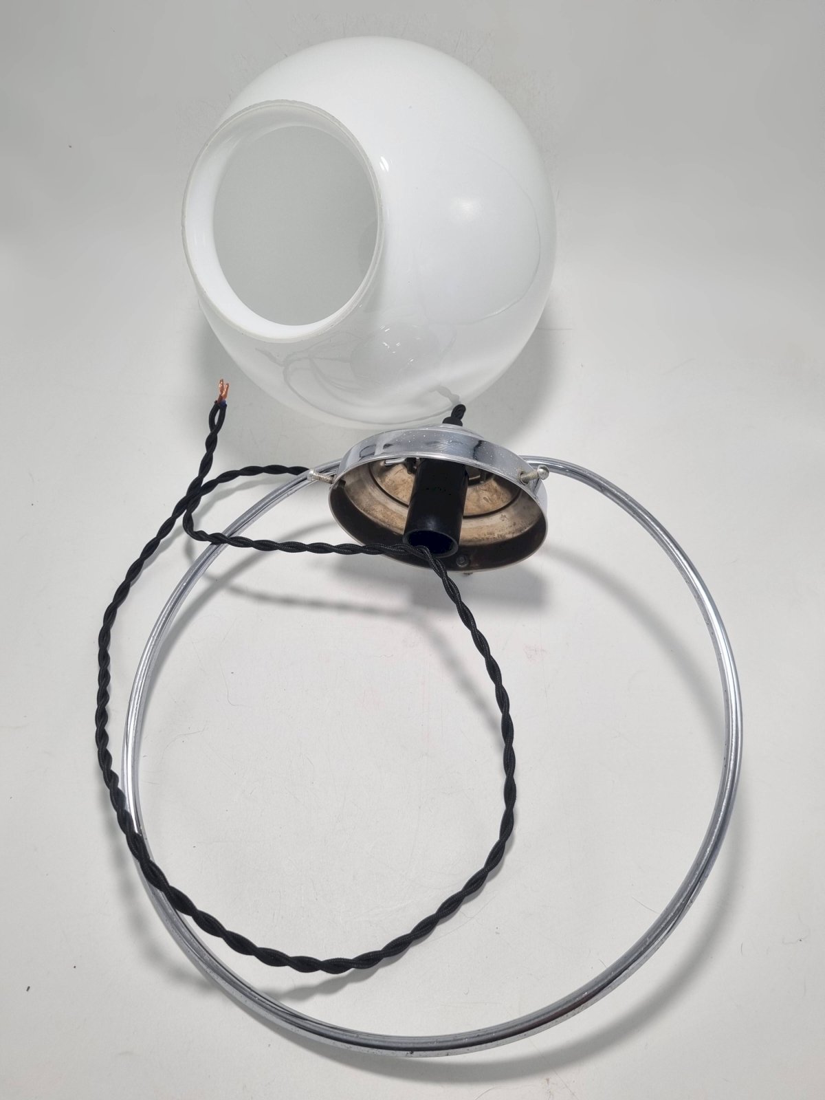 Suspension art déco globe en opaline.Le chrome porte de discrètes traces de son vécu, visibles sur les photo.Vendue sans cache-fixation, contactez-moi si vous en avez besoin.Douille E14.Câble ajustable jusqu’à 100 cm.Diamètre du globe: 20 cm.Poids: 820 g.