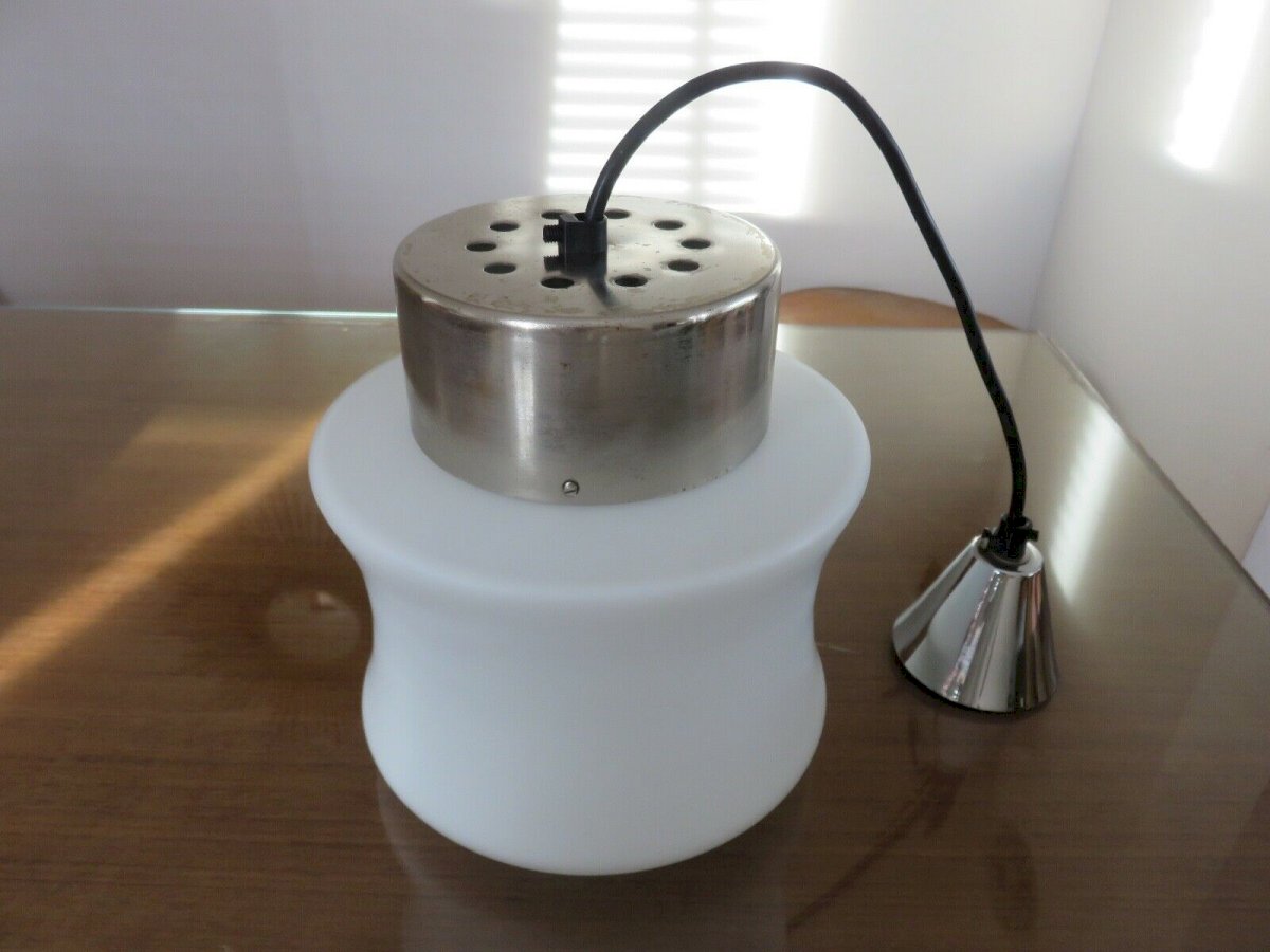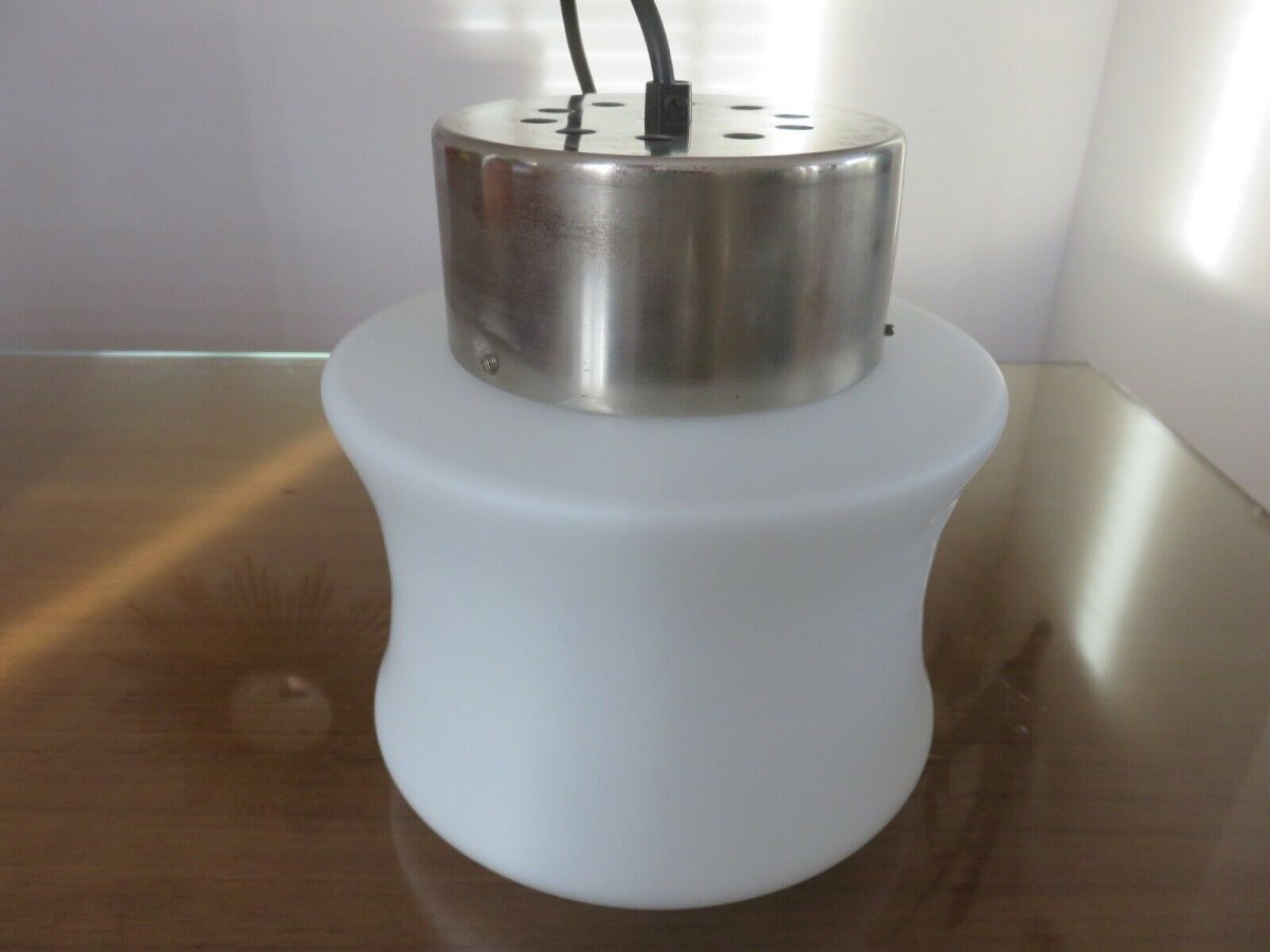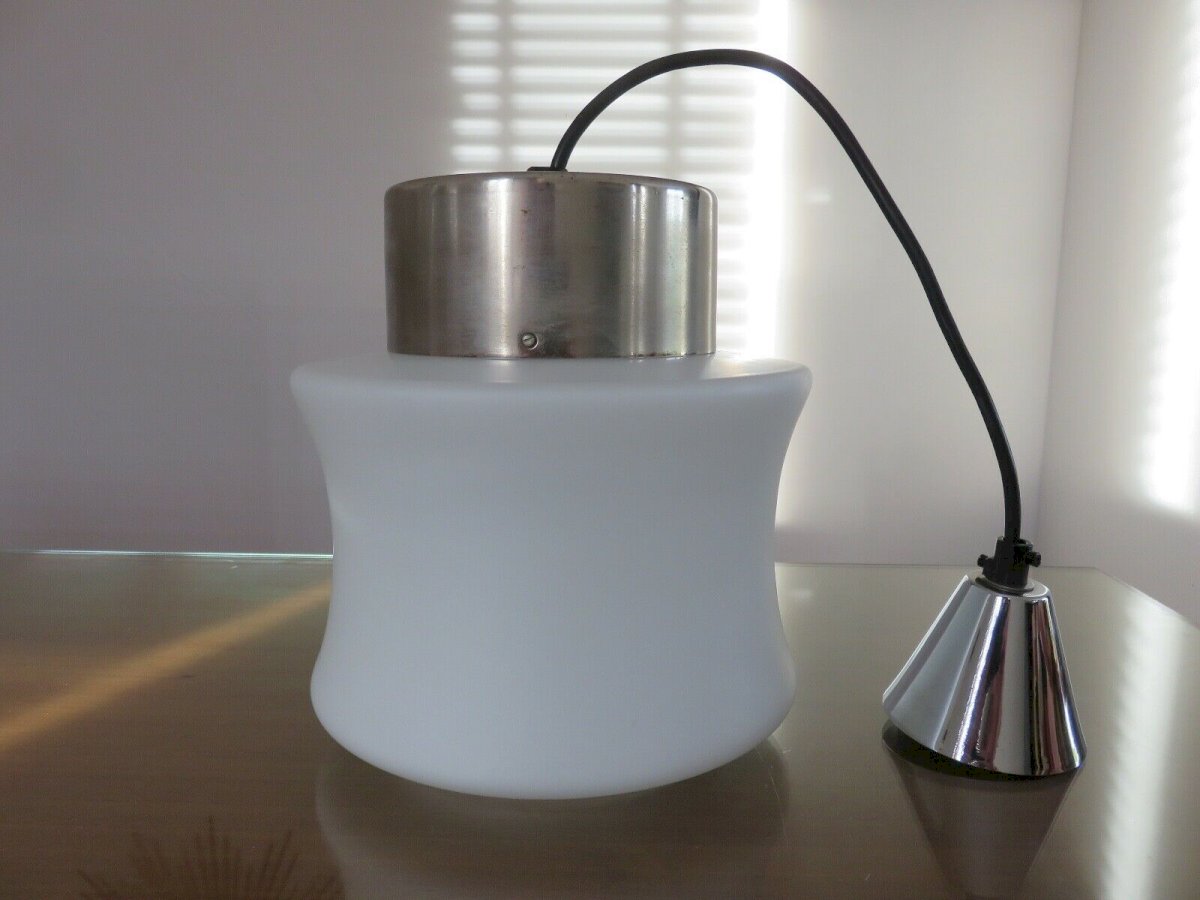 SUSPENSION SCANDINAVE EN OPALINE ET METAL CHROME ANNEES 60 70 HAUTEUR 22 CM HAUTEUR SOUS PLAFOND ( REGLABLE ) 60 CM DIAMETRE 19 CM LE DIFFUSEUR EN VERRE OPALIN BLANC EST EPAIS, DE TRES BONNE QUALITE ET EN BON ETATLES CHROMES COMPORTENT DES TRACES VISIBLES SUR PHOTOS MAIS ILS SONT EN ETAT TRES CORRECT DOUILLES A VIS GROS CULOT E27 LIVRE SANS AMPOULE PARFAIT ETAT DE FONCTIONNEMENT ENVOI EN EMBALLAGE TRES SOIGNE
