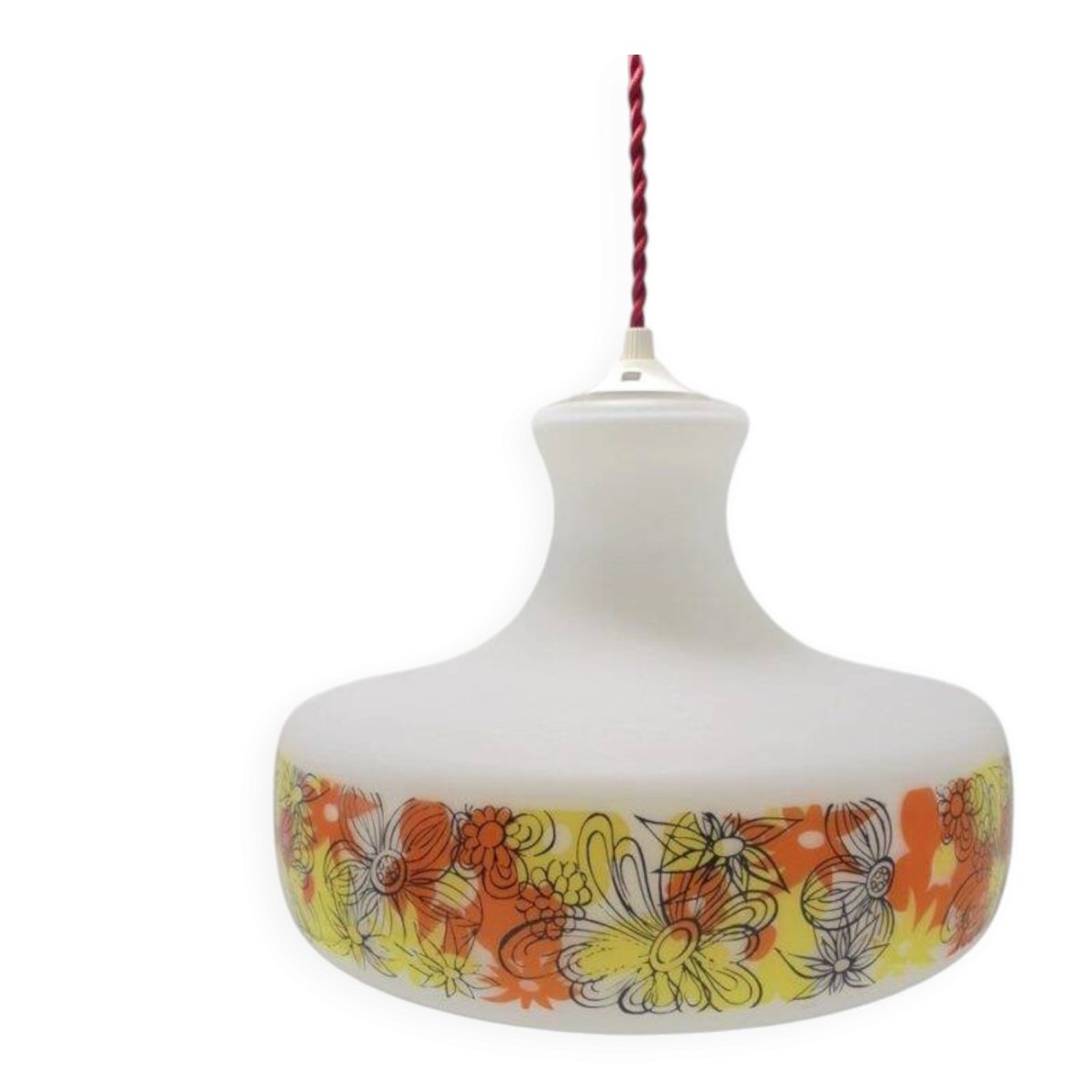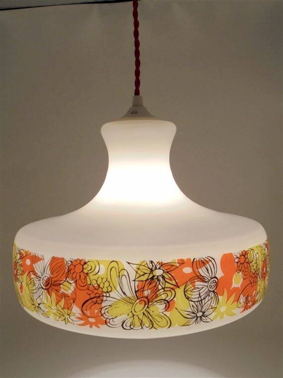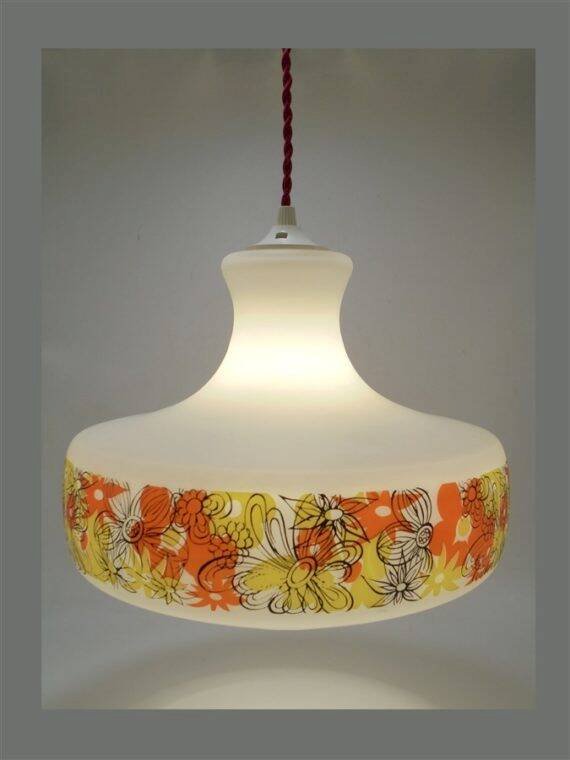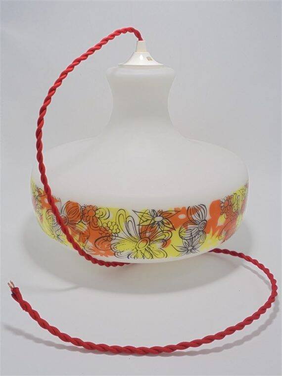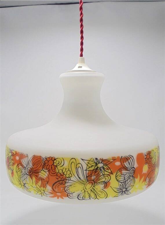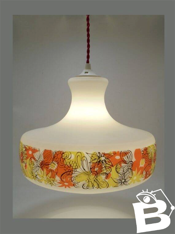 Suspension au décor floral vintage.Douille e27.Diamètre: 29 cm.Hauteur: 22.5 cm.Longueur du câble: 90 cm.