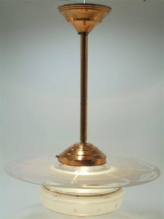 Suspension verre doré. Abat-jour ambré ancien Vintage