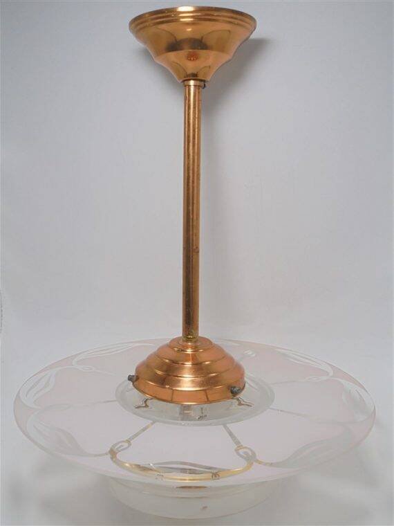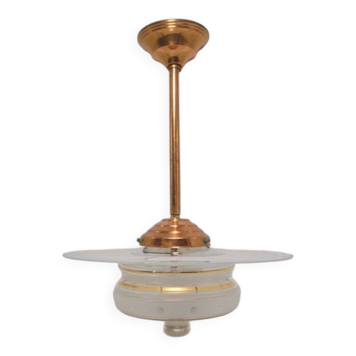 Lustre vintage.Composé d'un globe en verre,D'un plateau circulaire en verre qui se pose simplement sur le globe, le tout sur une tige cuivrée.Douille b22.Hauteur: 46 cm.Largeur: 35 cm.Poids: 1.450 kg.