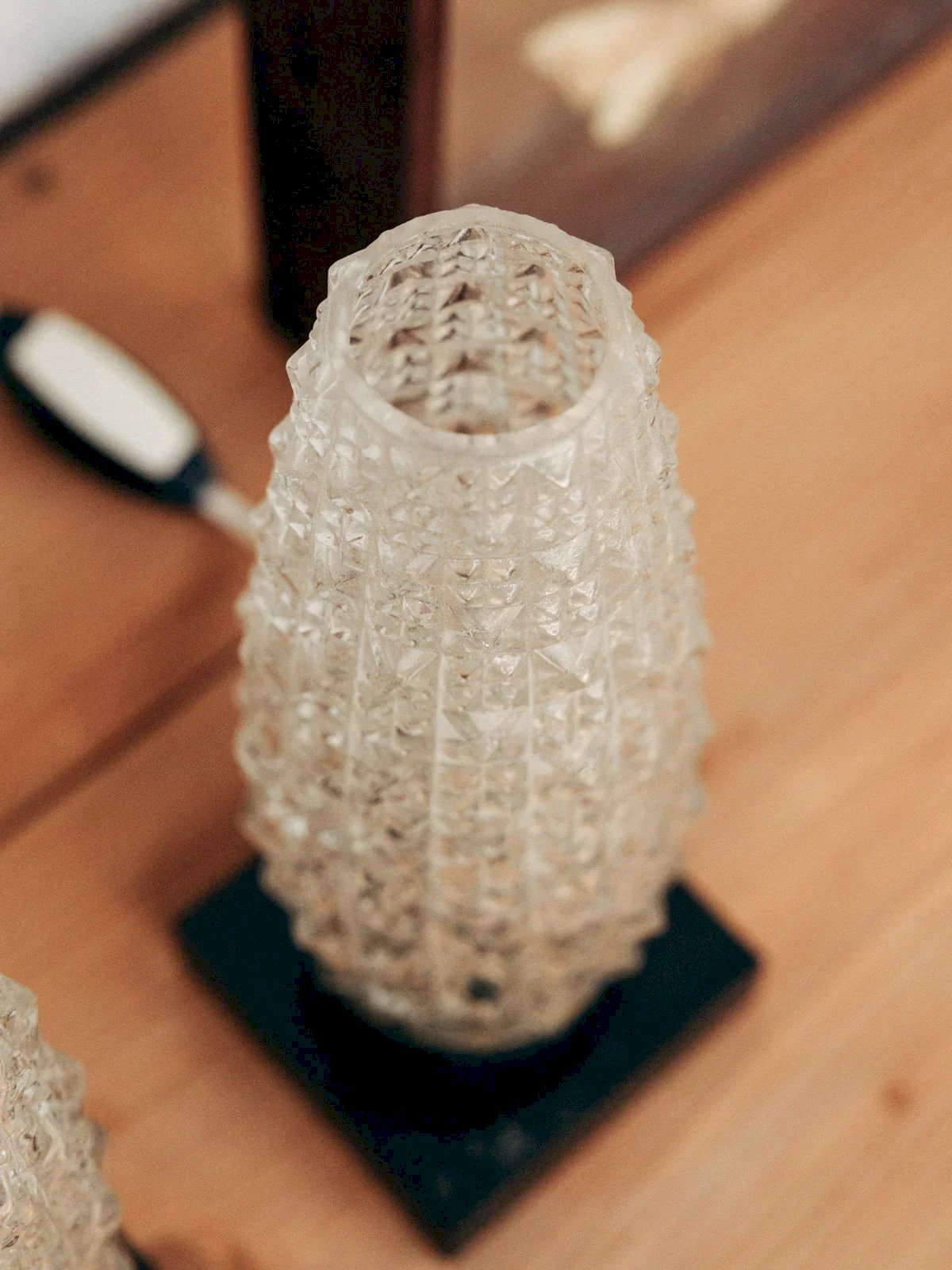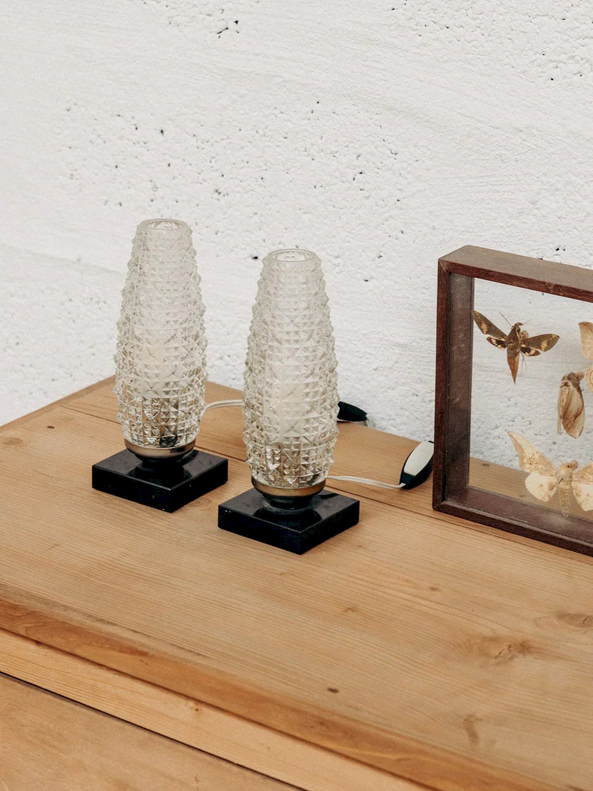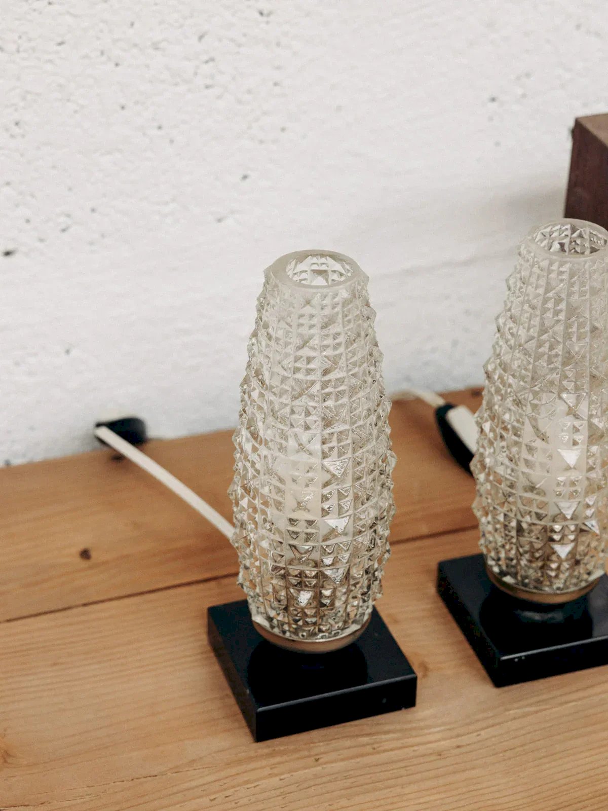 Cette jolie paire d’appliques raffinée diffuse une lumière douce et enveloppante, parfaite pour créer une ambiance chaleureuse. Leur design intemporel s’accorde aussi bien aux intérieurs classiques qu’aux ambiances plus modernes. À placer dans une entrée, un salon ou même une chambre, elles apportent cette petite touche lumineuse qui change tout. Un duo élégant pour faire briller vos murs avec style. Longueur : 8 cm Largeur : 8 cm Hauteur : 22,5 cm État:Occasion: Objet ayant été utilisé. Objet présentant quelques marques d'usure superficielle, ...Occasion: Objet ayant été utilisé. Objet présentant quelques marques d'usure superficielle, entièrement opérationnel et fonctionnant correctement. Il peut s'agir d'un modèle de démonstration ou d'un objet retourné en magasin après une courte période d'utilisation. les éventuelles imperfections. Marque:Debongout Type:Produit chiné Style:Campagne Matériau:Verre, Métal Vintage:Oui