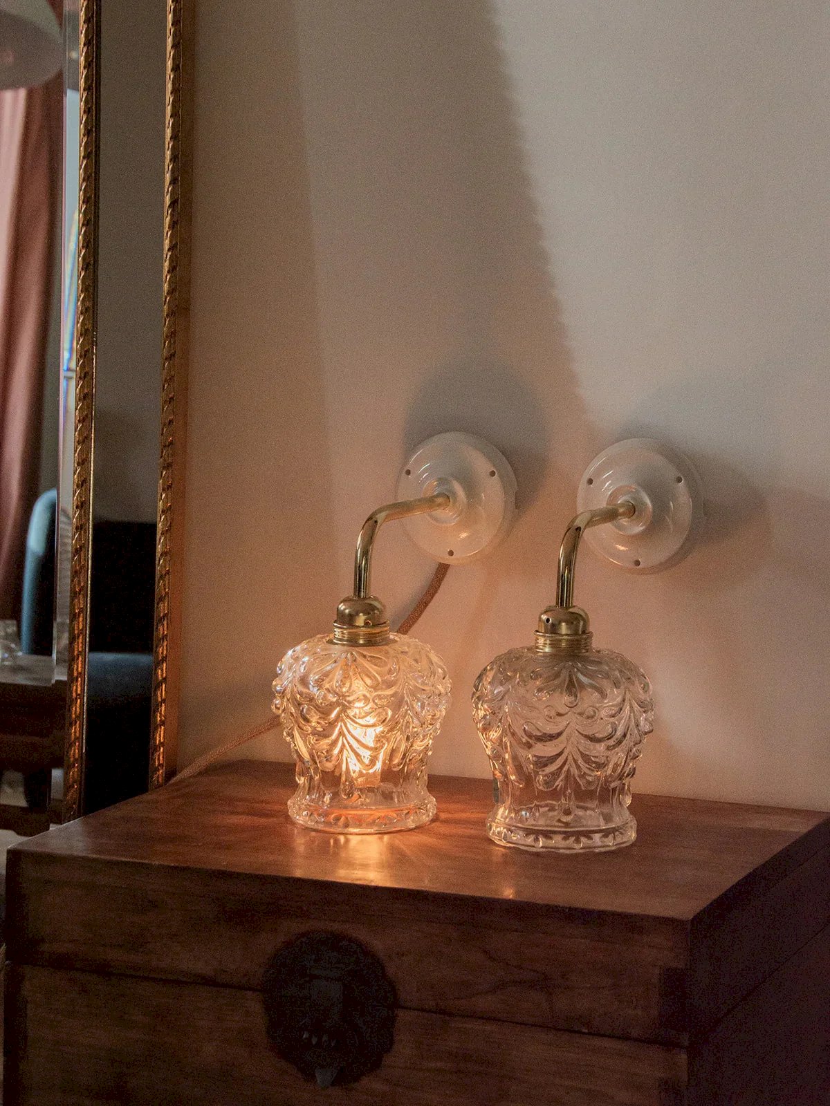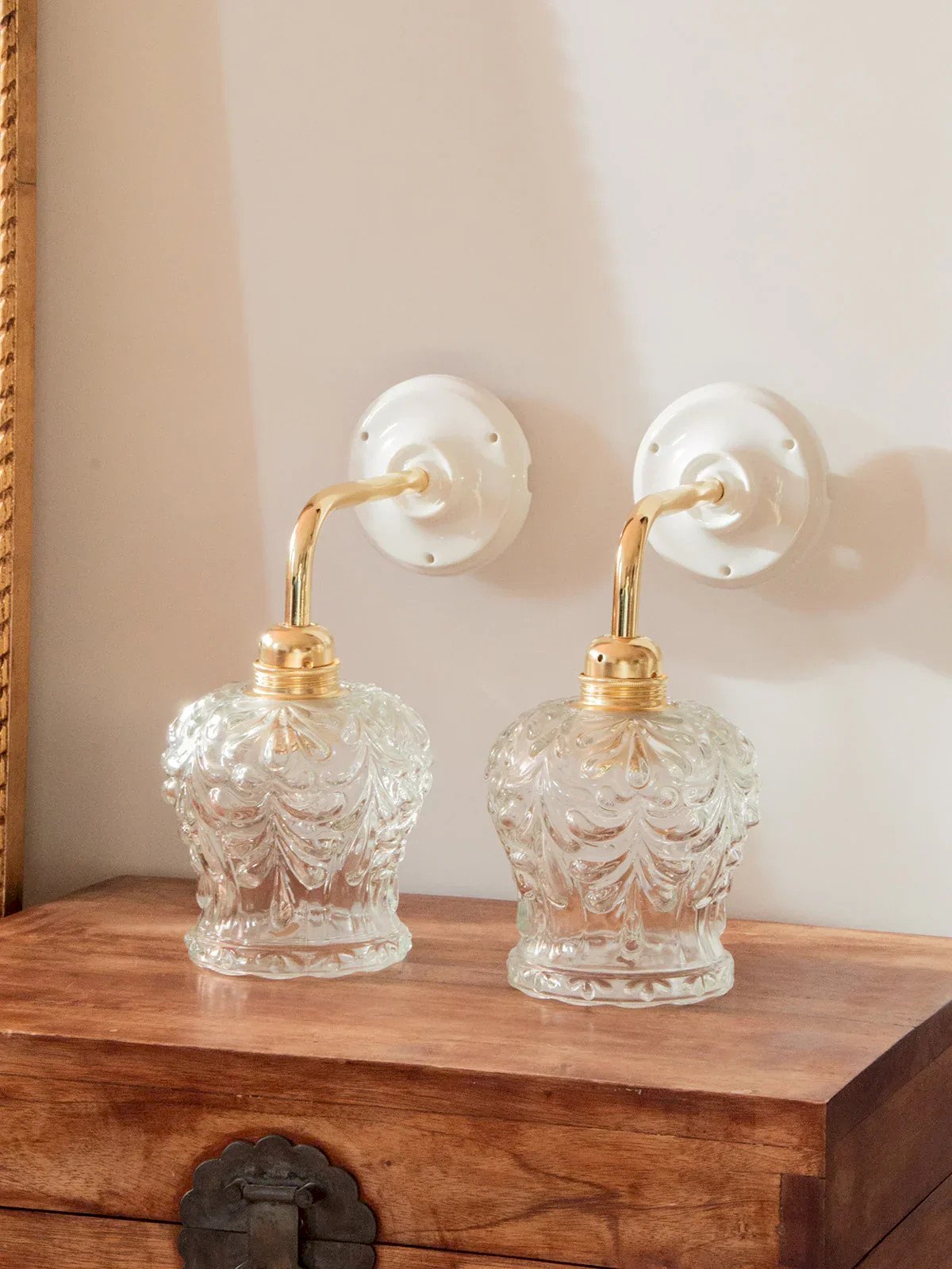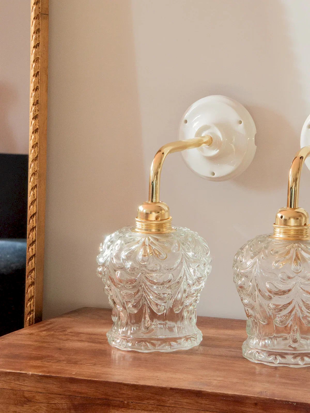 Suzette, c'est la version applique de nos Paulette ! Ces lampes à fixer au mur sont composées d'un globe en verre chiné. La petite touche vintage et sophistiquée parfaite pour styliser une chambre ou un salon. Chaque applique upcyclée est unique, montée à la main en France sur un bras doré et une base en porcelaine qui apporte une finition raffinée. La douille E27 et le wagon de raccordement assurent une installation simple et sécurisée. Conformes aux normes CE, ces appliques sont parfaites pour illuminer votre espace avec style. Nous adorons ces lampes Suzette pour leurs globes en verre moulé pressé. Vendues sans ampoule. Exclusivité web, la rencontre se fera chez vous ! Largeur : 13 cm Hauteur : 27 cm Profondeur : 23 cm État:Occasion: Objet ayant été utilisé. Objet présentant quelques marques d'usure superficielle, ...Occasion: Objet ayant été utilisé. Objet présentant quelques marques d'usure superficielle, entièrement opérationnel et fonctionnant correctement. Il peut s'agir d'un modèle de démonstration ou d'un objet retourné en magasin après une courte période d'utilisation. les éventuelles imperfections. Marque:Debongout Type:Produit chiné Style:Campagne Matériau:Verre Vintage:Oui