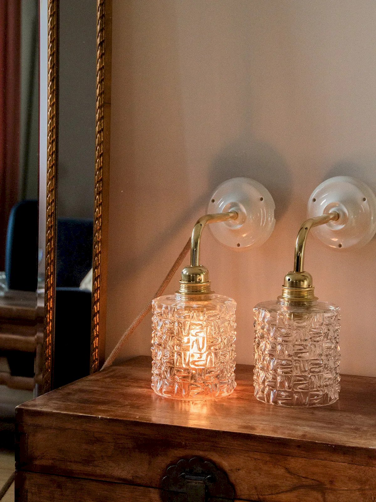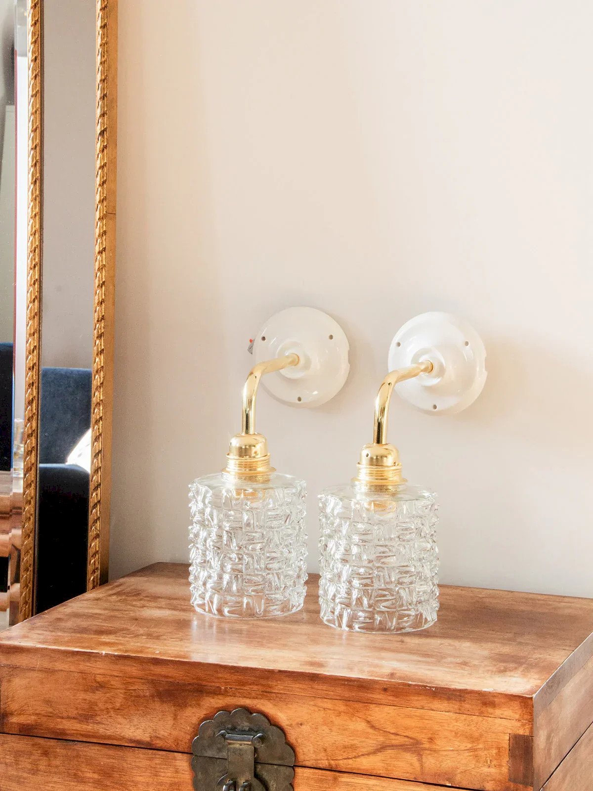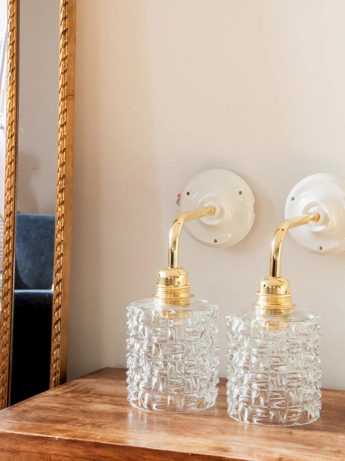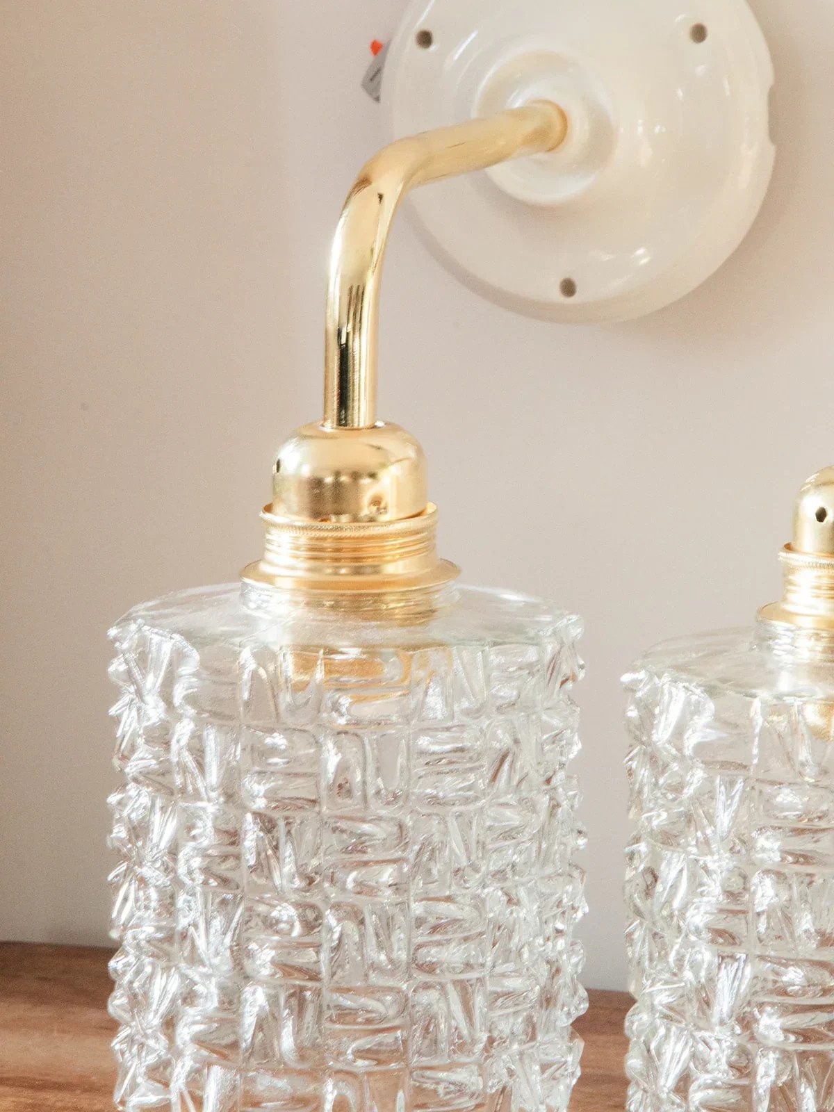 Suzette, c'est la version applique de nos Paulette ! Ces lampes à fixer au mur sont composées d'un globe en verre chiné. La petite touche vintage et sophistiquée parfaite pour styliser une chambre ou un salon. Chaque applique upcyclée est unique, montée à la main en France sur un bras doré et une base en porcelaine qui apporte une finition raffinée. La douille E27 et le wagon de raccordement assurent une installation simple et sécurisée. Conformes aux normes CE, ces appliques sont parfaites pour illuminer votre espace avec style. Nous adorons ces Suzette pour leur verrerie moulée. Vendue sans ampoule. Exclusivité web, la rencontre se fera chez vous ! Largeur : 11 cm Hauteur : 27 cm Profondeur : 23 cm État:Occasion: Objet ayant été utilisé. Objet présentant quelques marques d'usure superficielle, ...Occasion: Objet ayant été utilisé. Objet présentant quelques marques d'usure superficielle, entièrement opérationnel et fonctionnant correctement. Il peut s'agir d'un modèle de démonstration ou d'un objet retourné en magasin après une courte période d'utilisation. les éventuelles imperfections. Marque:Debongout Type:Produit chiné Style:Campagne Matériau:Verre Vintage:Oui