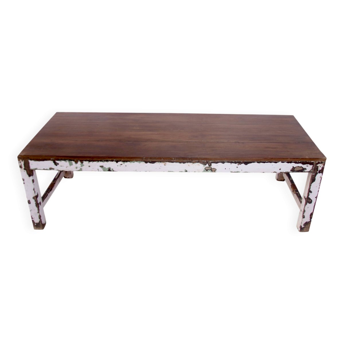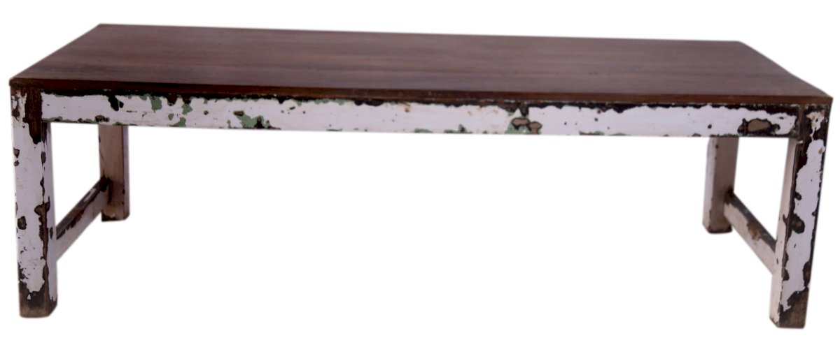 Table basse en teck birman / plateau naturel et piètement avec sa patine blanche - écrue d'origine / 160 x 61 x 45 cm - 25 kg