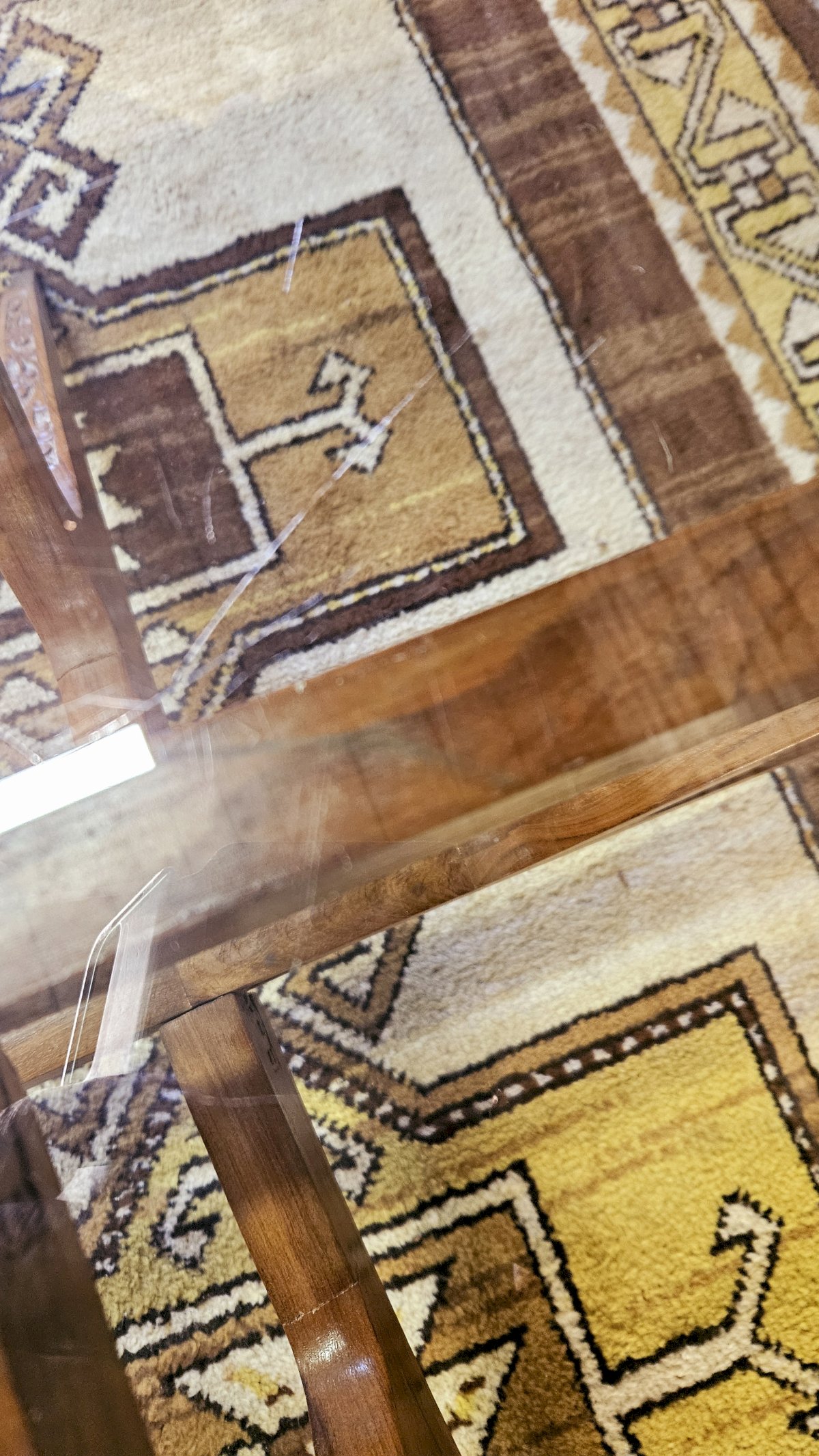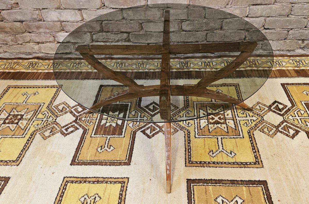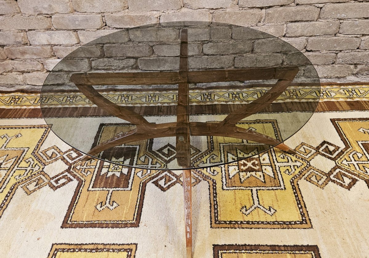 - Plateau en verre fumé offrant une vue dégagée sur la structure en bois.