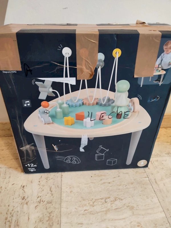 Table d'activite en bois janod en bon etat avec son carton mais usé tres peu utilisé