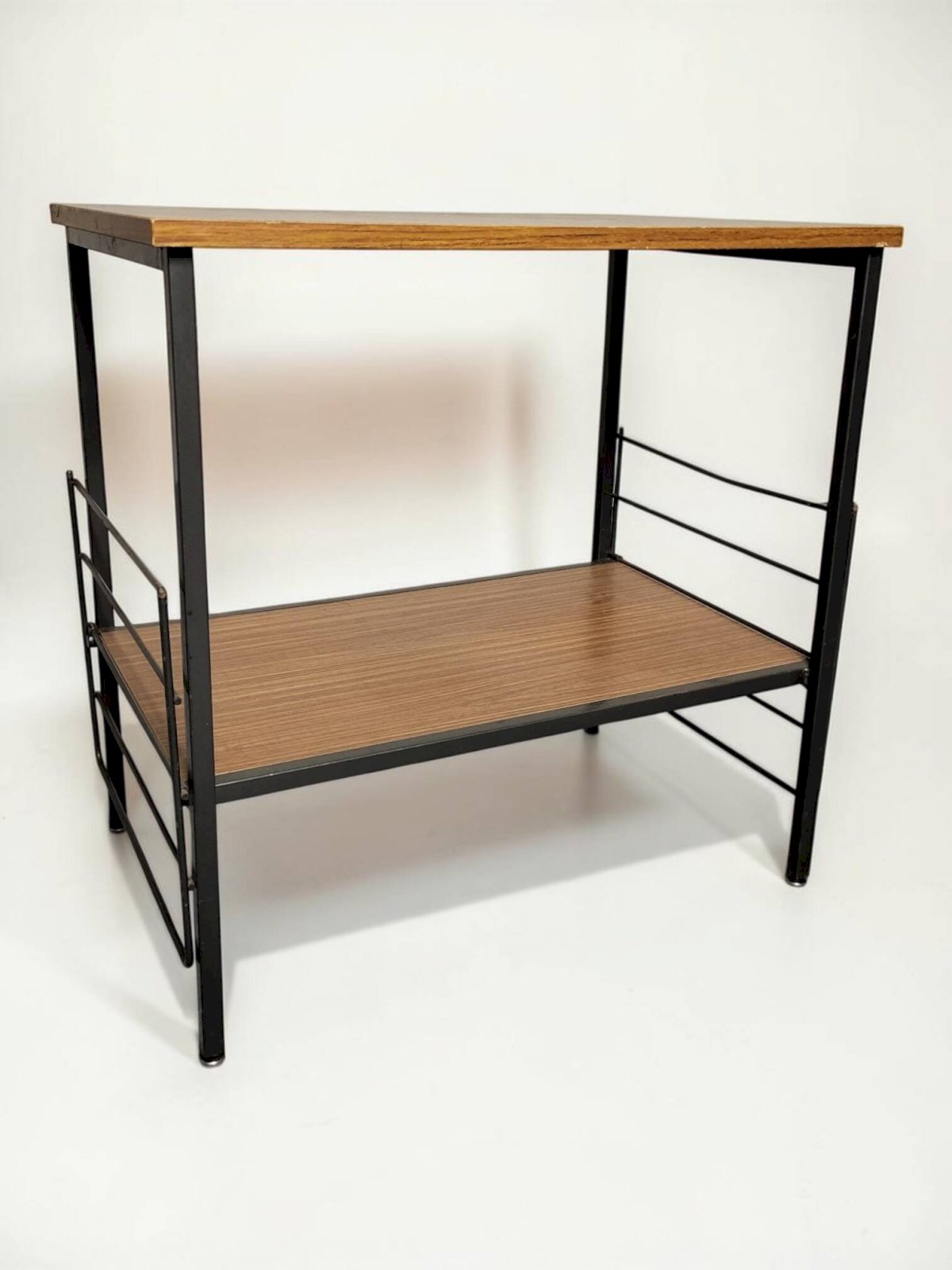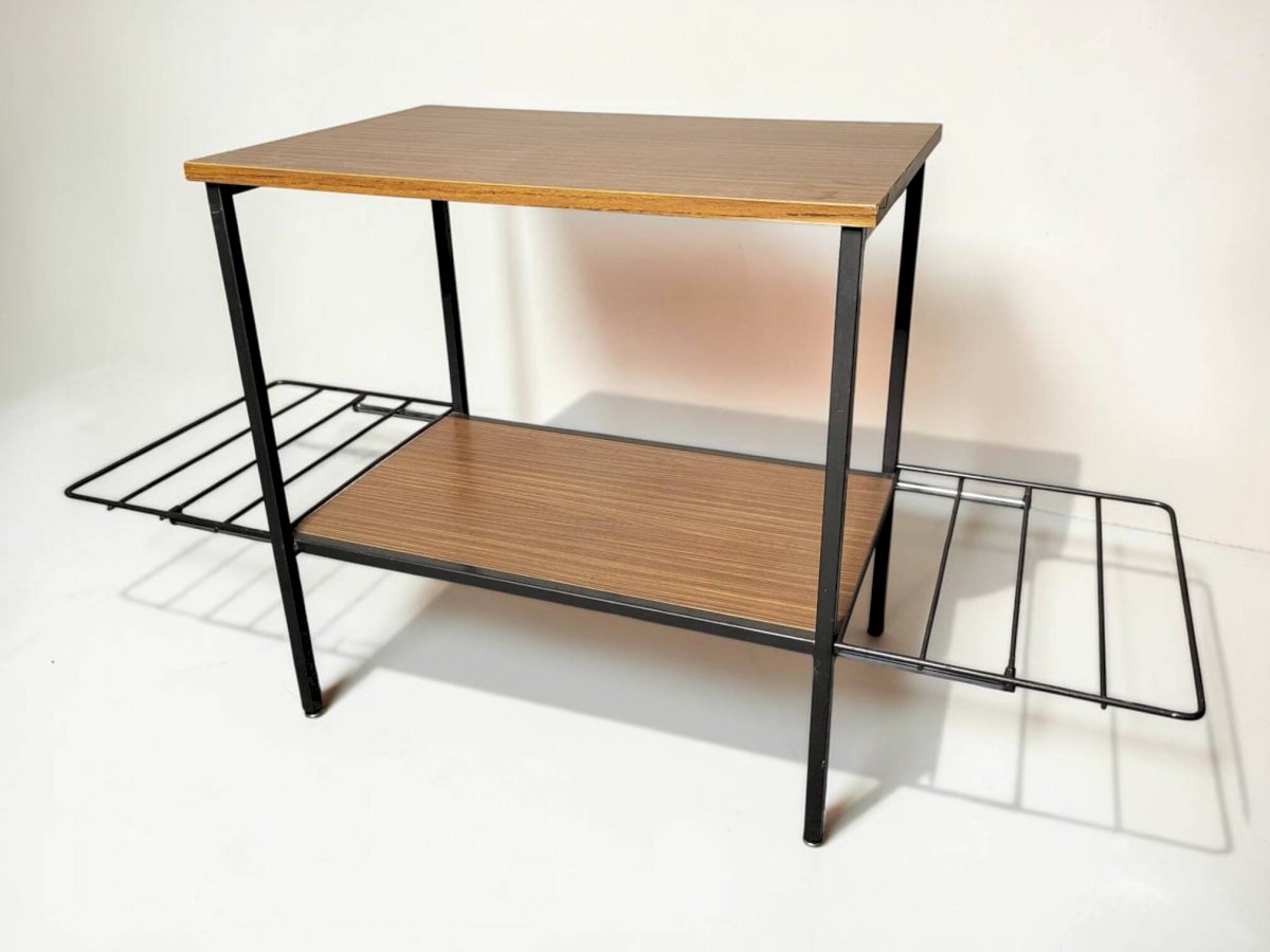 Table d’appoint ou bout de canapé des années 60.Elle comporte deux tablettes en bois stratifié et deux tablettes extensibles en métal.Ces tablettes reposent dans des encoches ce qui assure une bonne stabilité.On notera des traces d’usage sur le plateau supérieur.Dimensions h60 X l60 X p40.