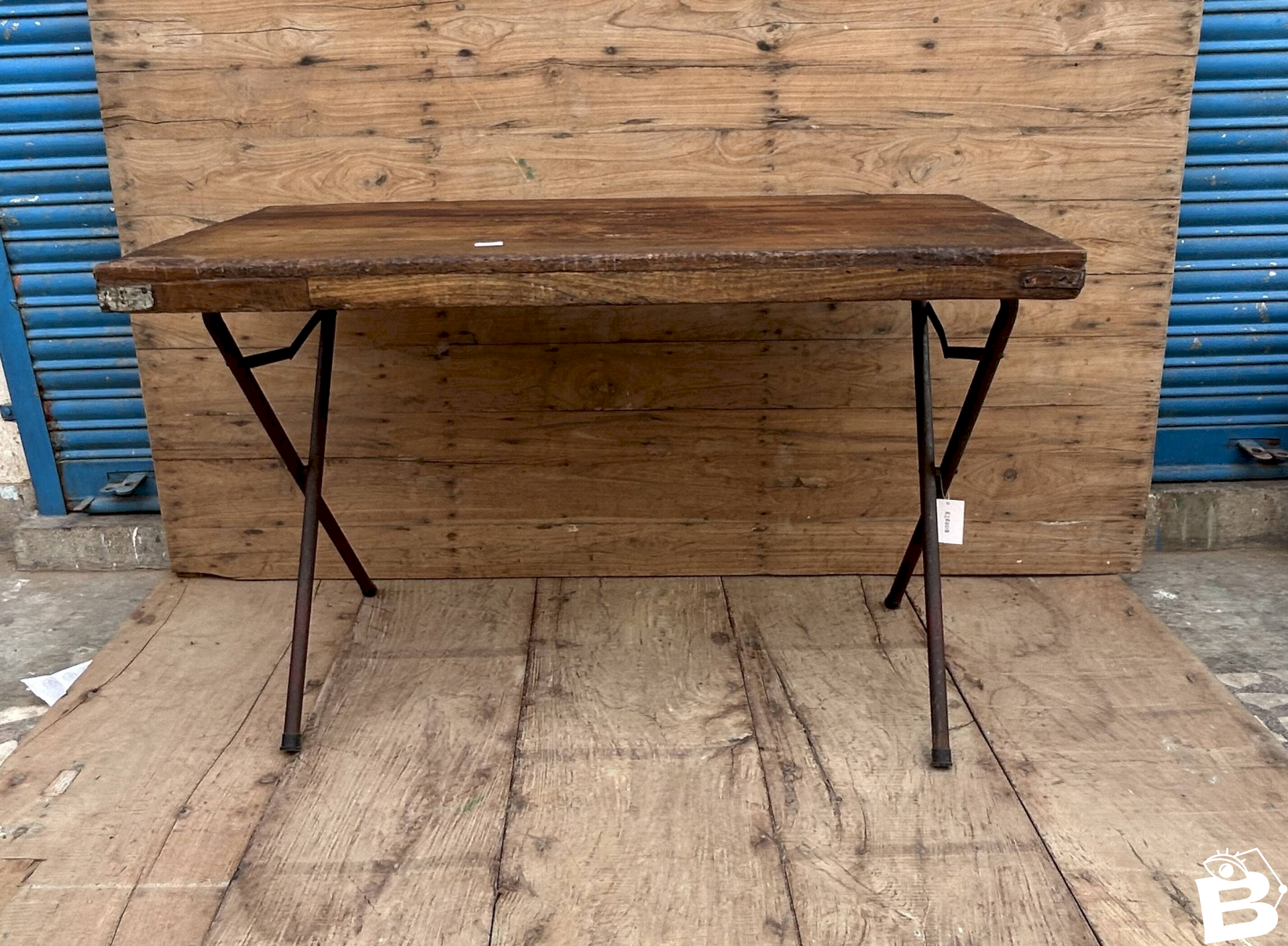 Table d'atelier pliante structure métal avec plateau en teck massif / 122 x 58 x 74 cm - 23 kg - taille plateau 122 x 58 x 8 cm - piètement plié: 107 x 88 x 6 cm / total des 2 colis 125 x 90 x 20 cm